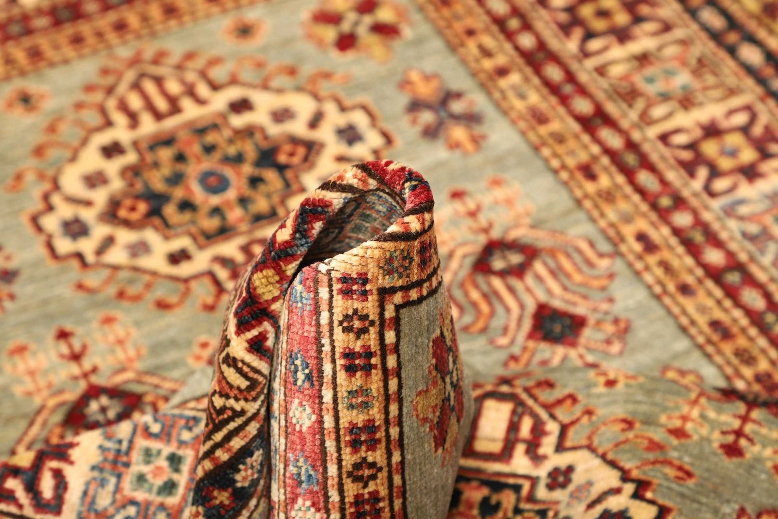 Der Kazak Orientteppich ist aus sorgfältig ausgewählten Materialien gefertigt. Die Verwendung von hochwertigen Wolle sorgt für eine bemerkenswerte Strapazierfähigkeit und einen hohen Komfort. Handgeknüpft, spiegelt dieser Teppich die meisterliche Handwerkskunst wider, die für die traditionellen Teppichkünste charakteristisch ist. Die Knotendichte ist hoch, was nicht nur die Langlebigkeit des Produkts erhöht, sondern auch die farbliche Intensität und Detailtreue der Muster intensiviert.