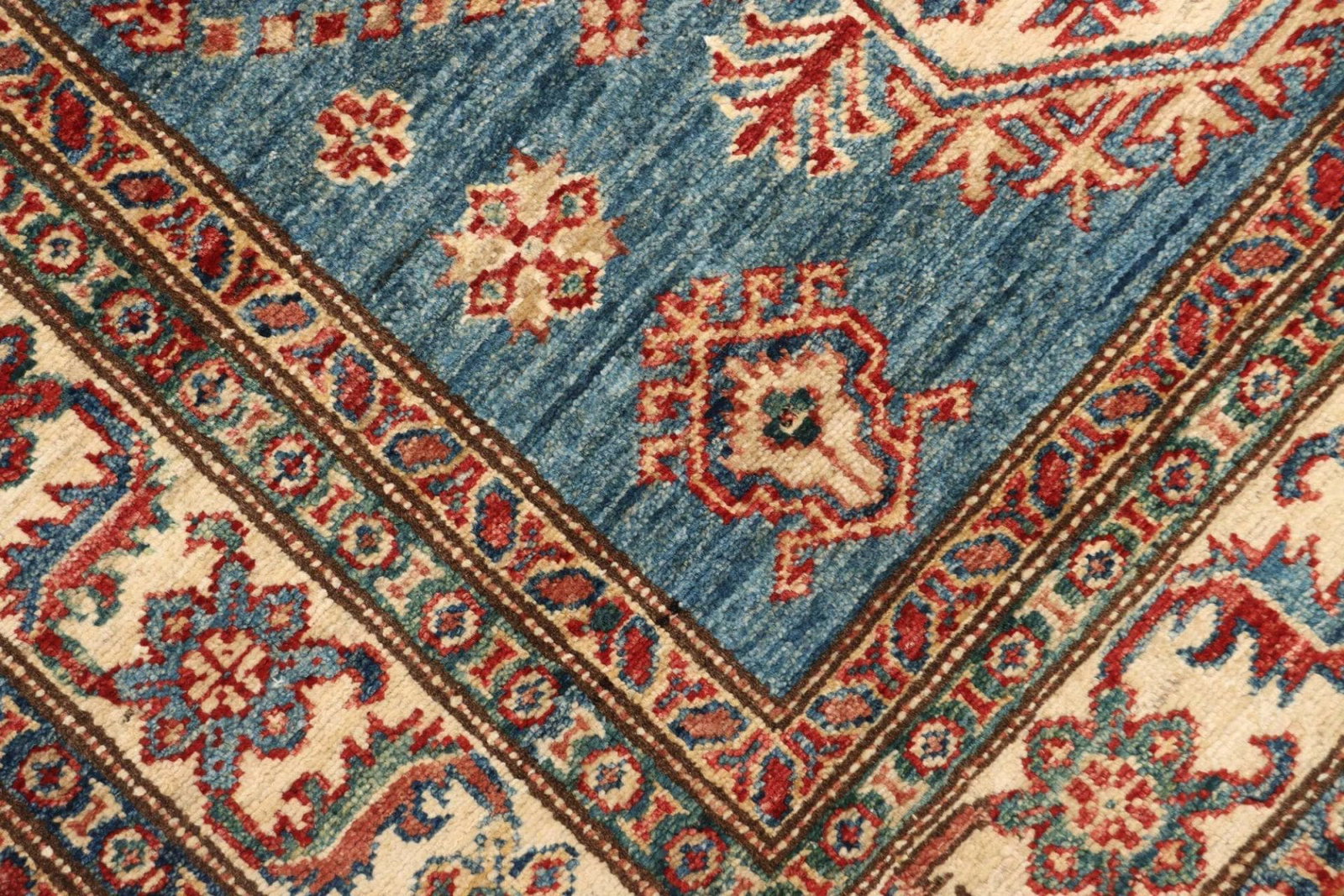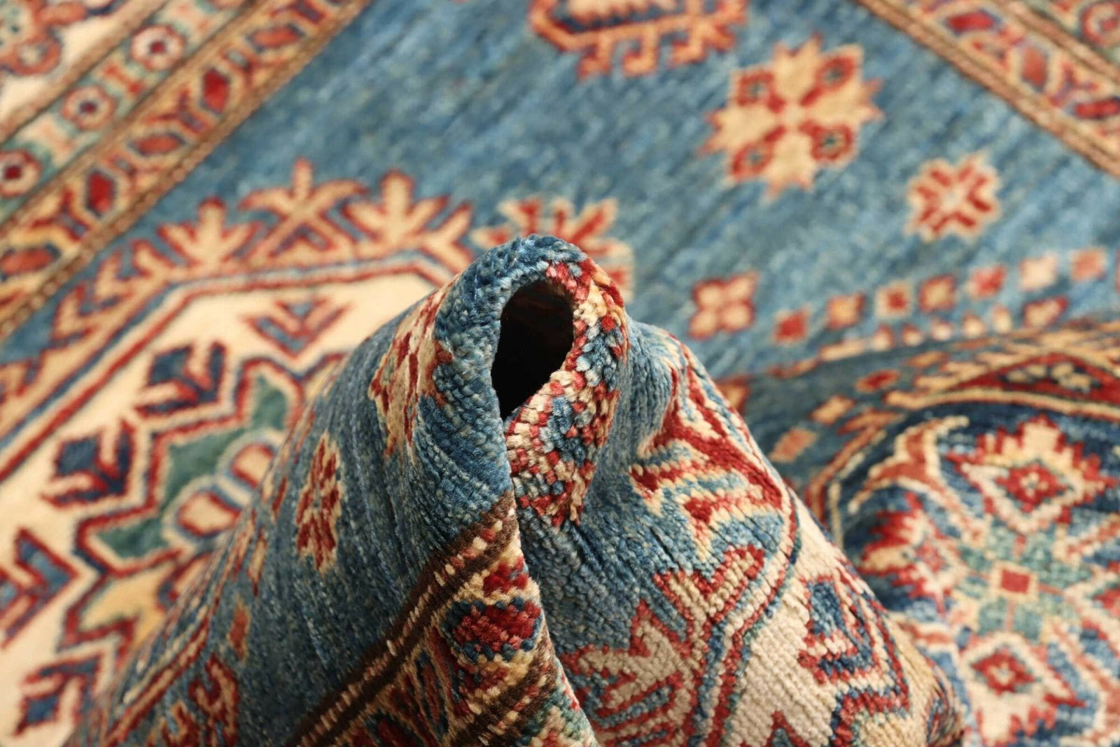 Ein weiterer Pluspunkt dieses Kazak Orientteppichs ist seine spezielle Pflegeleichtigkeit. Die Verwendung von Wolle bedeutet, dass der Teppich schmutzabweisend ist und sich leicht reinigen lässt. Dies macht ihn ideal für Haushalte mit Kindern oder Haustieren. Darüber hinaus sorgt die dicke und weiche Textur dafür, dass der Teppich nicht nur gut aussieht, sondern auch ein sehr angenehmes Gefühl beim Begehen vermittelt.