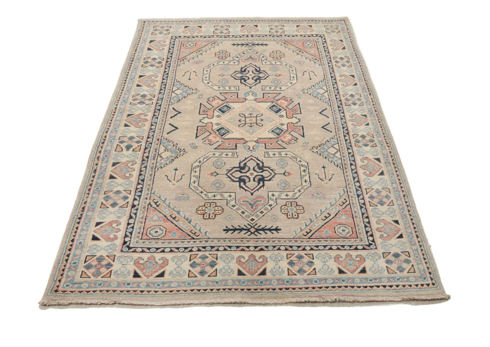 826$Ursprünglicher Preis war: 826$609$Aktueller Preis ist: 609$Kazak Teppich | Knotendichte: ca. 100.000 Knoten/m² | Material: 100% Schurwolle | Größe: 125 x 189 cm | Zustand: Sehr gut | Ursprung: Pakistan | Verarbeitung: Handgeknüpft | Geometrische Muster und Figuren