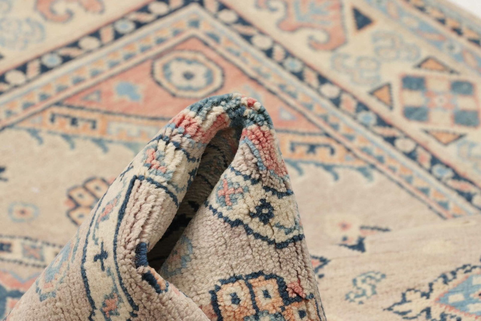 Der Kazak Orientteppich ist handgeknüpft, was ihm den typischen Charme und die hohe Qualität verleiht, die mit handgefertigten Teppichen assoziiert wird. Diese Technik erfordert viel Geschick und Zeit, und das Endresultat ist ein Unikat, das sowohl zeitlos schön als auch extrem langlebig ist. Die Knotendichte sorgt dafür, dass der Teppich nicht nur robust, sondern auch widerstandsfähig gegenüber Verschleiß ist.