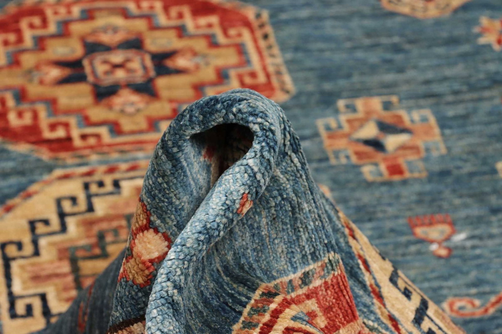 Der Kazak Orientteppich wird aus hochwertigen Materialien hergestellt, die für ihre Langlebigkeit und Strapazierfähigkeit bekannt sind. Die Wahl der Wolle sorgt dafür, dass der Teppich nicht nur weich und angenehm zu begehen ist, sondern auch eine ausgezeichnete Wärmeisolierung bietet. Diese Eigenschaften machen den Teppich ideal für Wohnräume, Flure oder auch Büros. Durch die geschickte Verarbeitung und die sorgfältige Knotentechnik wird jede einzelne Faser zu einem kunstvollen Gesamtwerk verarbeitet. Die Knotendichte des Teppichs ist hoch, was die Haltbarkeit und die Detailgenauigkeit des Musters noch verstärkt.