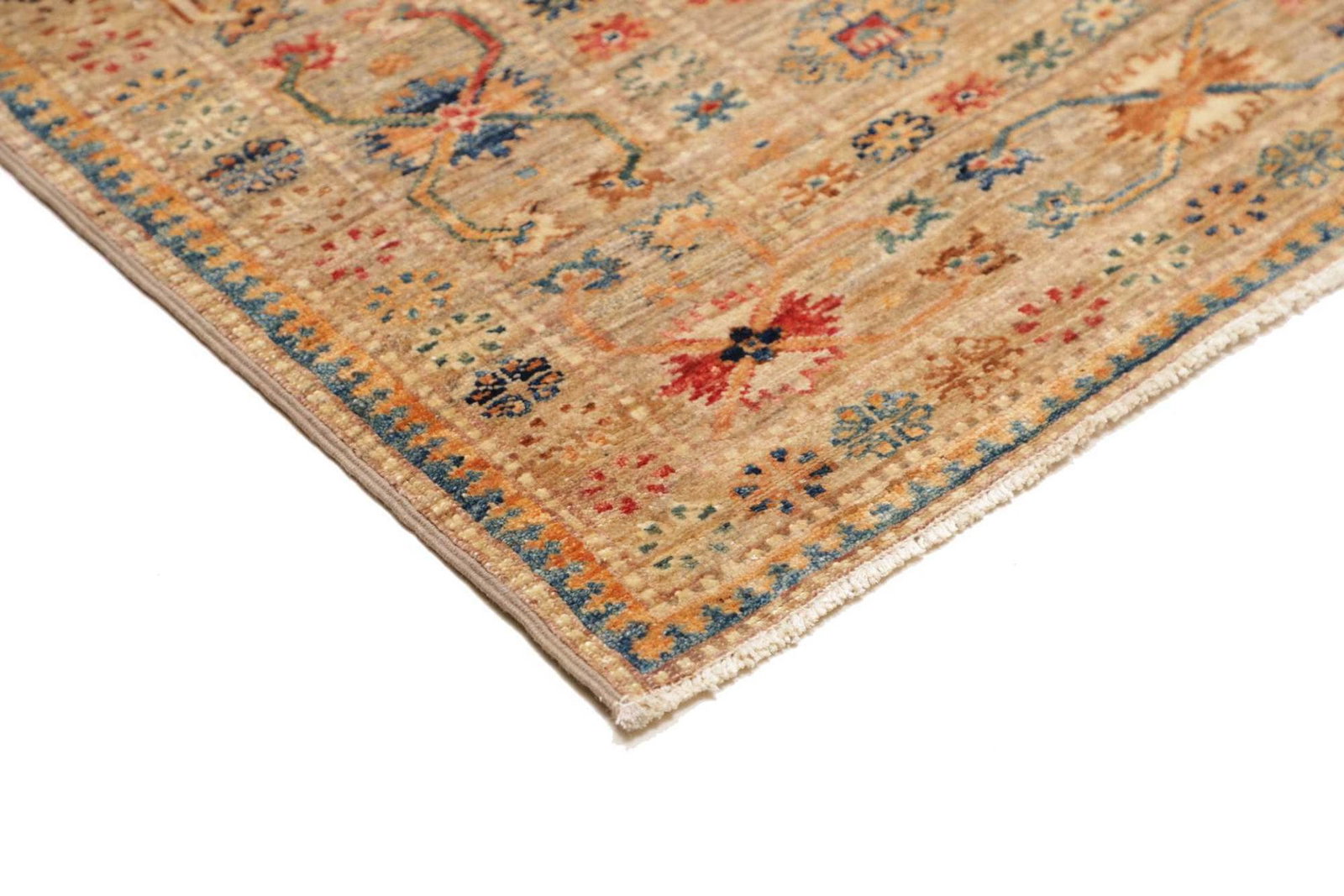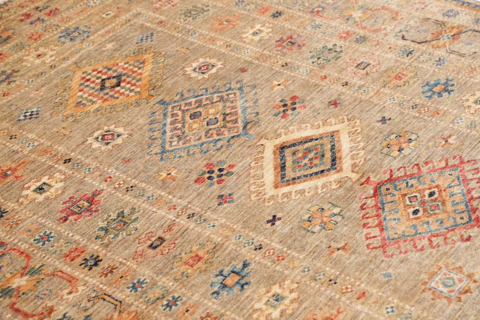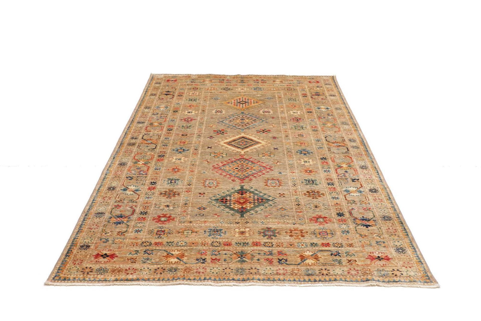 Dieser Kazak Orientteppich ist aus robusten und langlebigen Materialien gefertigt. Die Wolle, die für die Herstellung verwendet wird, sorgt für eine angenehme Haptik und eine hohe Strapazierfähigkeit. Die Knotendichte ist ein entscheidender Faktor für die Qualität eines Teppichs, und bei diesem Modell ist die Knotendichte so gewählt, dass sowohl die Strapazierfähigkeit als auch die Detailtreue des Musters optimiert sind. Jedes Knotenelement wurde sorgfältig und mit großer Präzision angebracht, was den Teppich zu einem langlebigen Begleiter macht.