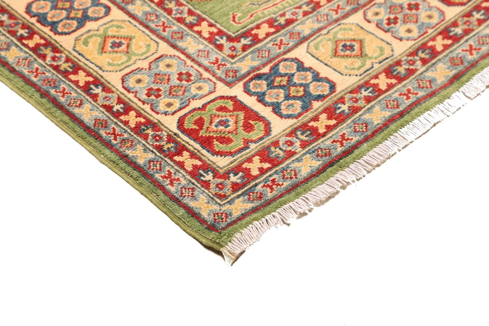 Der Kazak Orientteppich ist aus hochwertigen Naturfasern gefertigt, die für ihre Langlebigkeit und Schönheit bekannt sind. Die verwendete Wolle sorgt für eine angenehme Textur und sorgt dafür, dass der Teppich sowohl bequem als auch strapazierfähig ist. Dank der handgeknüpften Technik hat der Teppich eine hohe Knotendichte, die für seine Robustheit und Strapazierfähigkeit sorgt. Dies bedeutet, dass er auch in stark frequentierten Bereichen des Wohnraums eine lange Lebensdauer hat.
