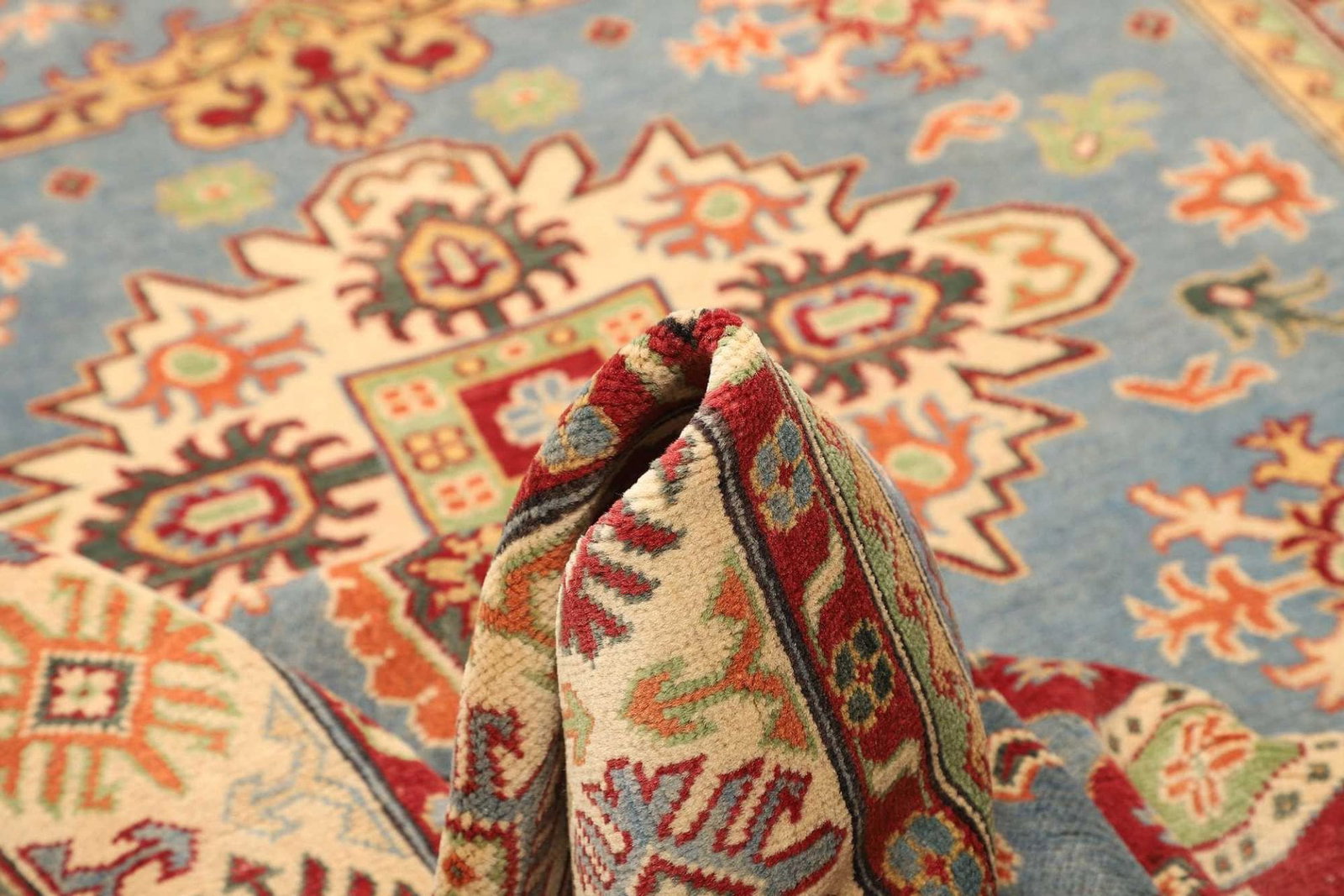 Ein hochwertiger Orientteppich, wie unser Kazak Teppich, lässt sich an der Knotendichte, dem Material und der Verarbeitung erkennen. Dicht geknüpfte Teppiche sind in der Regel langlebiger und widerstandsfähiger. Zudem sind die verwendeten Farben oft natürlichen Ursprungs, was die Qualität deutlich erhöht.