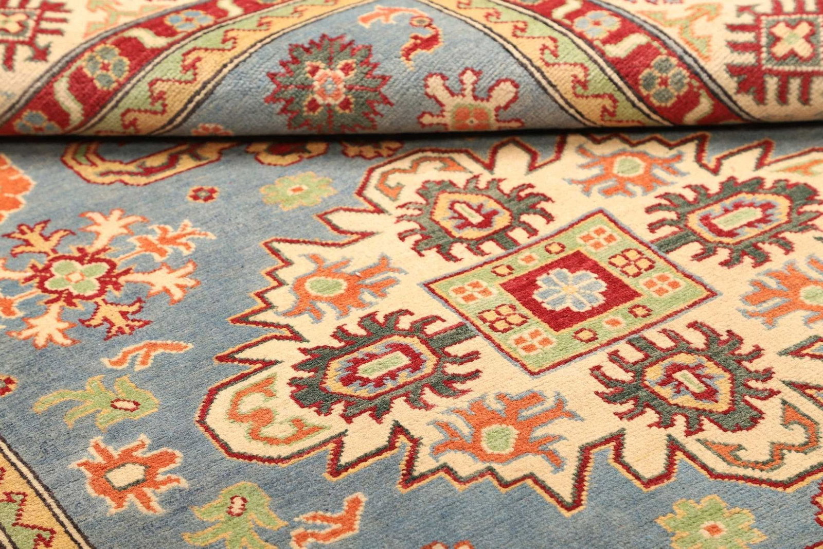 Die Verarbeitung dieses Kazak Orientteppichs erfolgt aus hochwertigen, naturbelassenen Materialien, die für ihren Komfort und ihre Strapazierfähigkeit bekannt sind. Der Teppich besteht aus reiner Wolle, die nicht nur weich und angenehm unter den Füßen ist, sondern auch exzellente Isoliereigenschaften bietet. Durch die Verwendung von Wolle zeigt der Teppich zudem eine natürliche Fähigkeit, Schmutz abzuwehren und ist einfach zu reinigen. Die handgeknüpfte Technik sorgt dafür, dass jeder Teppich ein Unikat darstellt und mit viel Liebe und Sorgfalt hergestellt wurde.
