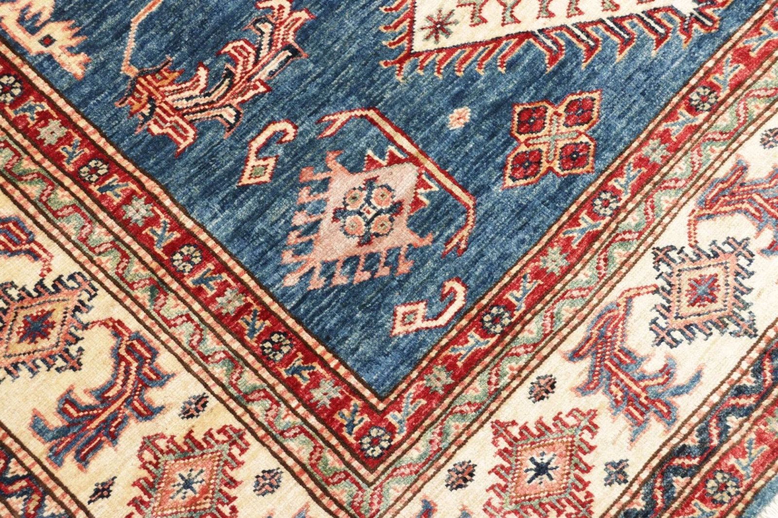 Die Knotendichte des Teppichs ist ein weiterer Beweis für die Qualität und Sorgfalt, die in seine Herstellung geflossen sind. Handgeknüpfte Teppiche haben in der Regel eine höhere Knotendichte als maschinell hergestellte Varianten, was ihnen ein luxuriöses Aussehen und eine besondere Strapazierfähigkeit verleiht. Dieser Kazak Teppich befindet sich in ausgezeichnetem Zustand und wird auch anspruchsvollere Käufer überzeugen.