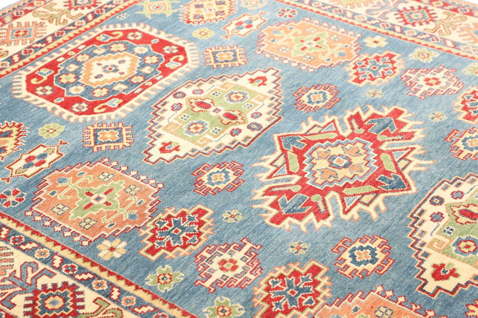 Der Kazak Orientteppich mit seinem geometrischen Muster ist eine Hommage an die traditionellen Designelemente, die für die Teppichkunst des Kaukasus charakteristisch sind. Die Verwendung von geometrischen Formen und dekorativen Motiven verleiht dem Teppich einen modernen, gleichzeitig aber auch zeitlosen Look. Diese Teppiche sind oft in kräftigen Farben wie Rot, Blau, und Gelb gehalten, die zusammen mit den geometrischen Mustern lebendige Akzente in jedem Raum setzen.