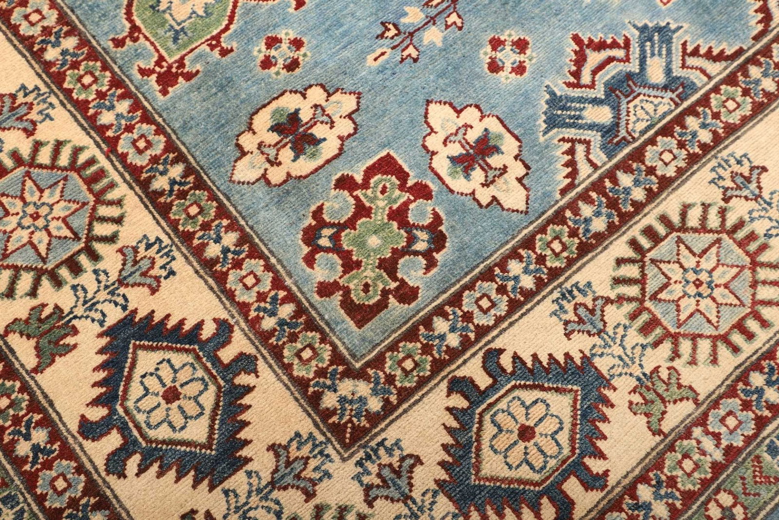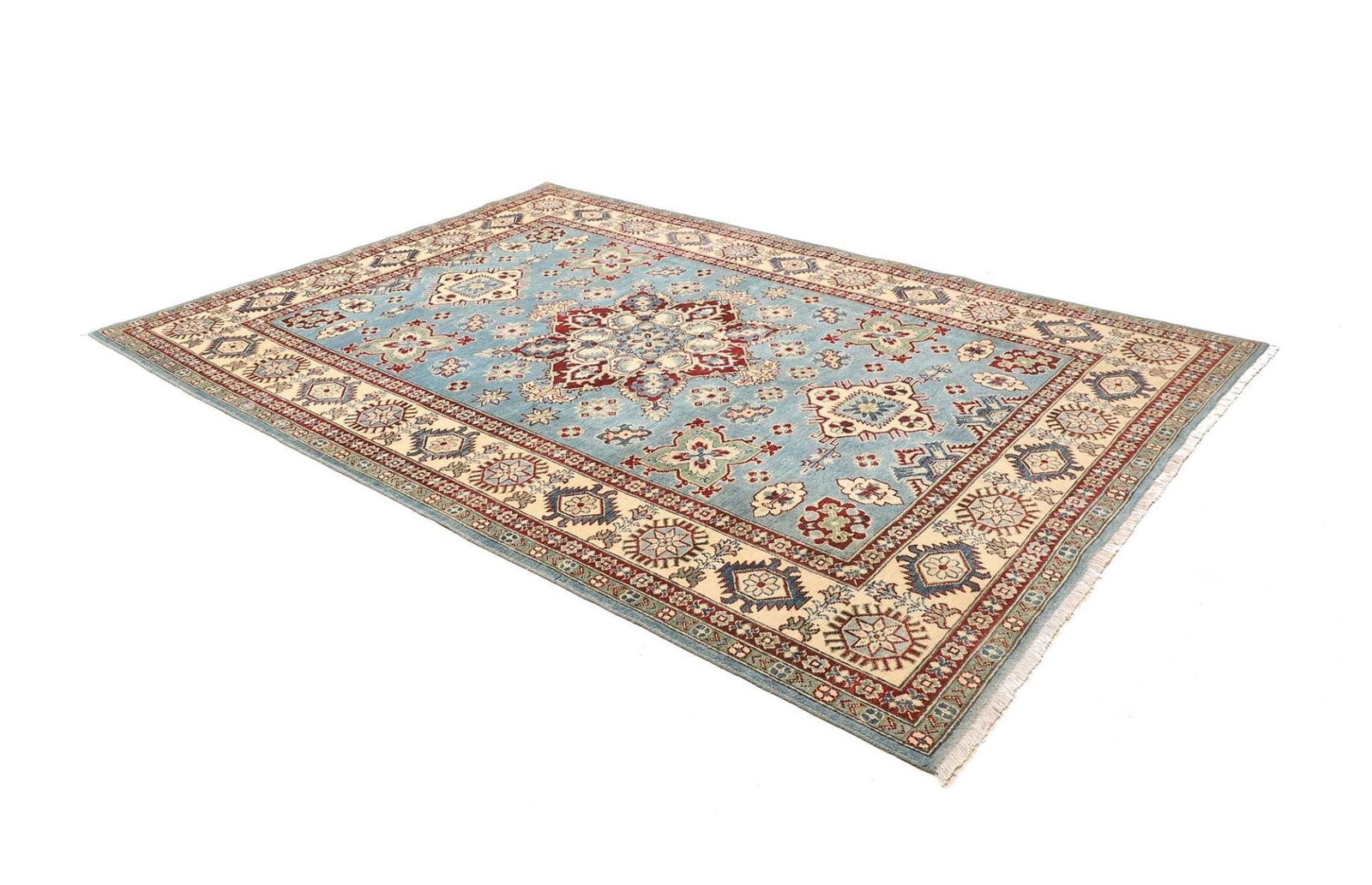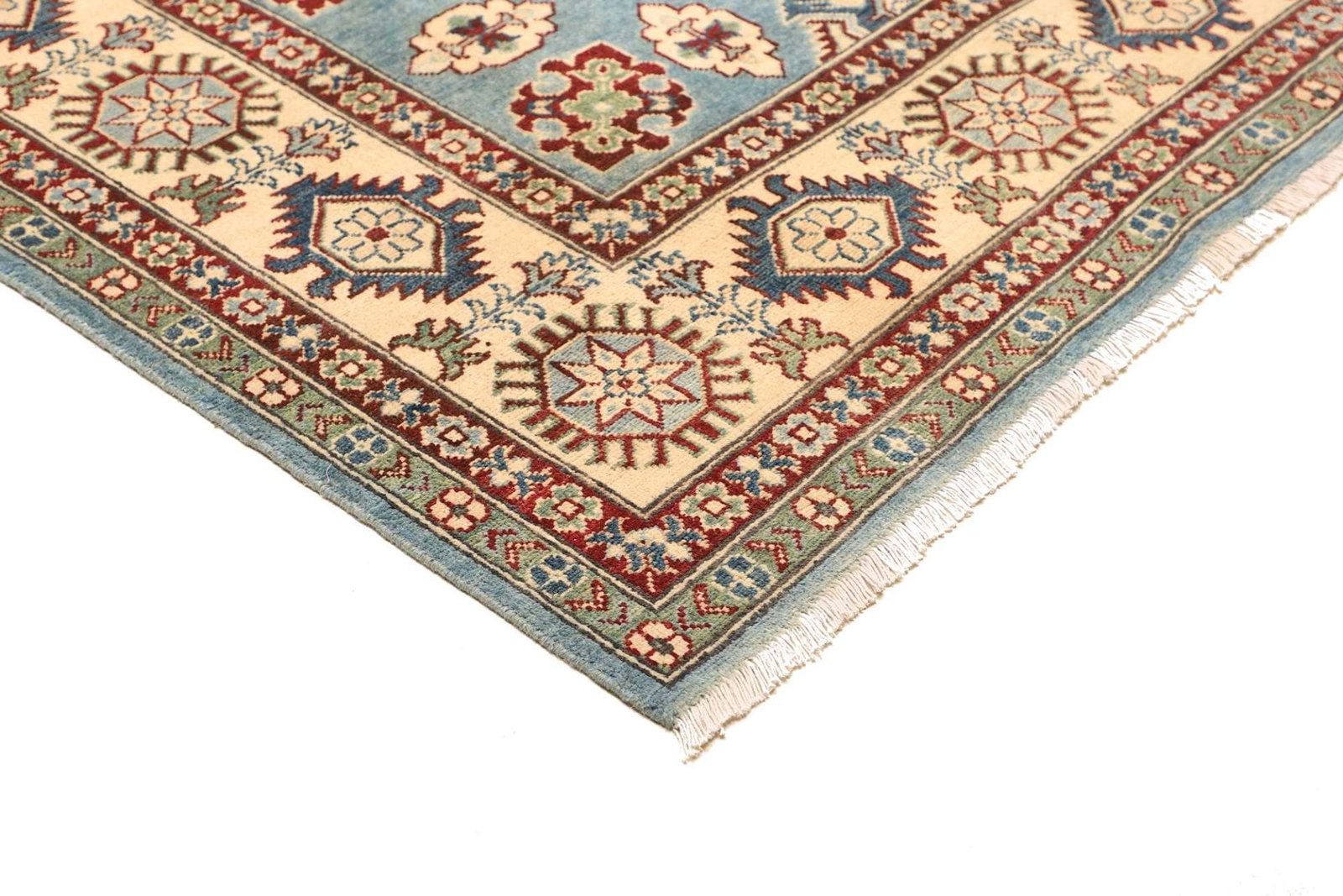 Kazak Teppich | Knotendichte: ca. 100.000 Knoten/m² | Material: 100% Schurwolle und 100% Baumwolle | Größe: 200 x 287 cm | Zustand: Handgeknüpft | Herkunft: Pakistan | Muster: Geometrisch, typisch für Kazak Teppiche