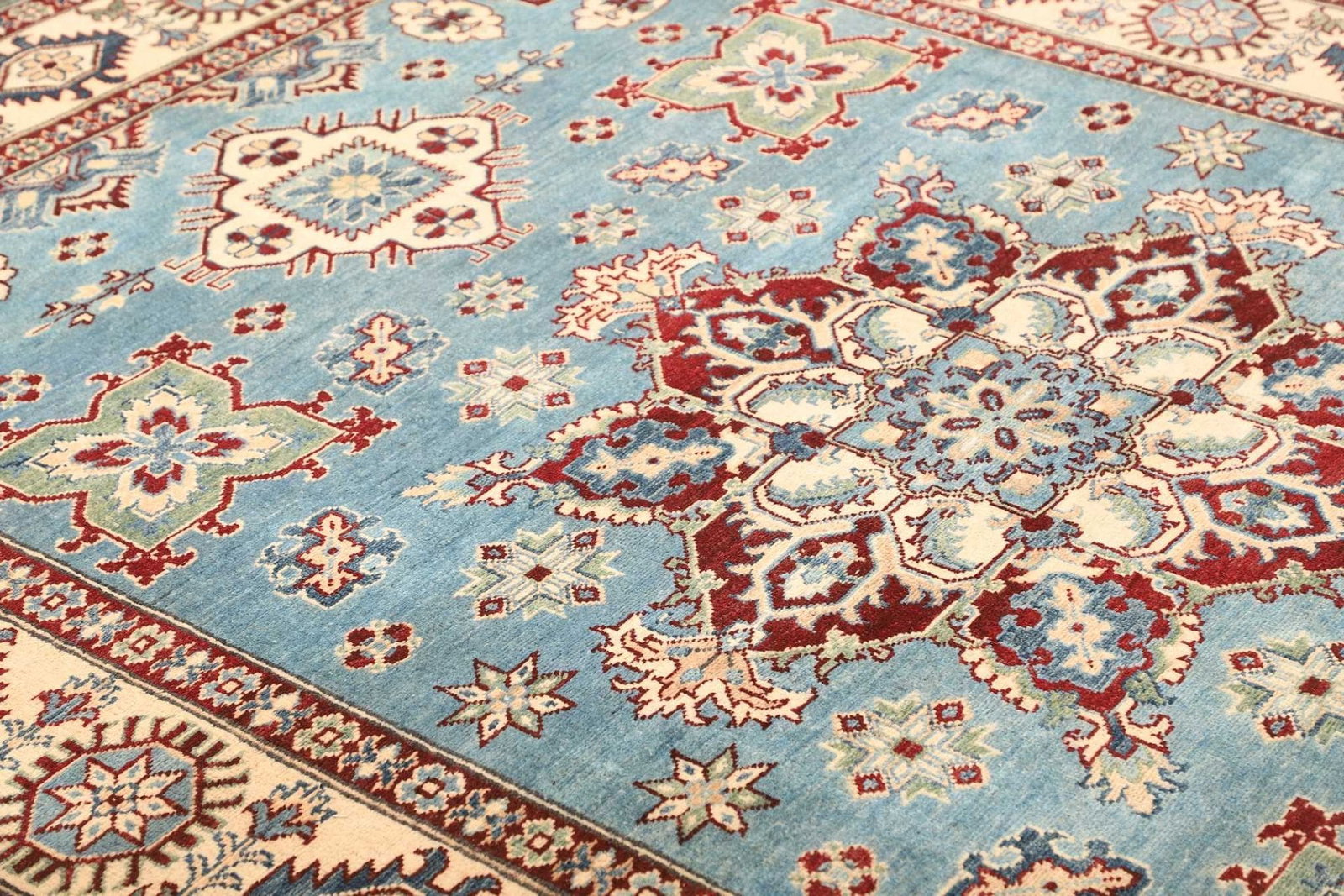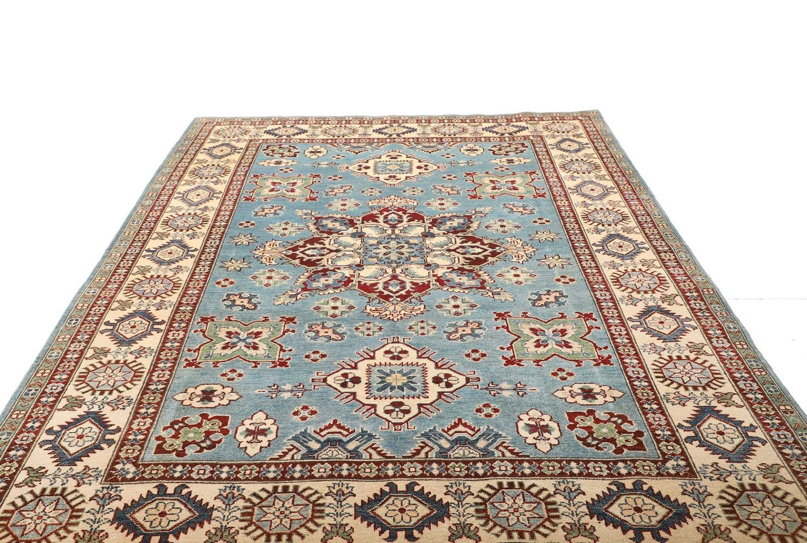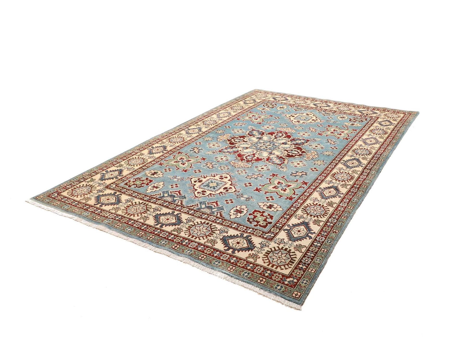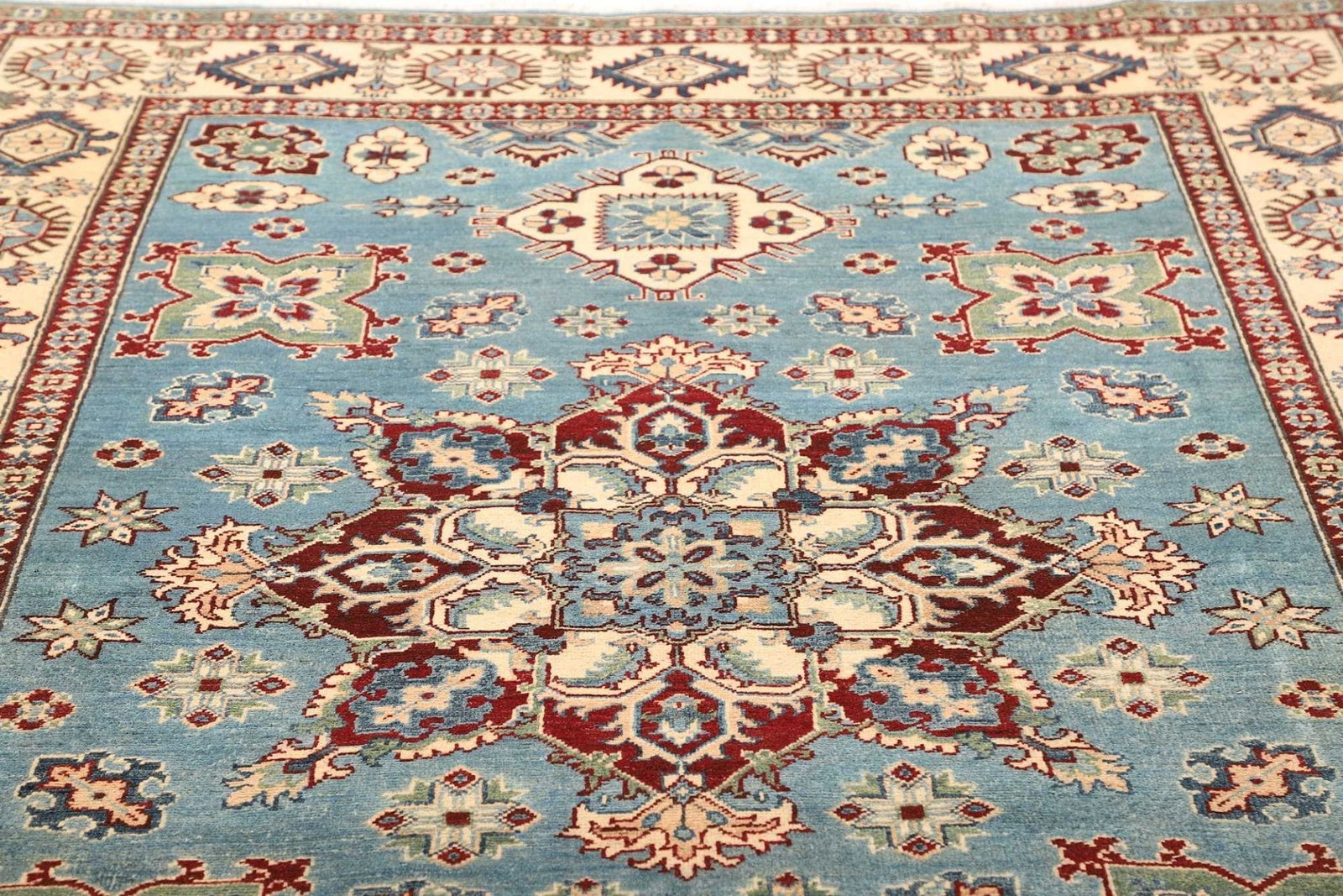 Kazak Teppich | Knotendichte: ca. 100.000 Knoten/m² | Material: 100% Schurwolle und 100% Baumwolle | Größe: 200 x 287 cm | Zustand: Handgeknüpft | Herkunft: Pakistan | Muster: Geometrisch, typisch für Kazak Teppiche