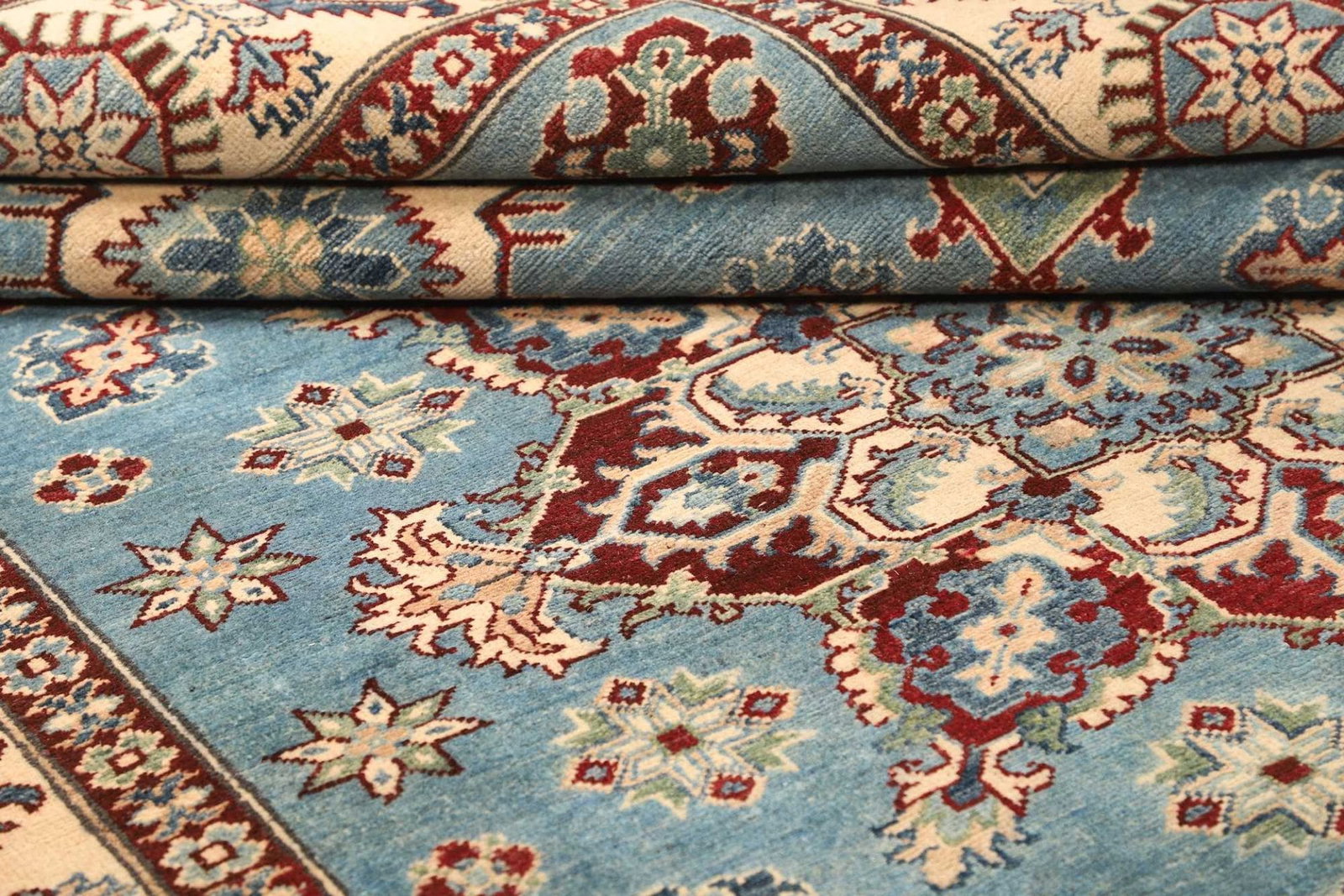 Die hohe Knotendichte dieses Teppichs zeugt von hervorragender Handwerkskunst und Sorgfalt, die in jeden einzelnen Knoten eingeflossen ist. Diese Technik sorgt nicht nur für eine ansprechende Optik, sondern auch für die Langlebigkeit des Teppichs. Der Kazak Orientteppich ist ideal für stark frequentierte Bereiche und behält dennoch seine Schönheit über viele Jahre hinweg.