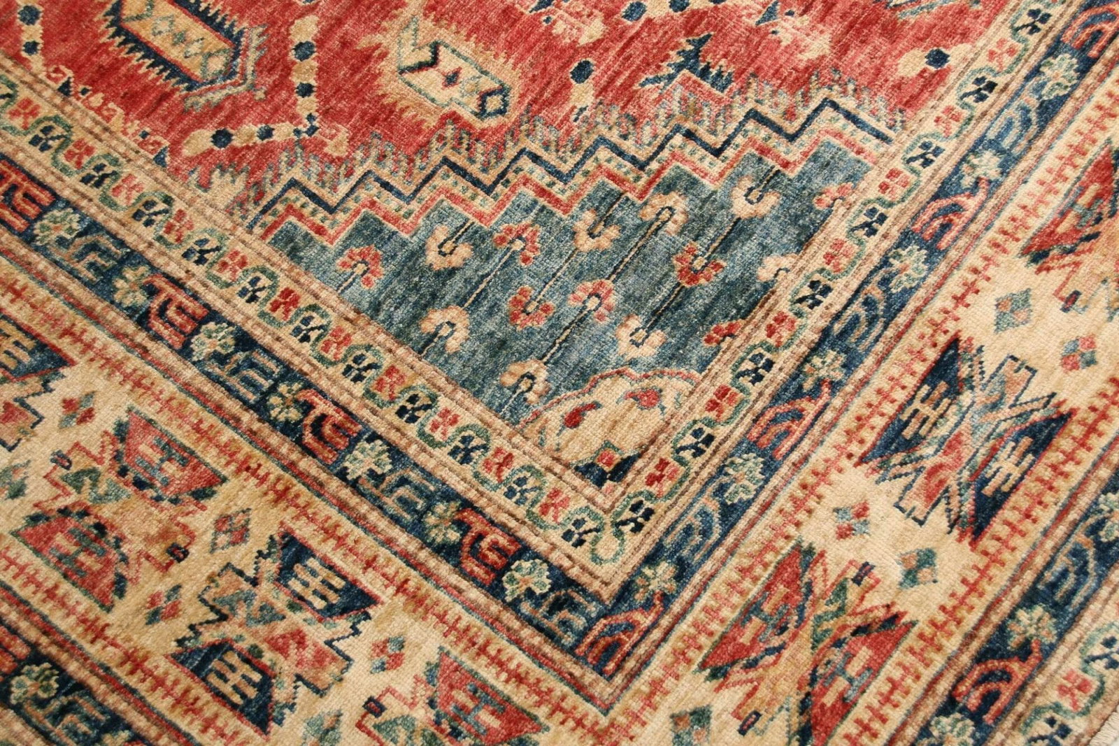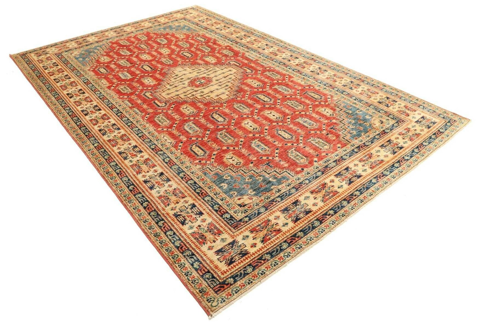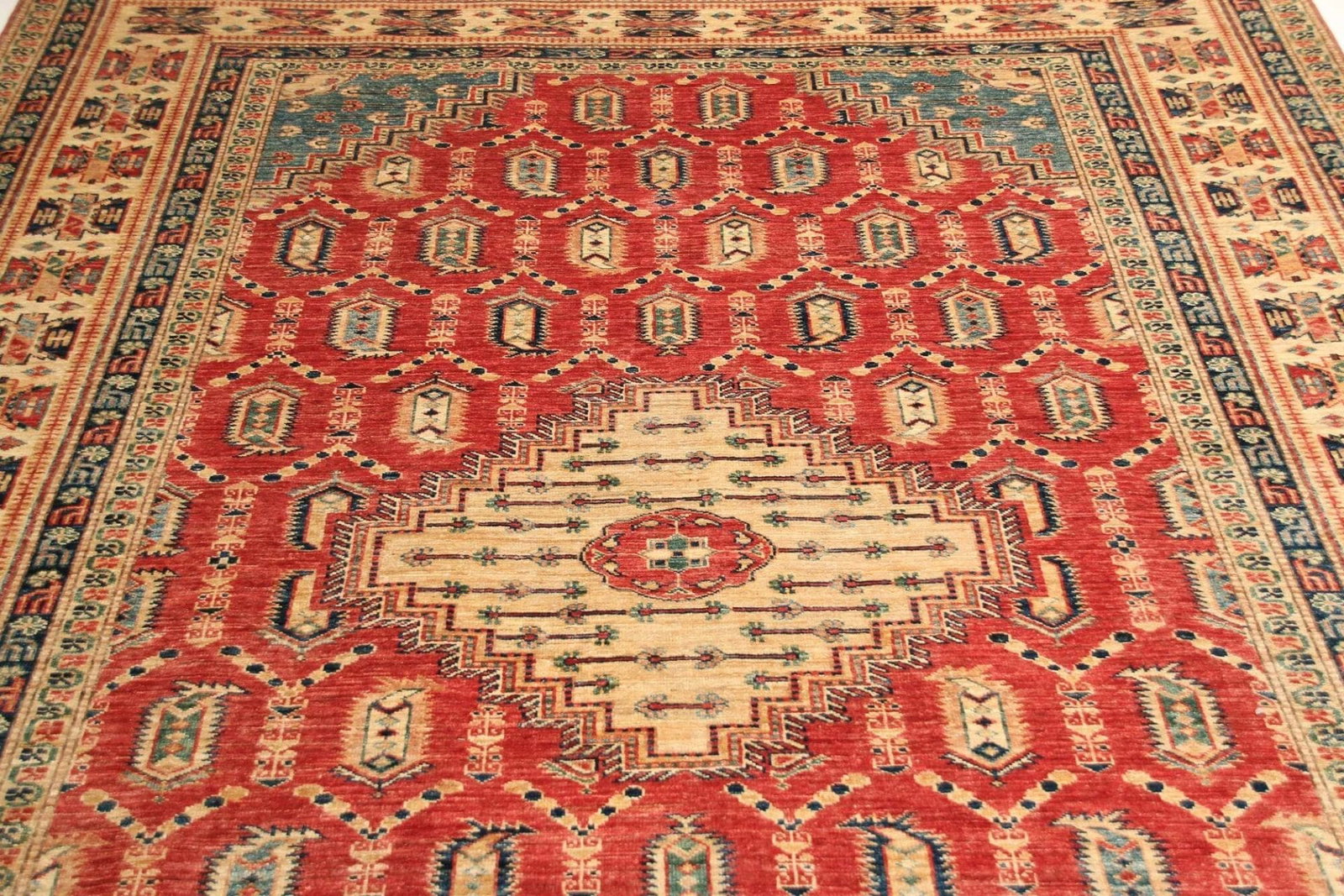 Kazak Teppich | Knotendichte: ca. 200.000 Knoten/m² | Material: 100% Schurwolle | Größe: 207 x 308 cm | Zustand: Handgeknüpft | Herkunft: Pakistan | Muster: Geometrisch und figural