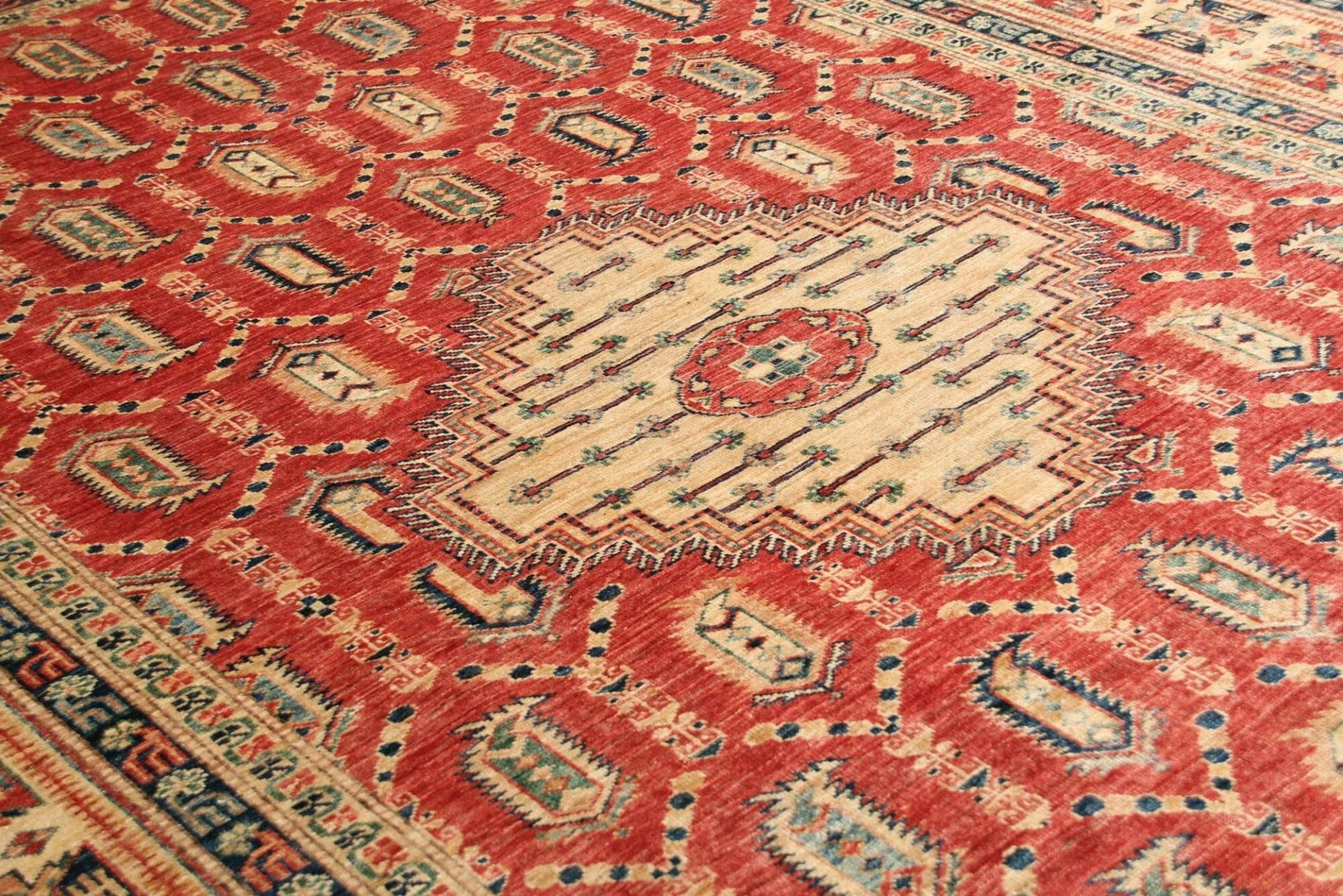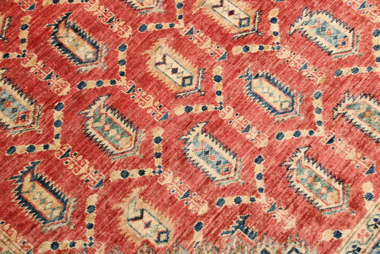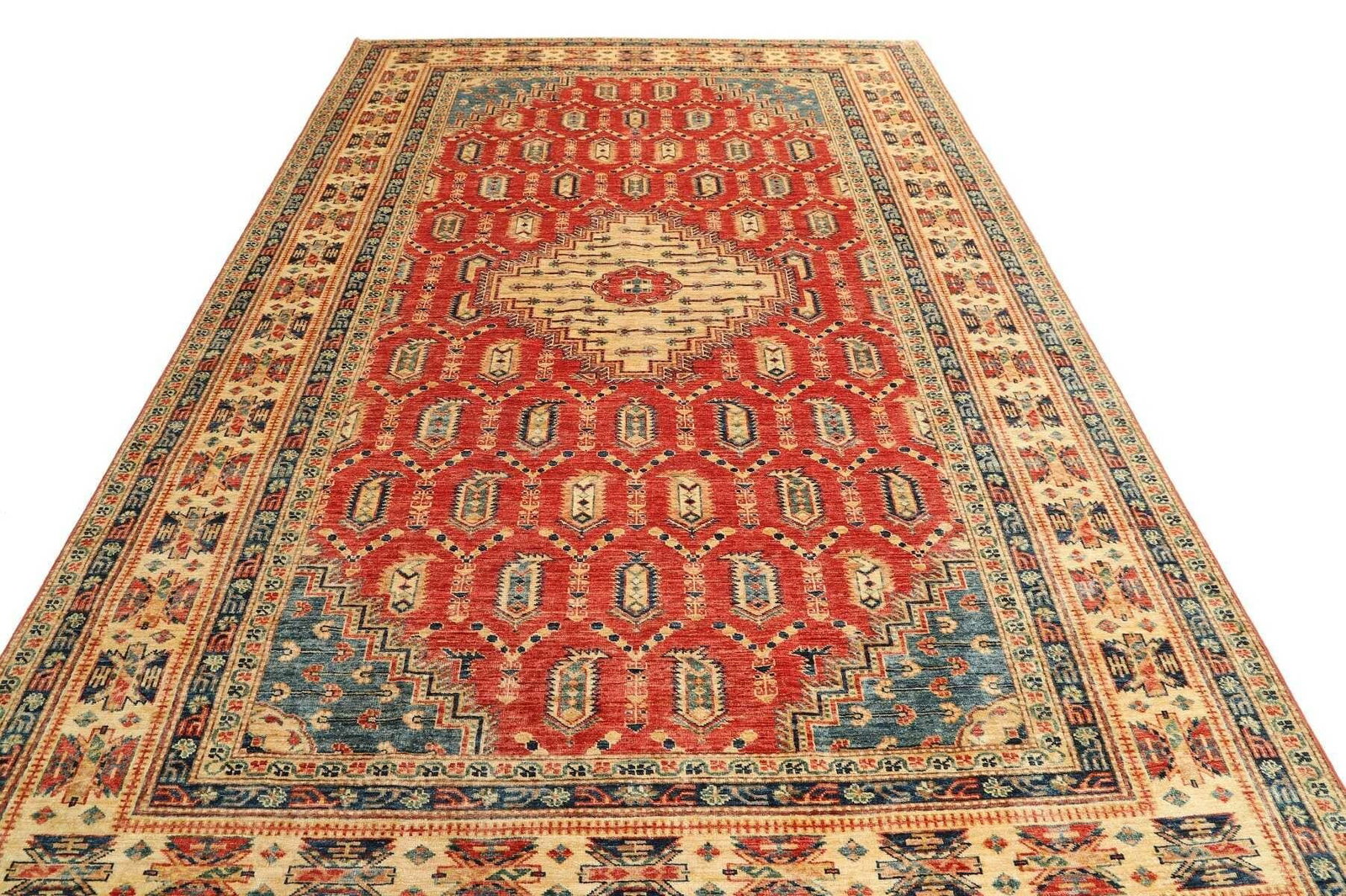 Kazak Teppich | Knotendichte: ca. 200.000 Knoten/m² | Material: 100% Schurwolle | Größe: 207 x 308 cm | Zustand: Handgeknüpft | Herkunft: Pakistan | Muster: Geometrisch und figural
