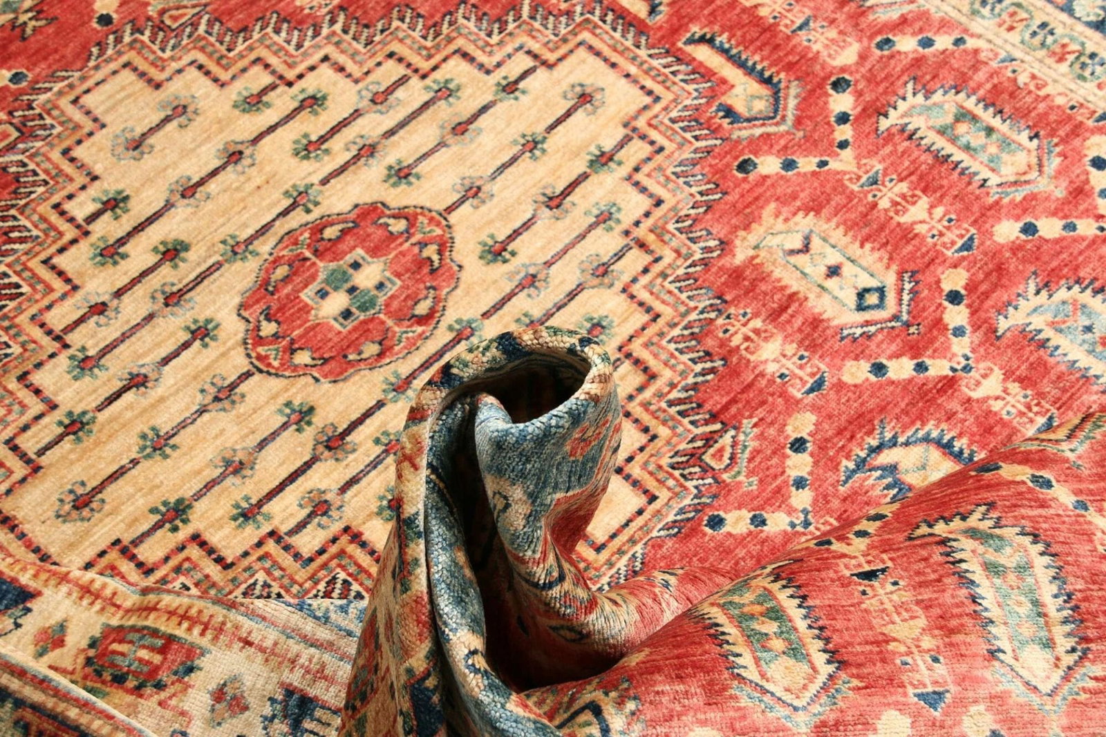 Die Wahl der Schurwolle als Material verleiht dem Teppich nicht nur eine angenehme Weichheit, sondern macht ihn auch besonders widerstandsfähig und pflegeleicht. Schurwolle gilt als eines der besten Materialien für Teppiche, da sie sowohl isolierend als auch atmungsaktiv ist. Diese Eigenschaften tragen dazu bei, dass der Kazak Orientteppich sowohl im Sommer als auch im Winter ein behagliches Raumklima schafft.