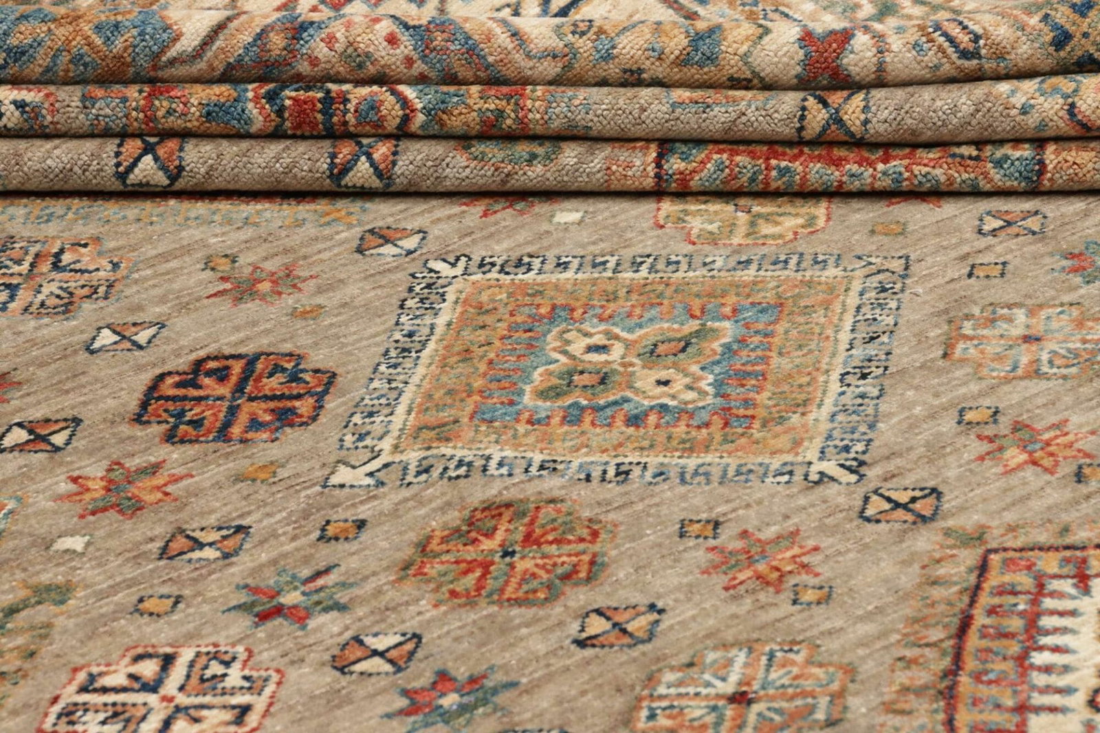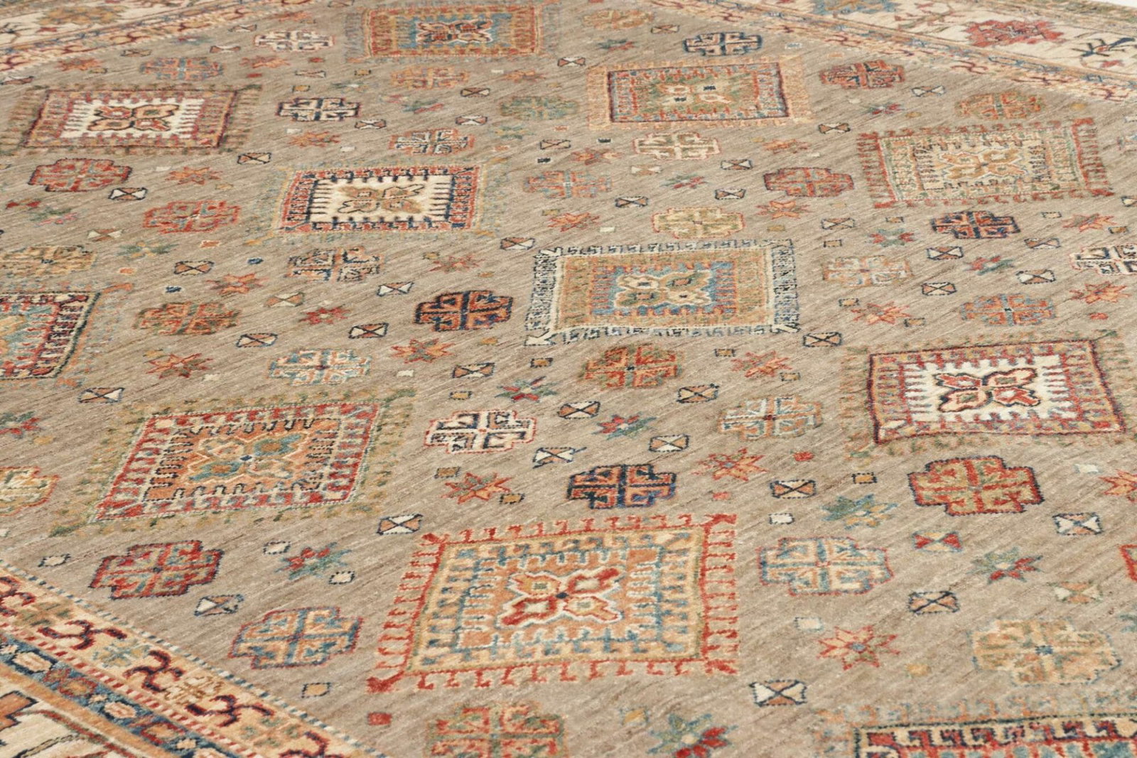 Die Verwendung von 100% Schurwolle ist ein wesentliches Merkmal, das den Kazak Orientteppich auszeichnet. Schurwolle ist nicht nur extrem robust und langlebig, sondern sorgt auch für eine angenehme Haptik und hervorragende Isolierung. Die handgeknüpfte Herstellungsweise verleiht dem Teppich zudem eine hohe Knotendichte, was das Design besonders widerstandsfähig gegen Abnutzung macht. Jeder einzelne Knoten wird mit Sorgfalt und Leidenschaft gesetzt, was die Qualität und Langlebigkeit dieses Stücks unterstreicht.