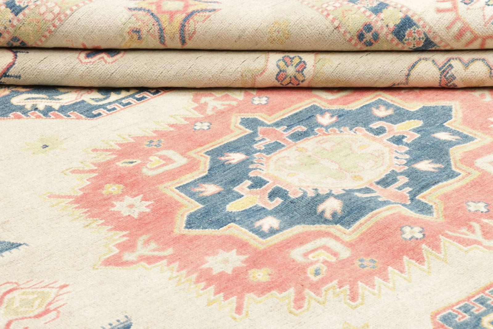 Der Kazak Orientteppich ist aus hochwertigen Materialien gefertigt, die für ihre Langlebigkeit und Robustheit bekannt sind. Die natürlichen Fasern bieten nicht nur eine angenehme Haptik, sondern auch eine bemerkenswerte Farbtiefe, die im Laufe der Zeit noch intensiver wird. Die handgeknüpfte Technik garantiert, dass jeder Teppich ein Unikat ist und mit Liebe zum Detail entsteht. Diese traditionelle Methode sorgt dafür, dass der Teppich sowohl ästhetisch überzeugt als auch höchsten Ansprüchen an Qualität und Haltbarkeit genügt.