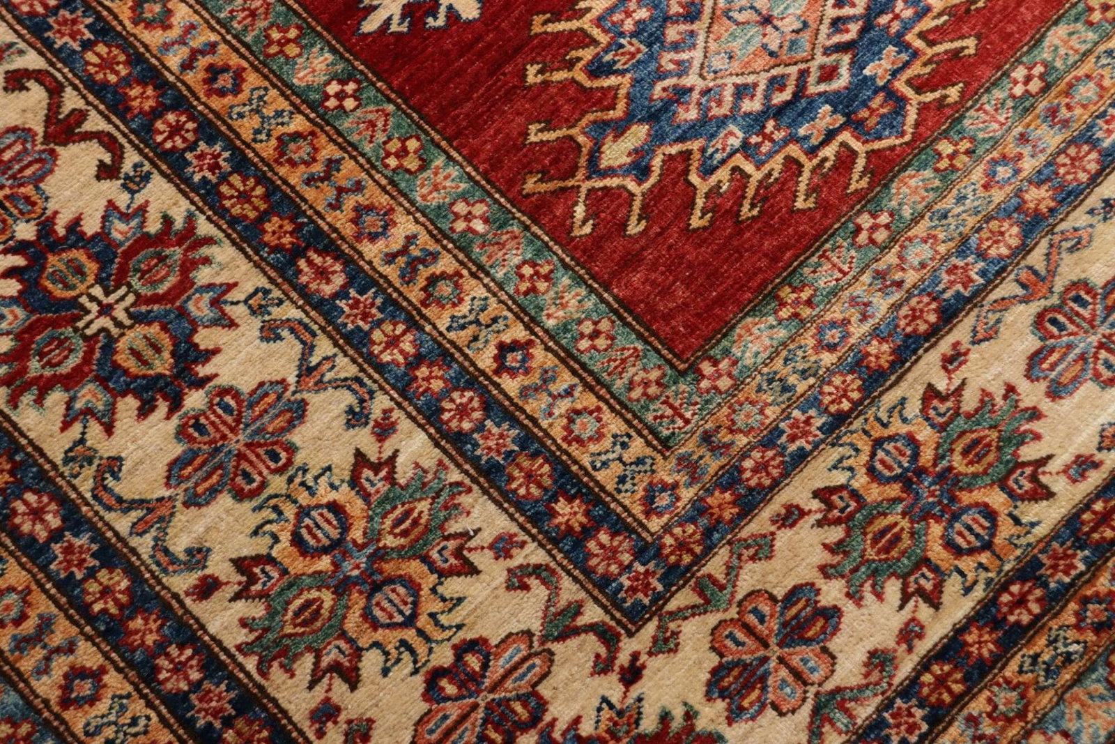 Dieser Kazak Orientteppich zeichnet sich durch seine sorgfältige Herstellung aus. Bei der Handknüpfung kommen ausgesuchte Materialien zum Einsatz, die sowohl Langlebigkeit als auch eine angenehme Haptik garantieren. Die Knotendichte dieses Teppichs ist ein weiteres herausragendes Merkmal. Eine hohe Knotendichte sorgt nicht nur für eine detailreiche Farbdarstellung, sondern auch für eine ansprechende Strapazierfähigkeit. Jedes Detail wird mit Liebe und Hingabe nach den Traditionen des orientalischen Teppichhandwerks ausgeführt.