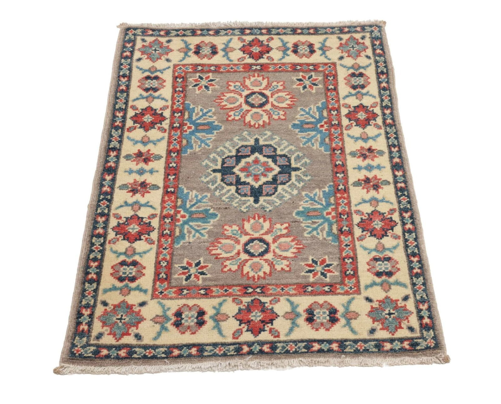 Kazak Teppich | Knotendichte: ca. 100.000 Knoten/m² | Material: 100% Schurwolle | Größe: 62 x 89 cm | Zustand: Handgeknüpft und in gutem Zustand | Herkunft: Pakistan | Muster: Geometrische Muster und Figuren