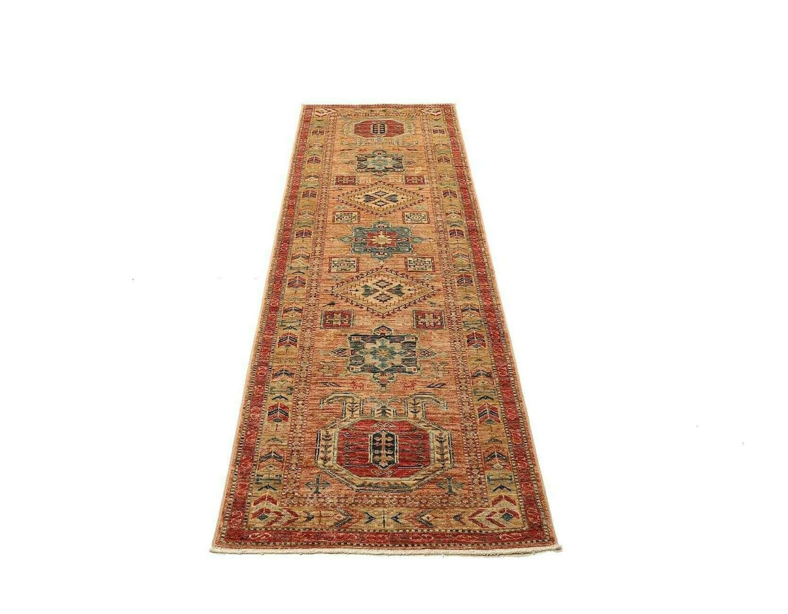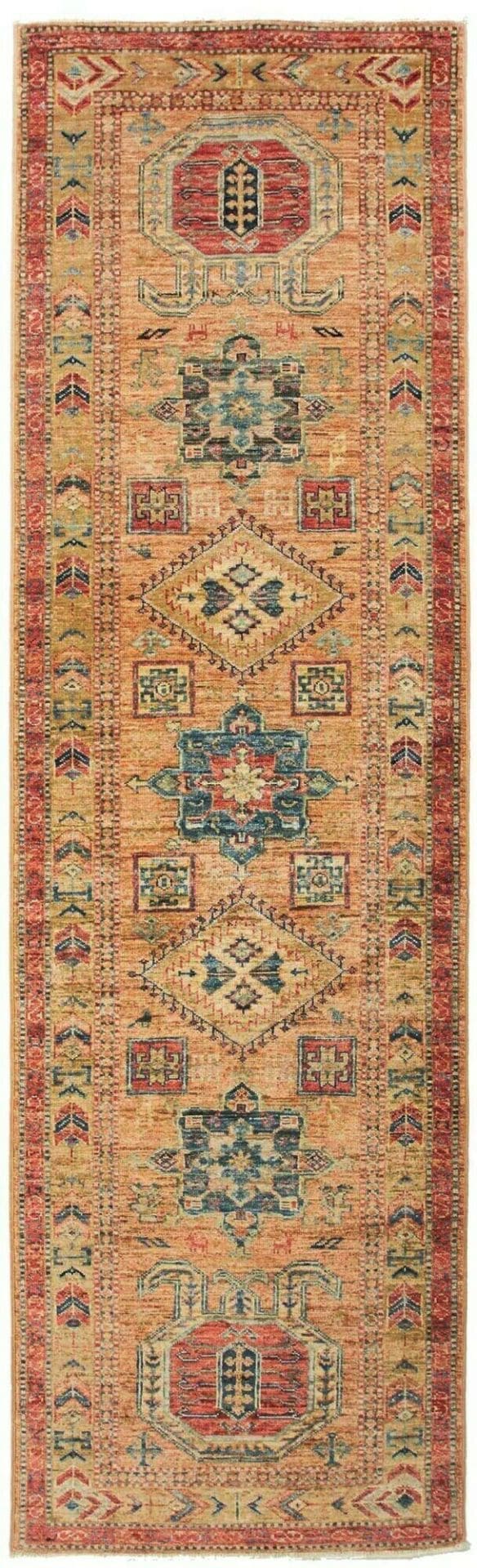 1385$Ursprünglicher Preis war: 1385$1156$Aktueller Preis ist: 1156$Kazak Teppich | Knotendichte: ca. 200.000 Knoten/m² | Material: 100% Schurwolle | Kette: 100% Baumwolle | Größe: 77×251 cm | Zustand: Handgeknüpft und hochwertig | Ursprung: Pakistan | Muster: Geometrisch und figural