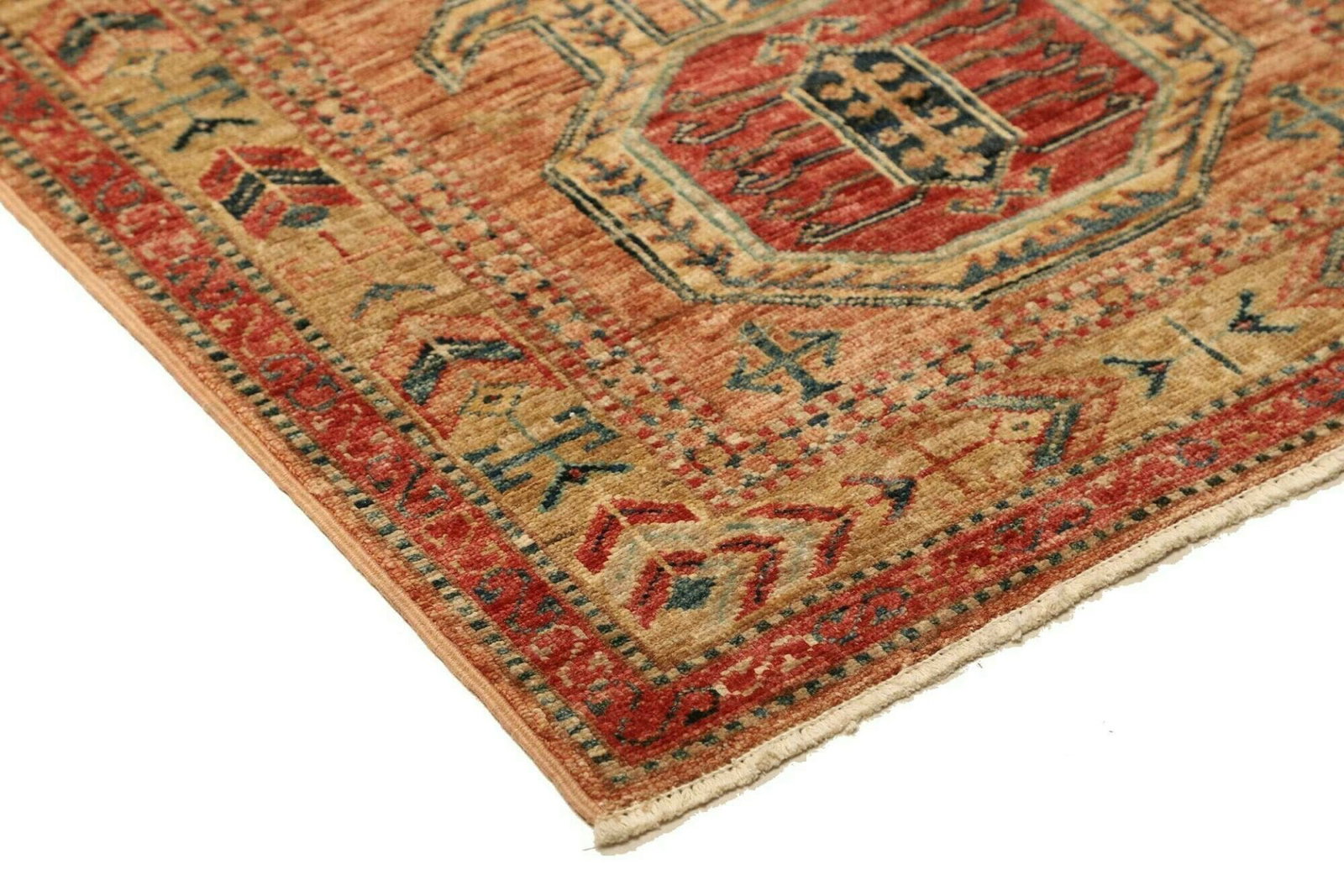 Der Teppich ist aus hochwertiger Schurwolle gefertigt, einem Material, das für seine Weichheit und Langlebigkeit bekannt ist. Schurwolle hat die Fähigkeit, die Temperatur zu regulieren, was bedeutet, dass sie im Winter warm und im Sommer kühl bleibt. Diese Eigenschaft macht den Kazak Orientteppich zu einer hervorragenden Wahl für alle Jahreszeiten. Die Verarbeitung erfolgt in traditioneller Knüpftechnik, was bedeutet, dass jeder Knoten von Hand gesetzt wird – eine Technik, die sowohl die Qualität als auch die Exklusivität des Produktes sicherstellt.