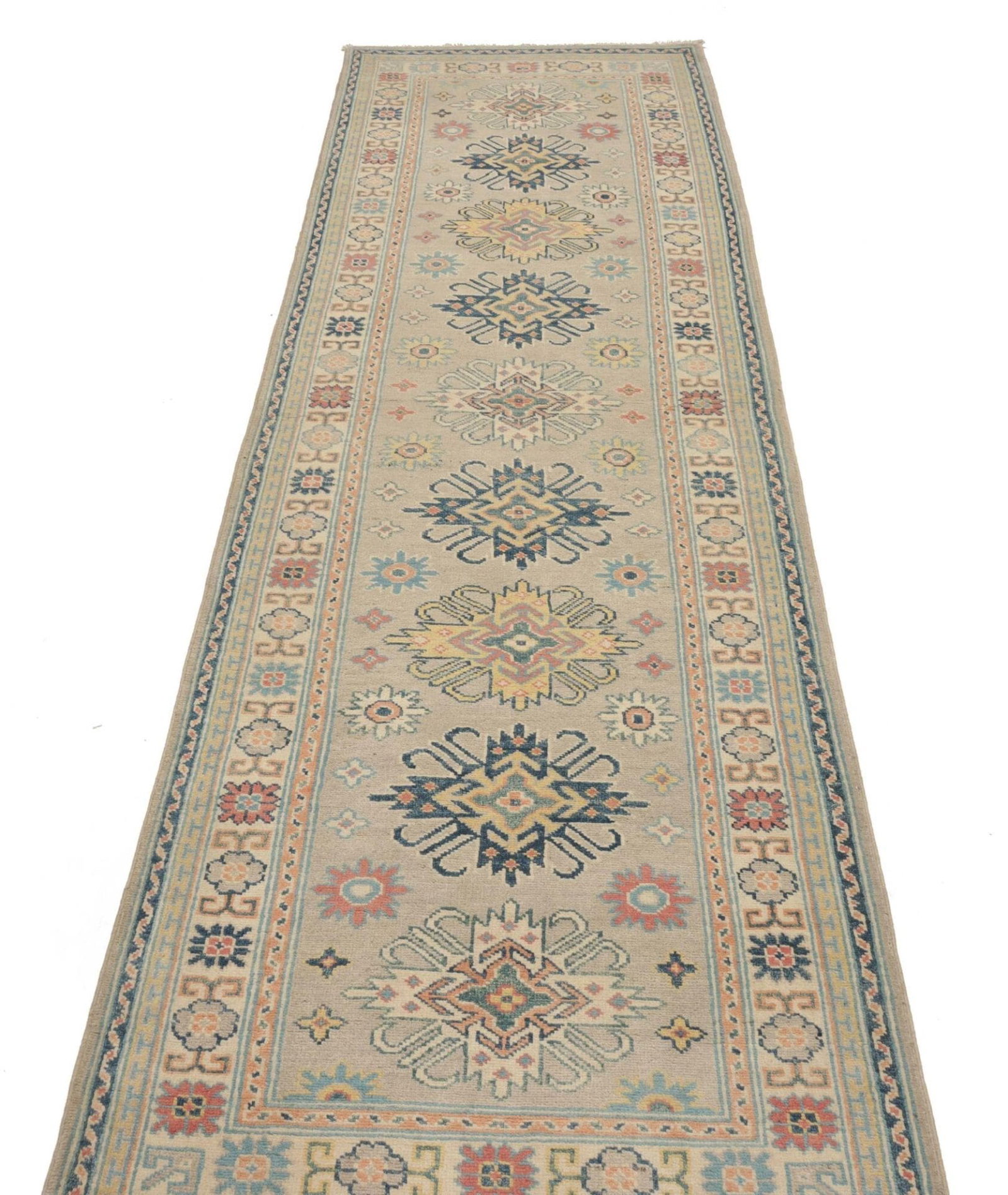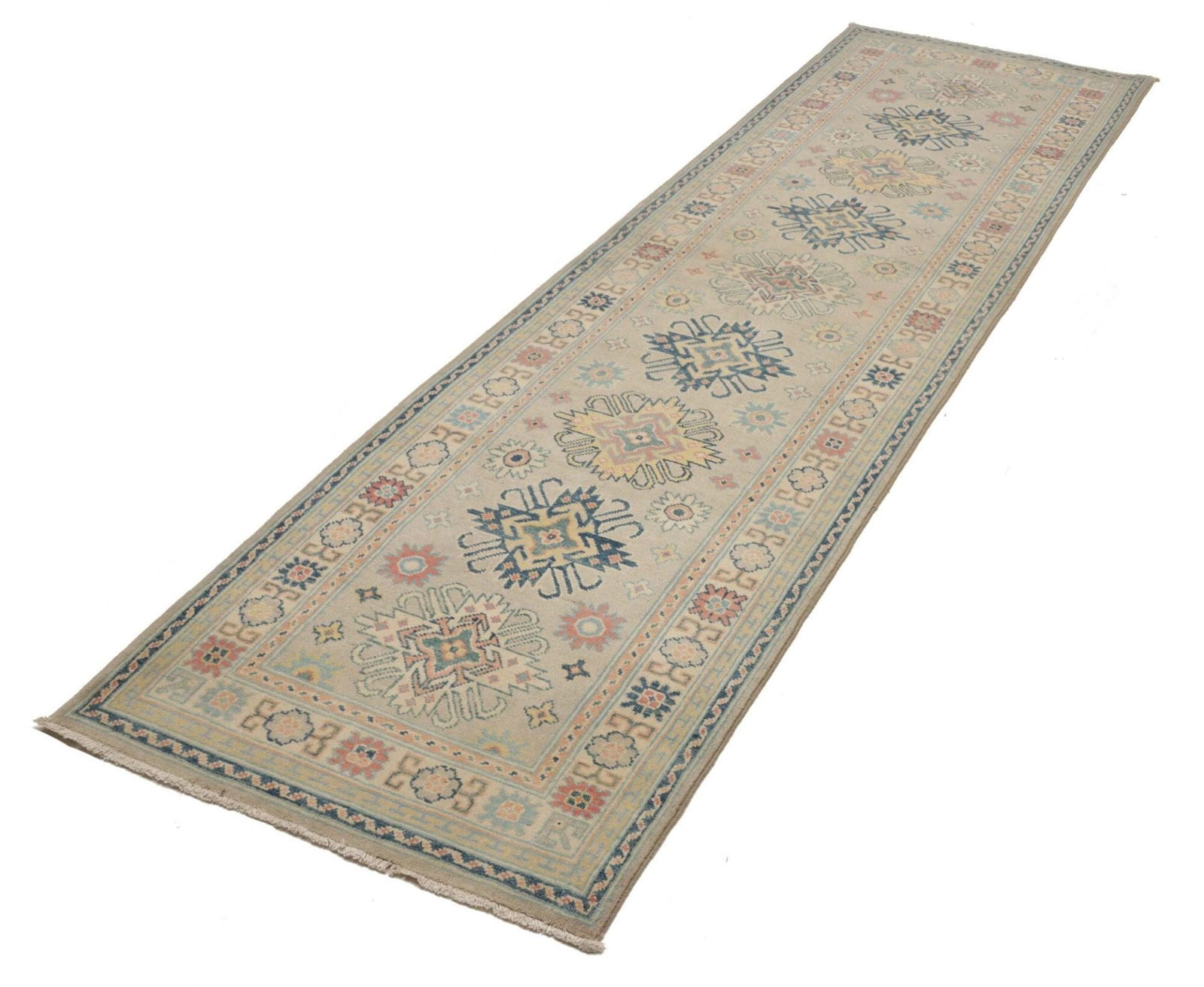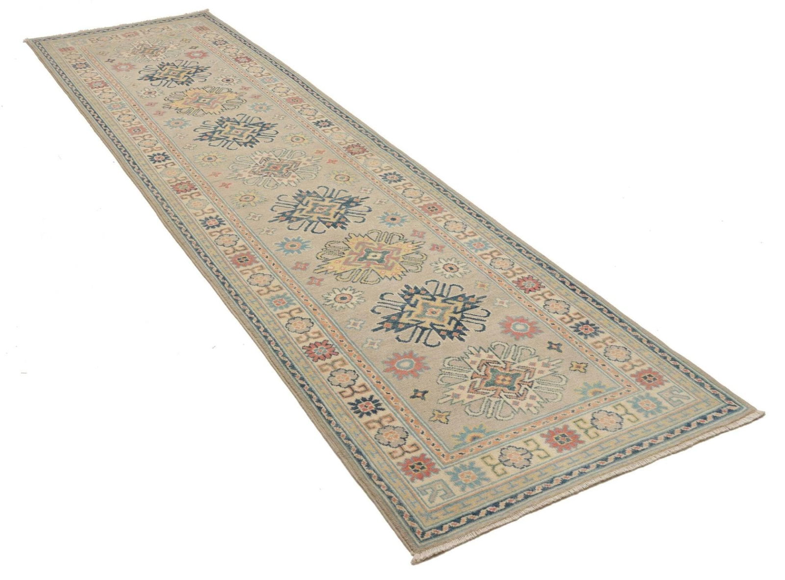 760$Ursprünglicher Preis war: 760$584$Aktueller Preis ist: 584$Kazak Teppich | Knotendichte: ca. 100.000 Knoten/m² | Flor: 100% Schurwolle | Kette: 100% Baumwolle | Größe: 86 x 292 cm | Handgeknüpfte Qualität | Herkunft: Pakistan | Geometrische Muster und Figuren