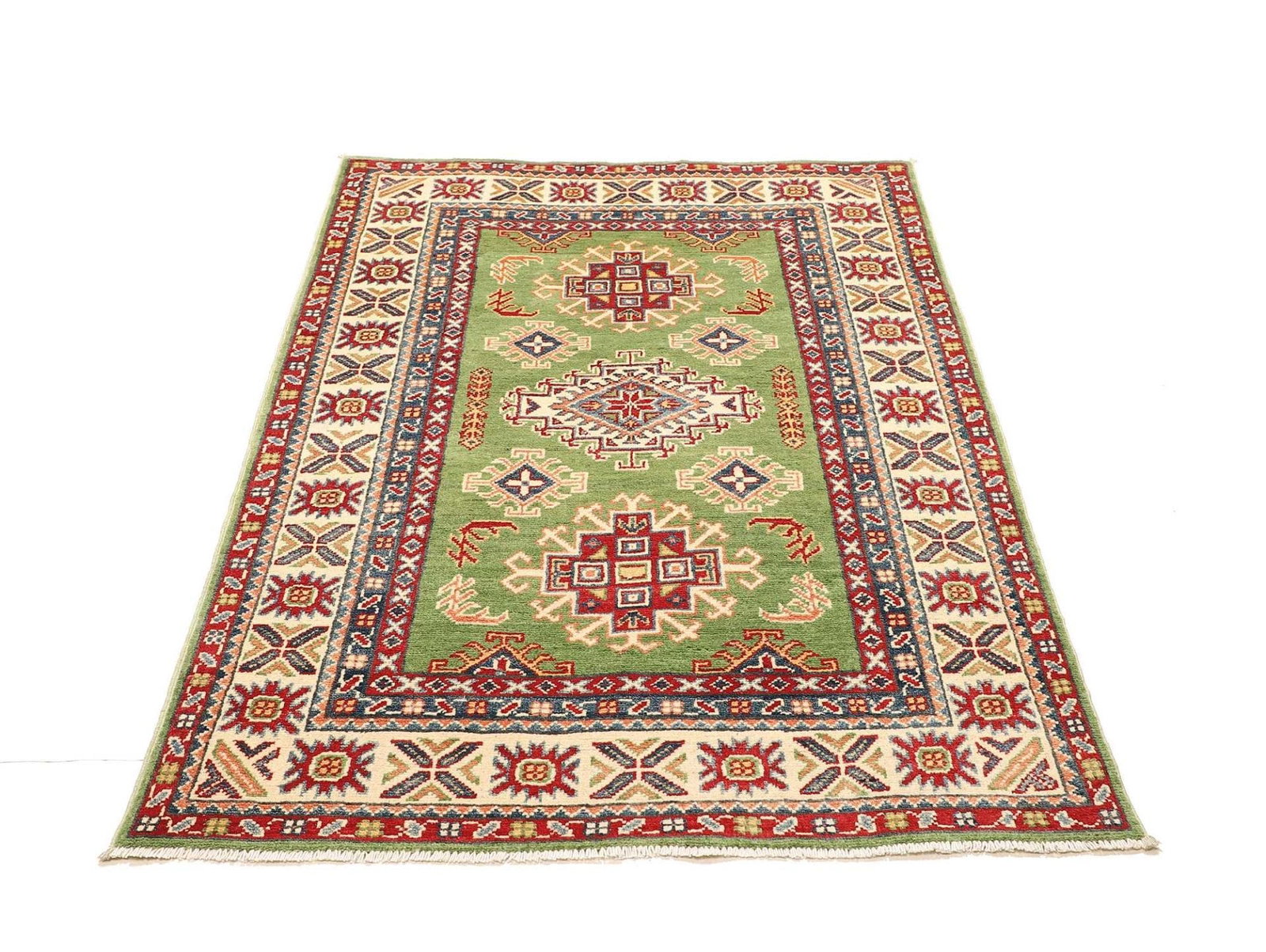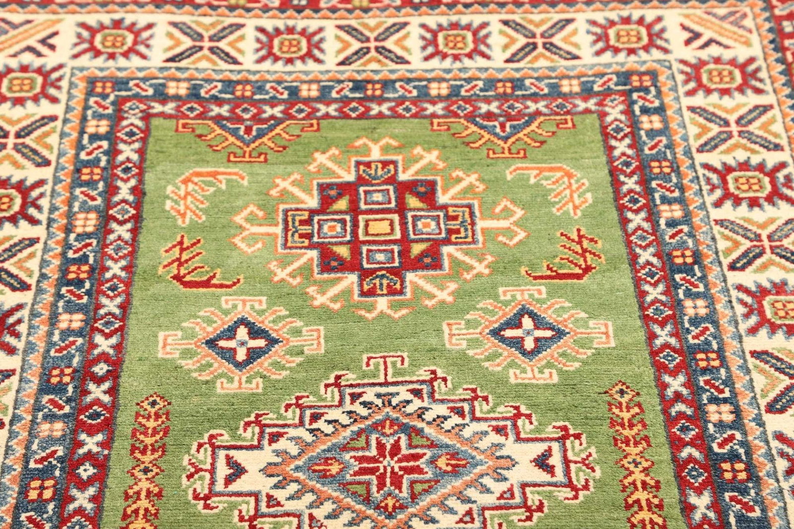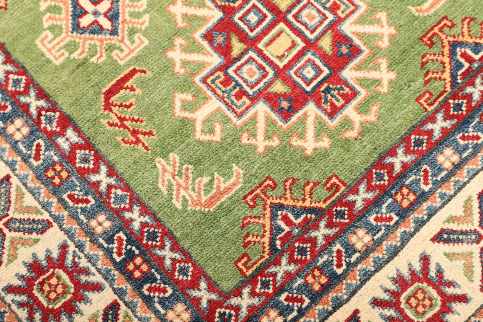 Kazak Teppich | Knotendichte: ca. 100.000 Knoten/m² | Material: 100% Schurwolle | Größe: 100×153 cm | Herkunft: Afghanistan | Zustand: Handgeknüpft, sehr gut erhalten | Muster: Geometrisch, typisch für Kazak Teppiche