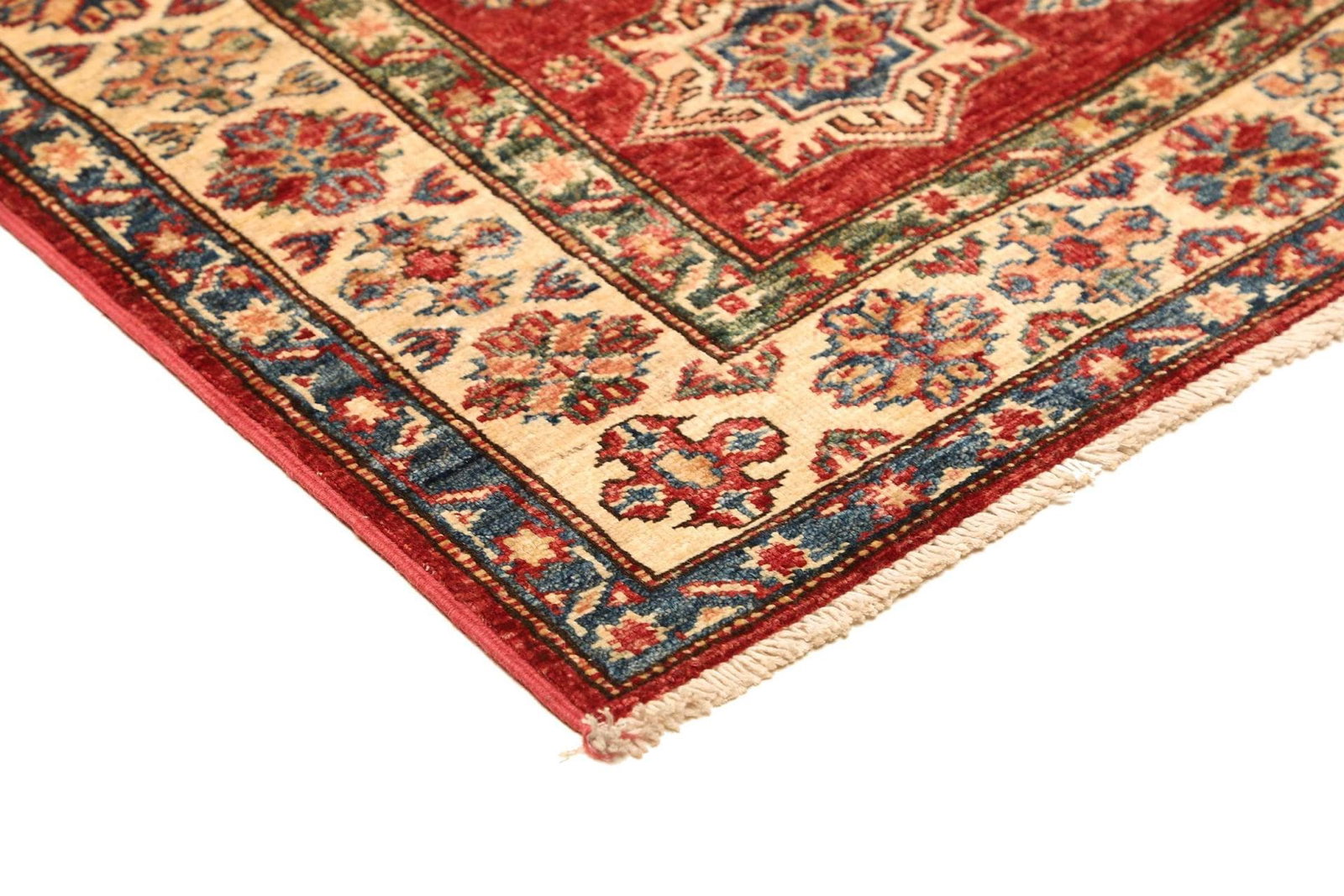 Der Kazak Teppich wird aus 100% reiner Schurwolle hergestellt. Schurwolle ist bekannt für ihre Robustheit, Langlebigkeit und den hohen Komfort. Die Verwendung von Schurwolle sorgt nicht nur für eine angenehme Haptik, sondern auch für eine hervorragende Isolierung von Kälte und Wärme. Diese Eigenschaften machen den Teppich ideal für unterschiedliche Räume in Ihrem Zuhause.