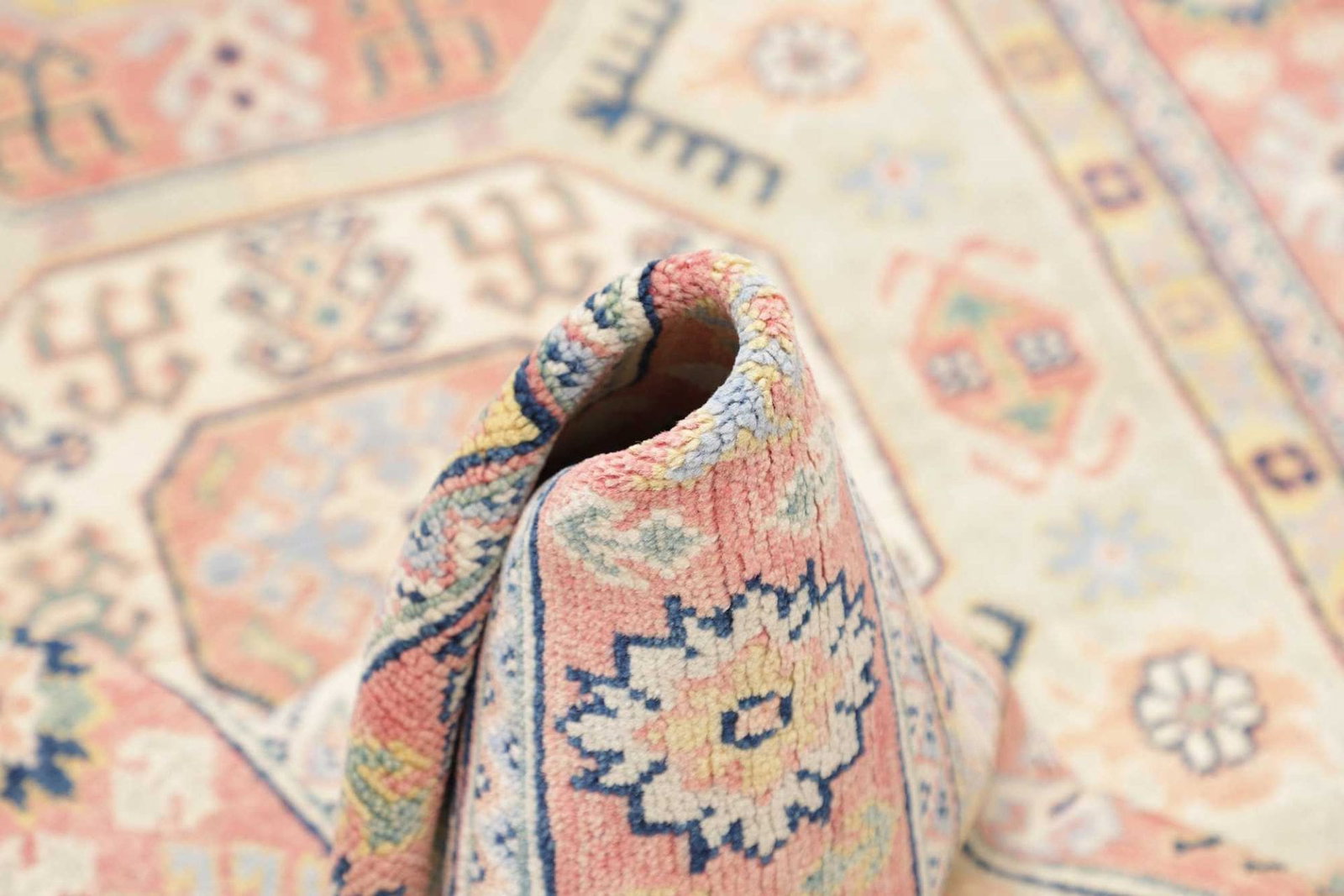 Der Kazak Teppich wird aus reiner Schurwolle hergestellt, einem Material, das für seine Langlebigkeit und Robustheit bekannt ist. Schurwolle bietet nicht nur eine unglaubliche Weichheit, sondern hat auch natürliche isolierende Eigenschaften, die zu einem angenehmen Raumklima beitragen. Die handgeknüpfte Technik garantiert eine hohe Knotendichte, die wiederum die Strapazierfähigkeit des Teppichs erhöht. Ein handgeknüpfter Teppich bedeutet, dass jeder Knoten von Hand hergestellt wurde, was zu einem einzigartigen und individuellen Charakter führt.