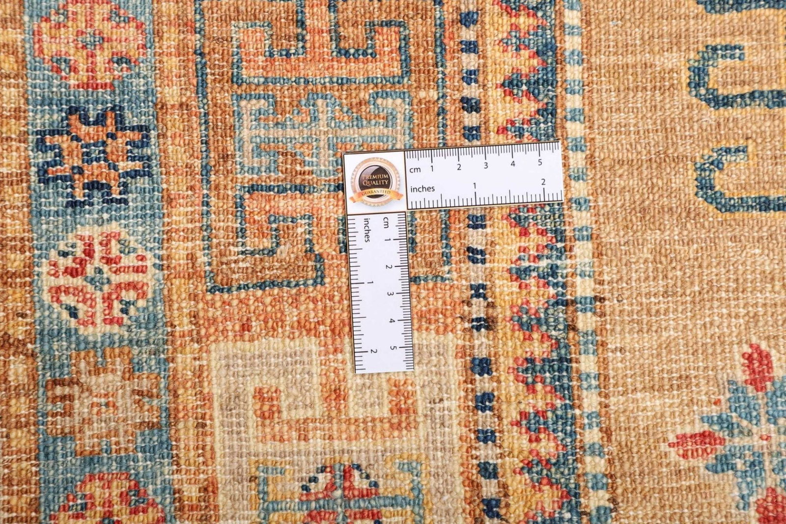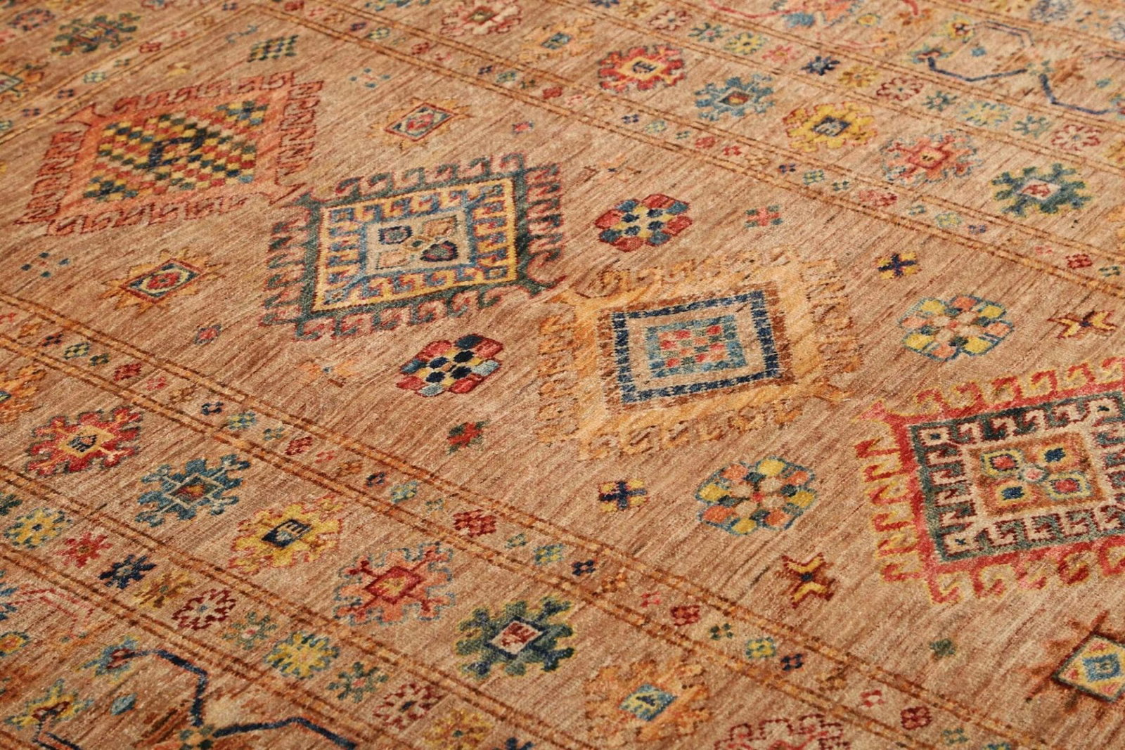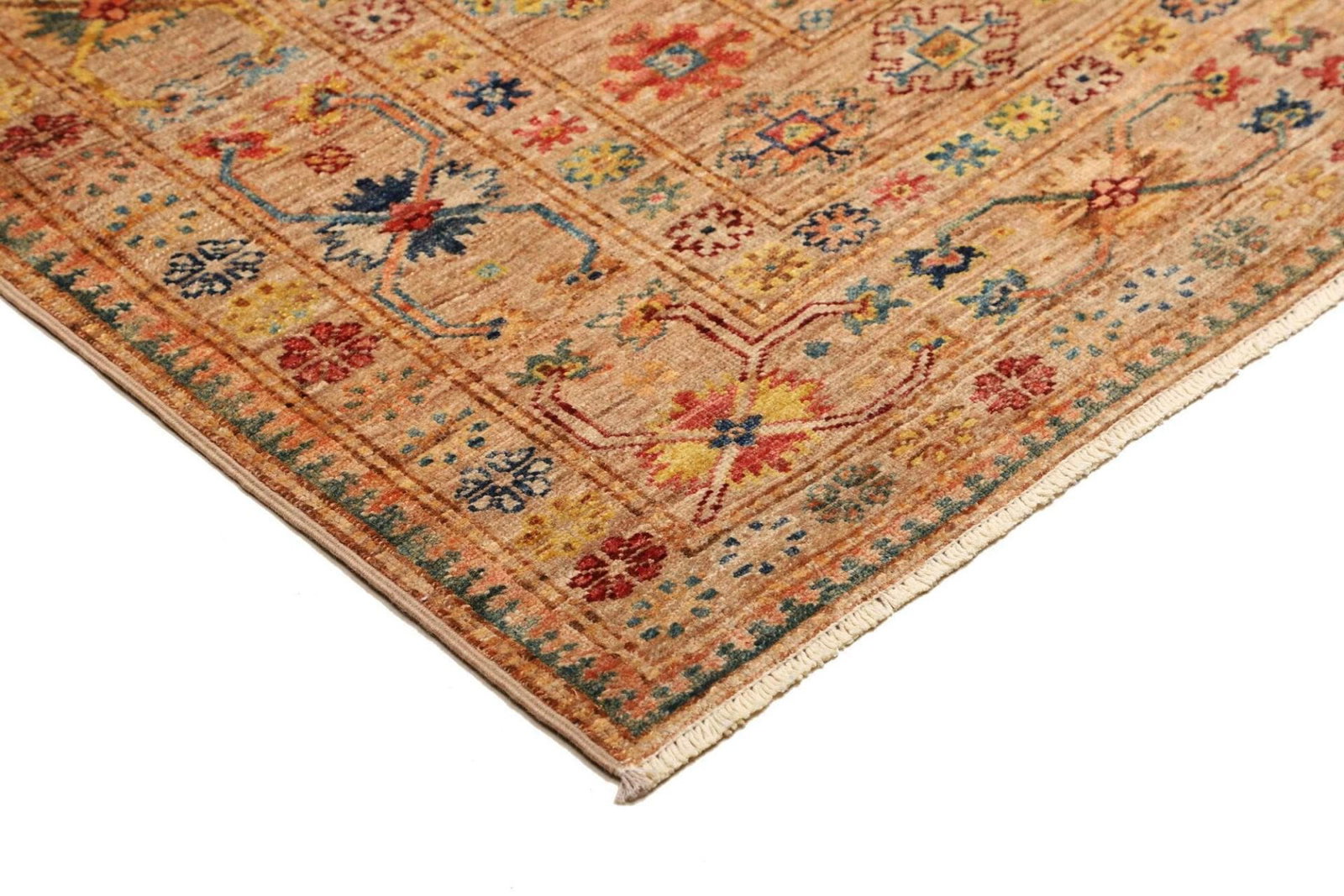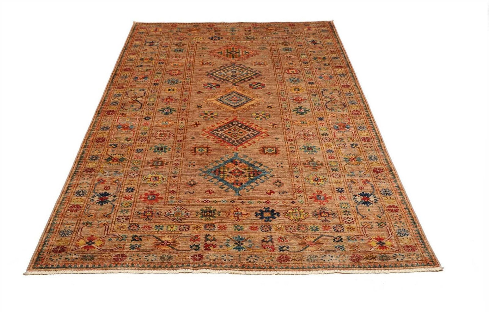 Das geometrische Muster dieses Kazak Teppichs ist eine Hommage an die jahrhundertealte Tradition der Teppichgestaltung in dieser Region. Die ineinander verschlungenen Formen und kräftigen Farbkontraste bringen Dynamik in jeden Raum. Ob in einem modernen, minimalistischen Wohnstil oder in einem klassischen, traditionell eingerichteten Zuhause – dieser Teppich passt sich harmonisch an und sorgt dafür, dass Ihre Einrichtung stets stilvoll und einladend wirkt. Die Verwendung von erdigen Tönen kombiniert mit lebhaften Akzenten verleiht dem Teppich eine besondere Tiefe und Ausdruckskraft, die das Ambiente Ihres Wohnraums bereichert.