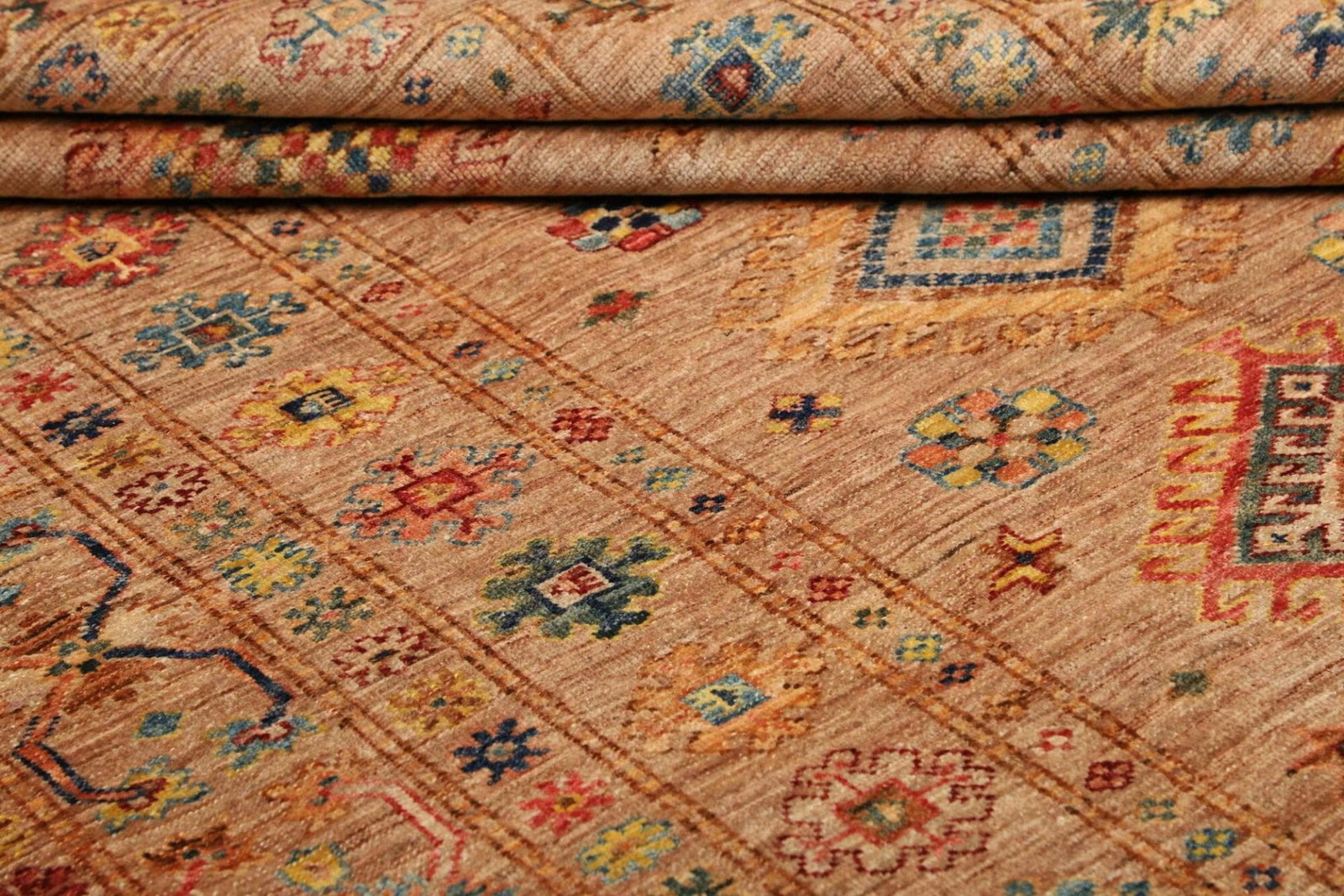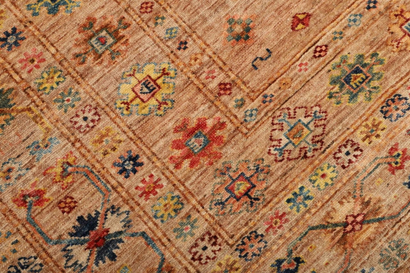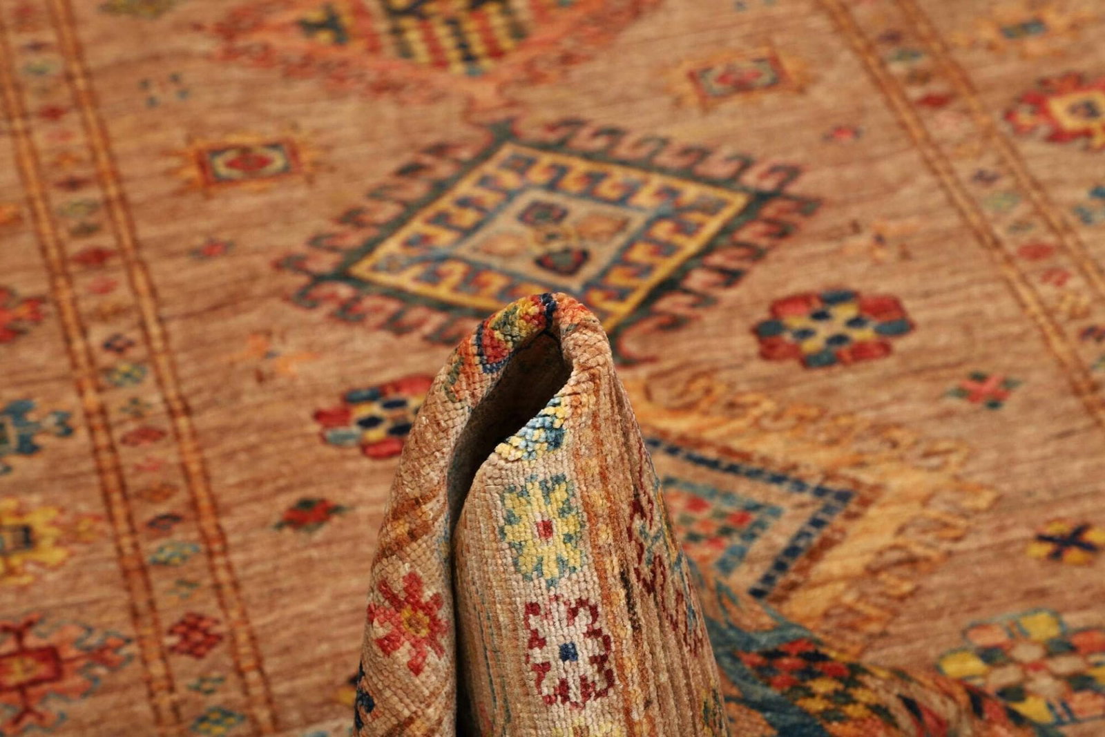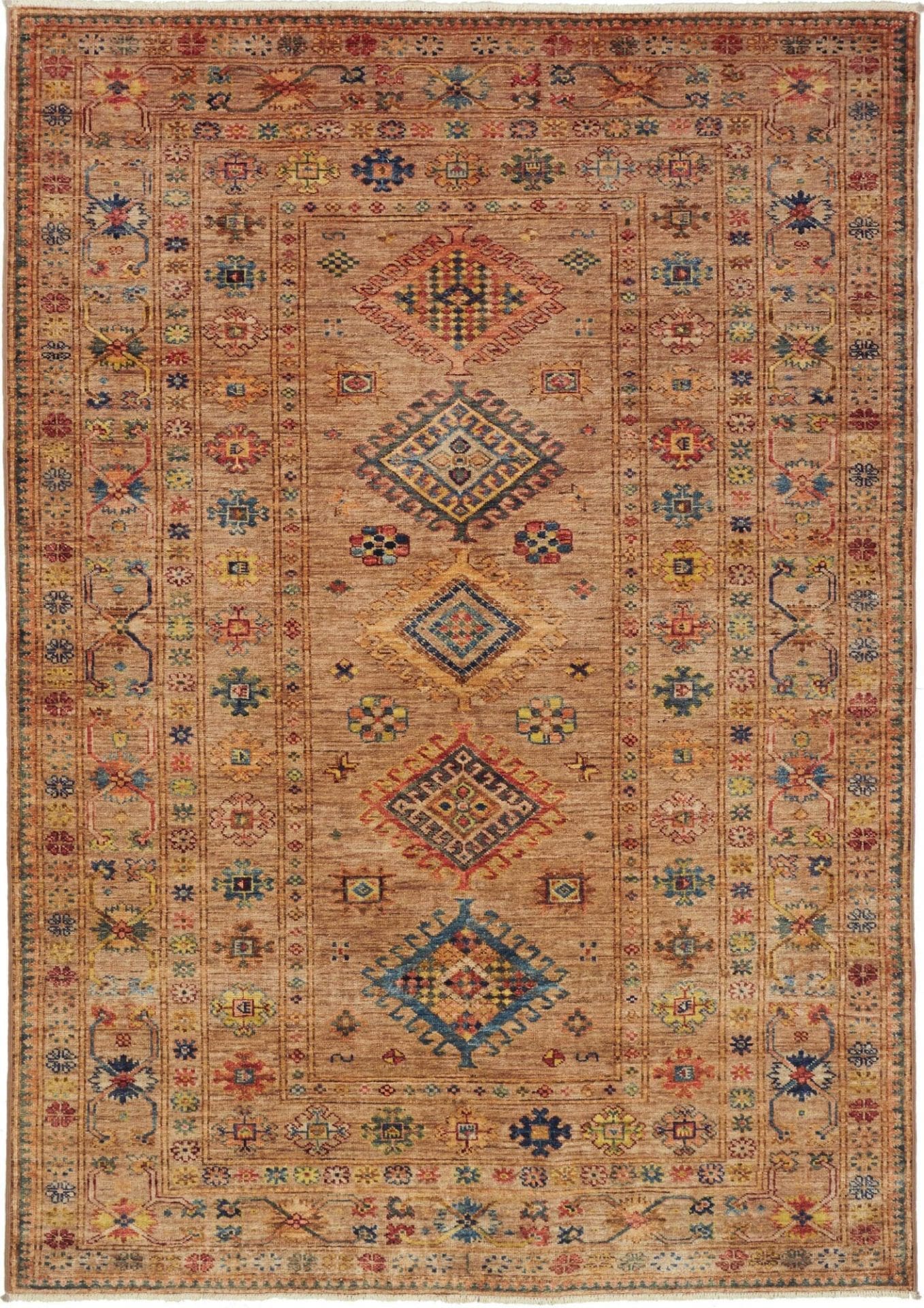 Das geometrische Muster dieses Kazak Teppichs ist eine Hommage an die jahrhundertealte Tradition der Teppichgestaltung in dieser Region. Die ineinander verschlungenen Formen und kräftigen Farbkontraste bringen Dynamik in jeden Raum. Ob in einem modernen, minimalistischen Wohnstil oder in einem klassischen, traditionell eingerichteten Zuhause – dieser Teppich passt sich harmonisch an und sorgt dafür, dass Ihre Einrichtung stets stilvoll und einladend wirkt. Die Verwendung von erdigen Tönen kombiniert mit lebhaften Akzenten verleiht dem Teppich eine besondere Tiefe und Ausdruckskraft, die das Ambiente Ihres Wohnraums bereichert.