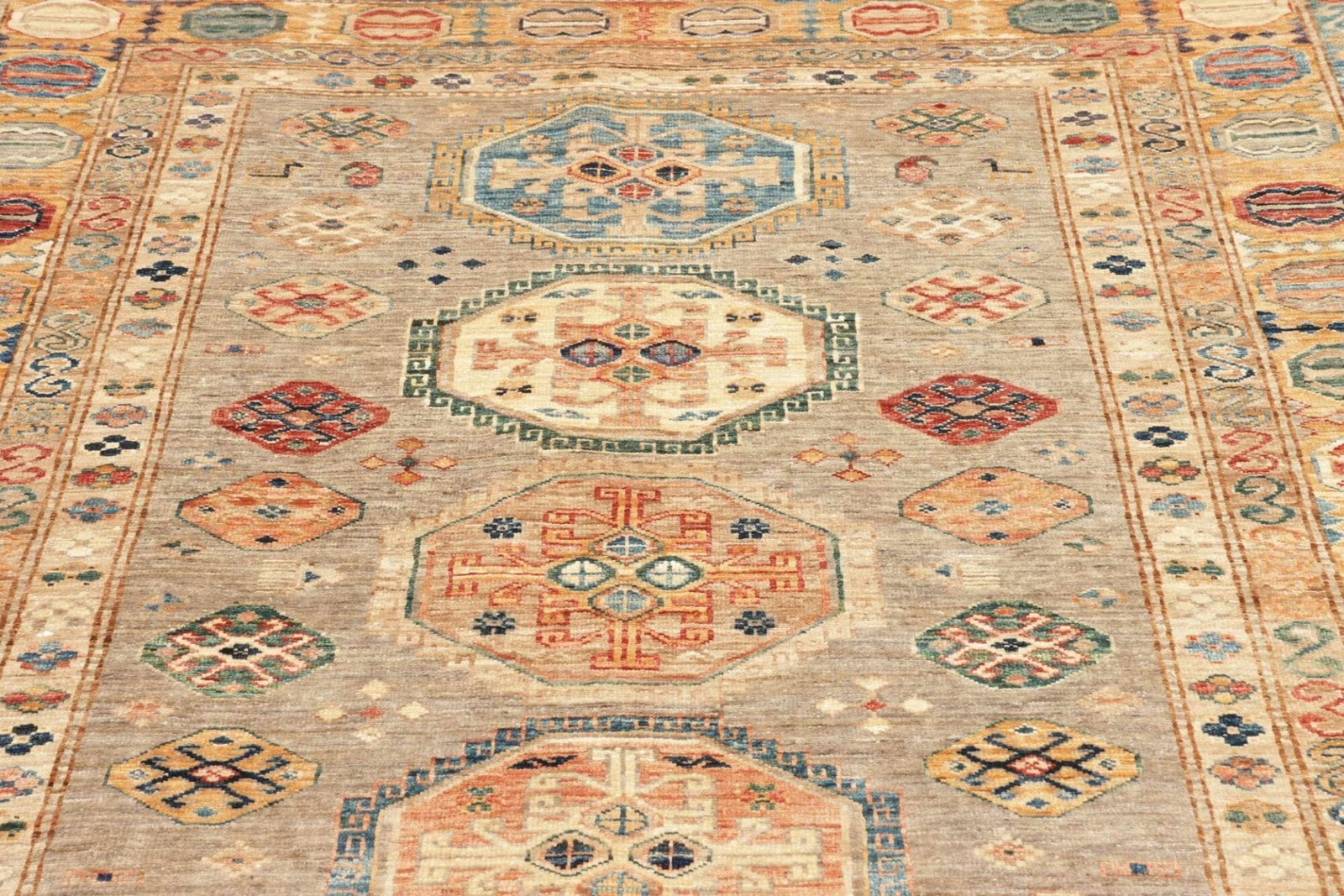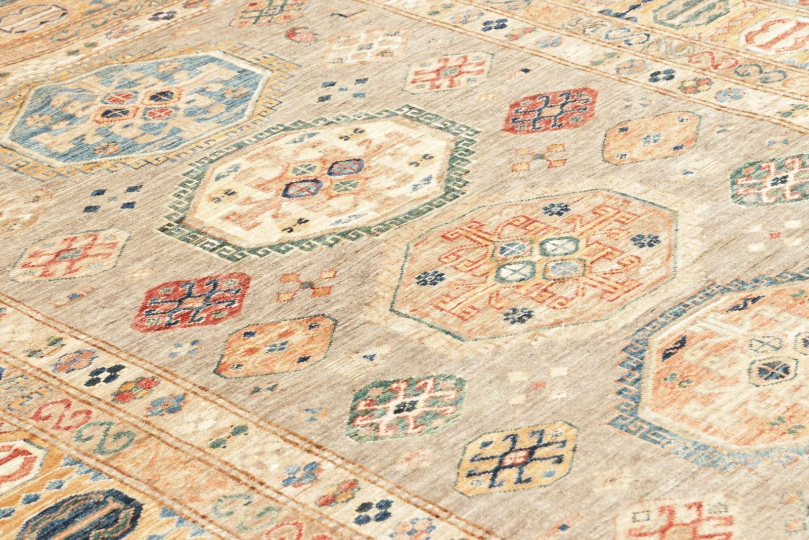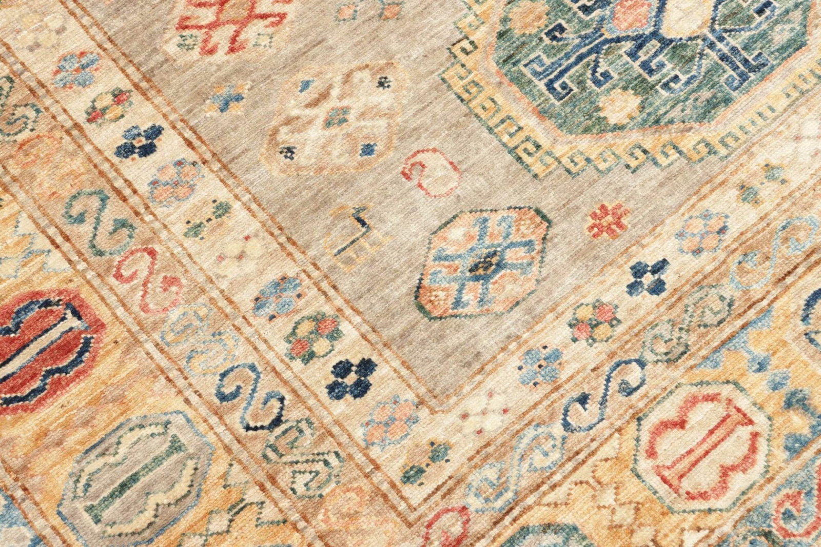 Der handgeknüpfte Kazak Teppich mit seinen geometrischen Mustern ist eine exquisite Wahl für diejenigen, die Qualität, Tradition und Stil in ihrem Wohnraum schätzen. Er verbindet jahrhundertelange Handwerkstraditionen mit modernem Design und würde jeden Raum in ein charmantes und einladendes Ambiente verwandeln.