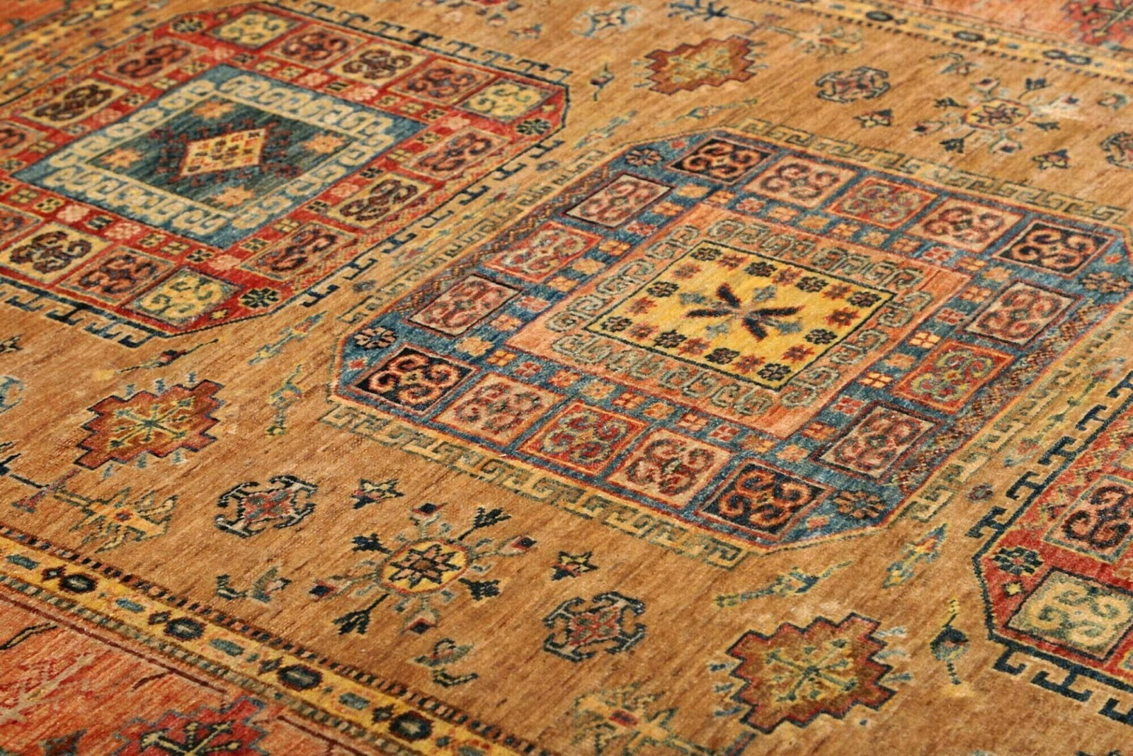 Das geometrische Muster des Kazak Teppichs ist nicht nur ästhetisch ansprechend, sondern auch förderlich für die räumliche Gestaltung Ihres Zuhauses. Typisch sind die klaren Linien und Formen, die Räumen sowohl Dynamik als auch Struktur verleihen. Die Kombination aus verschiedenen Farbtönen und geometrischen Elementen schafft einen faszinierenden visuellen Effekt, der sowohl modern als auch klassisch interpretiert werden kann. Durch das harmonische Zusammenspiel der Farben strahlt der Teppich eine warme und einladende Atmosphäre aus.