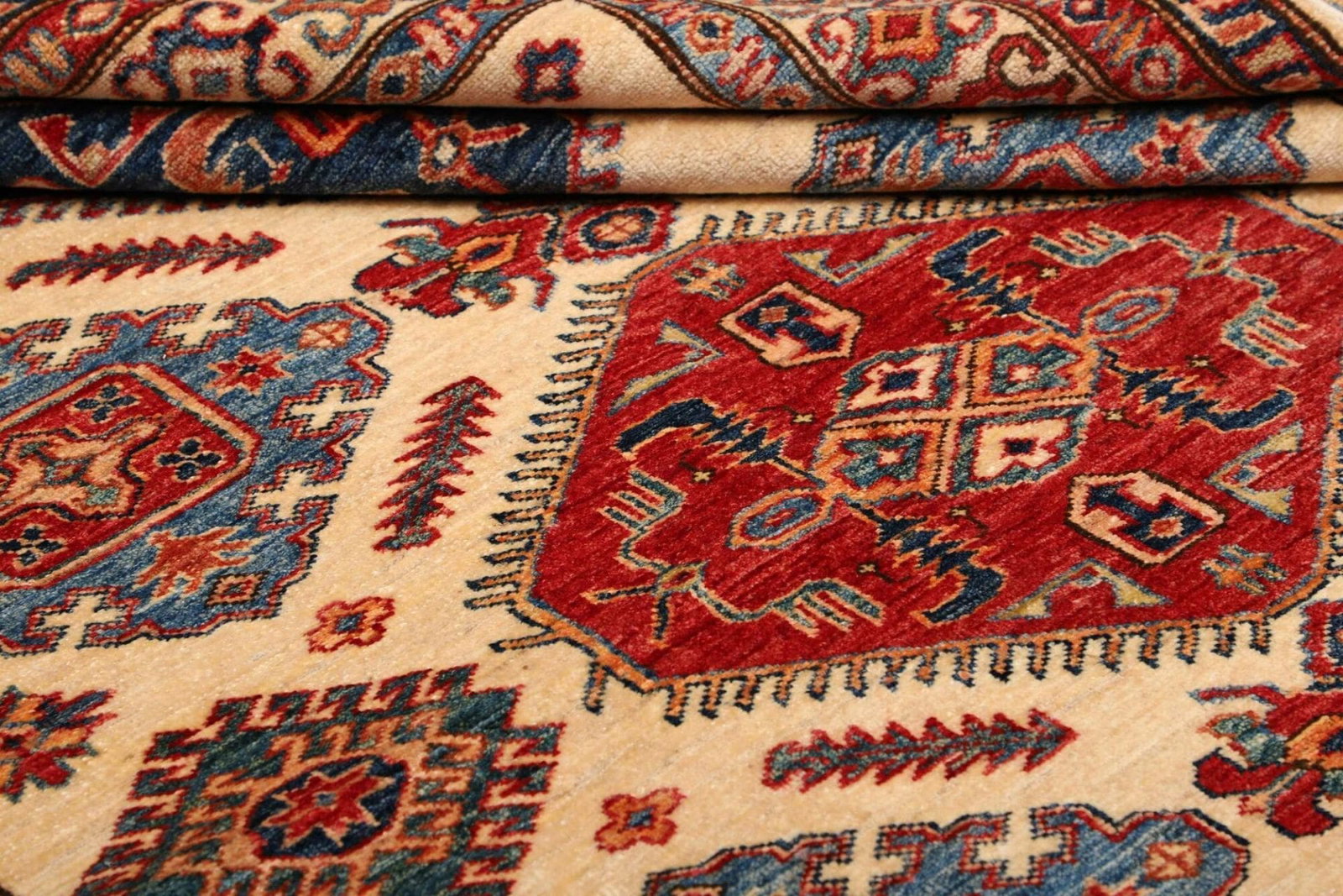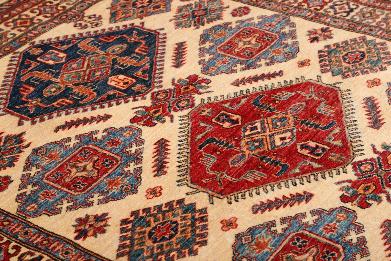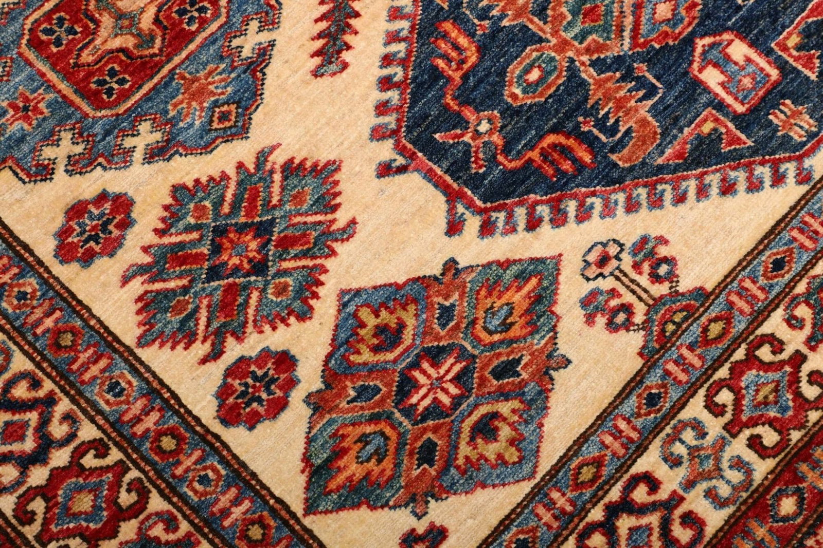 Ein herausragendes Merkmal dieses Kazak Teppichs ist die Kombination aus traditioneller Handwerkskunst und modernem Design. Die geometrischen Muster sind in kräftigen Farben gehalten, die sowohl rustikal als auch elegant wirken. Dieser Teppich ist somit vielseitig einsetzbar und passt perfekt in verschiedene Einrichtungsstile, von klassisch bis modern. Zudem sorgt die handgeknüpfte Qualität dafür, dass der Teppich sowohl für Wohnräume als auch für stark frequentierte Bereiche geeignet ist.
