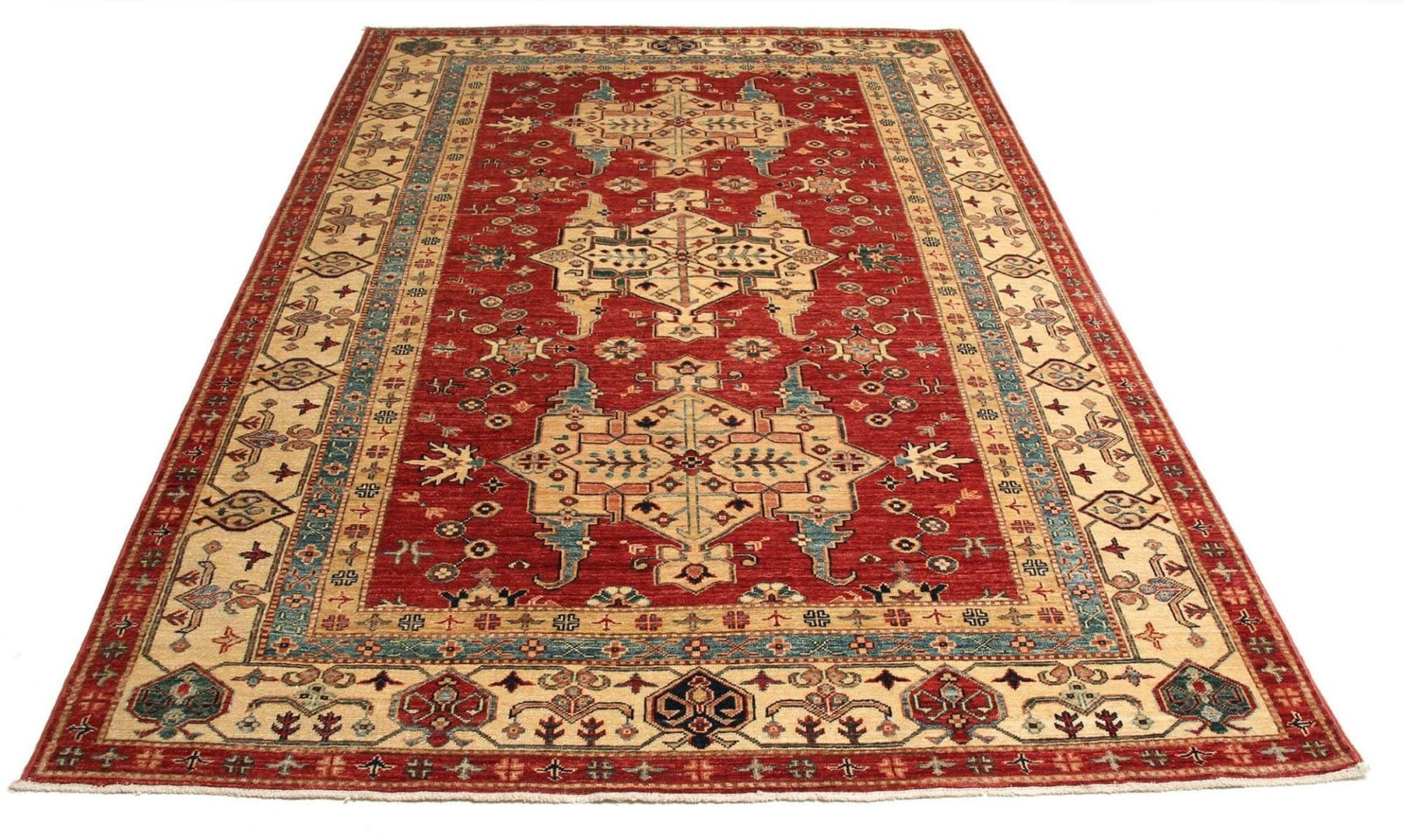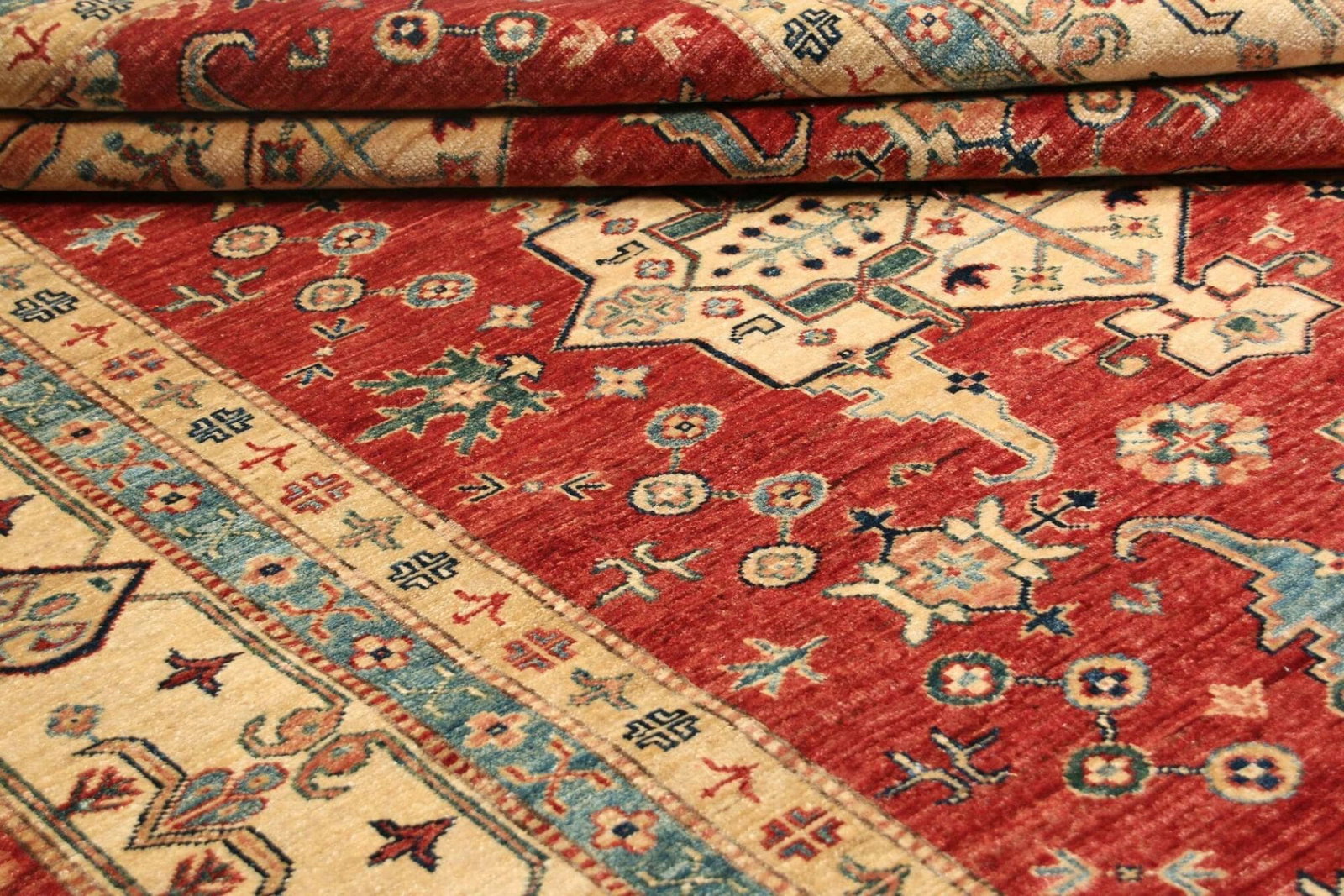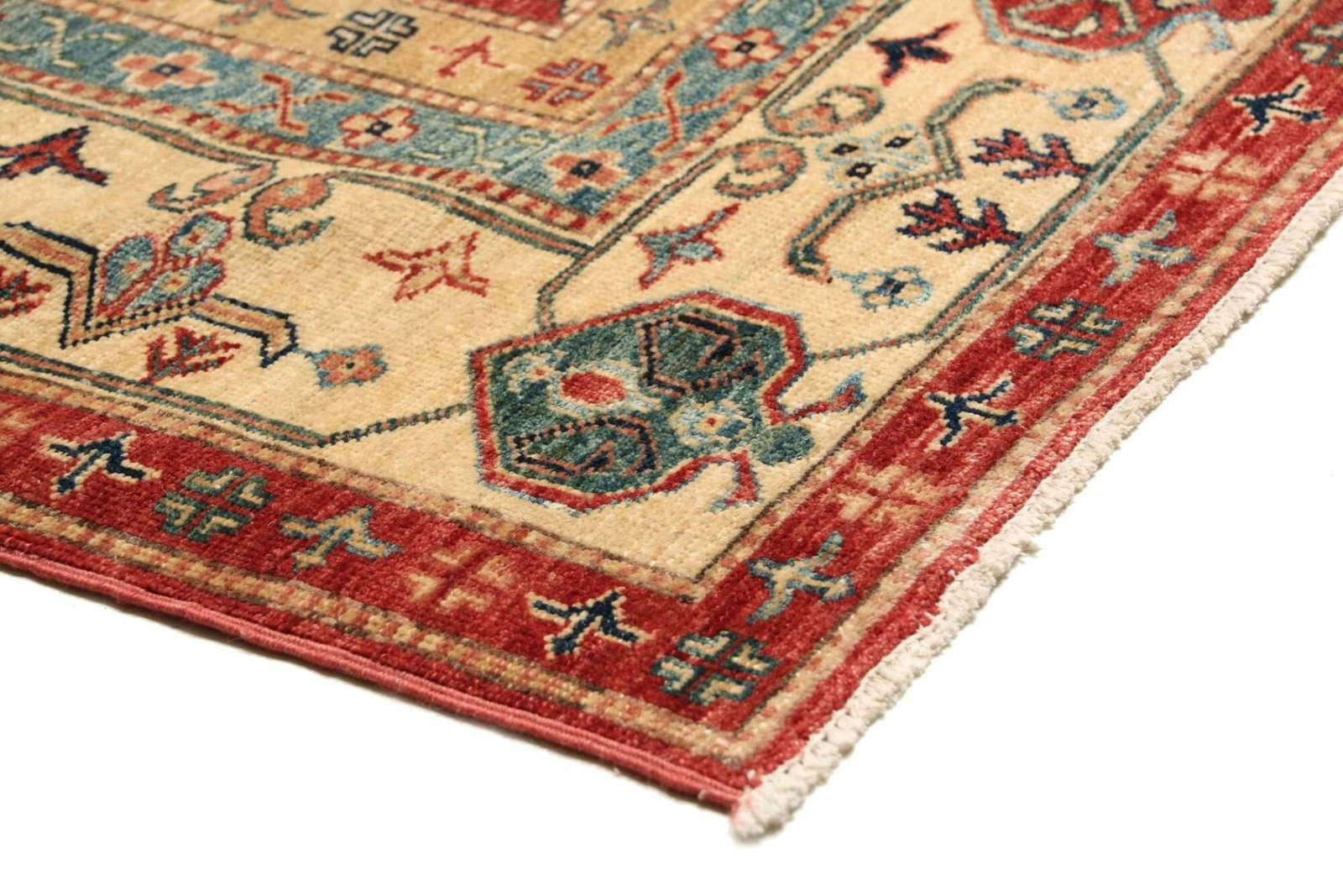 Der Kazak Teppich ist aus hochwertigen, natürlichen Materialien gefertigt, die für ihre Strapazierfähigkeit und Langlebigkeit bekannt sind. Die verwendeten Wollen erlauben eine angenehme Textur und machen den Teppich nicht nur zu einem optischen Highlight, sondern auch zu einem funktionalen Begleiter in Ihrem Wohnraum. Die handgeknüpfte Technik, durch die jeder einzelne Knoten in präziser Handarbeit gesetzt wird, sorgt für eine hohe Knotendichte, die dem Teppich Widerstandsfähigkeit verleiht und ihn gleichzeitig weich und bequem macht.