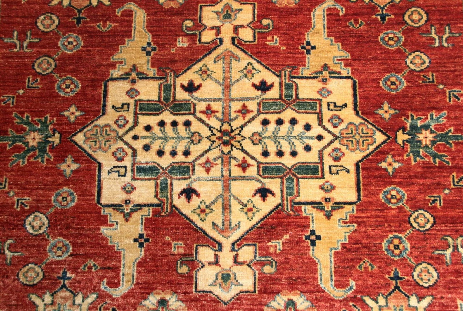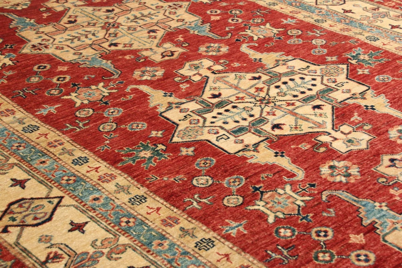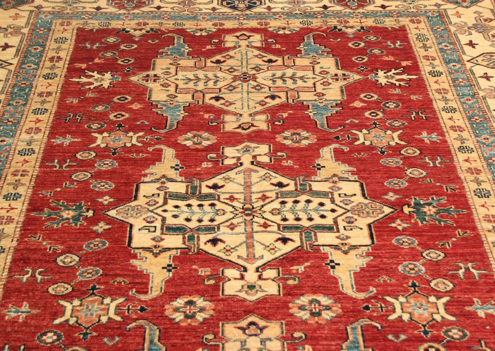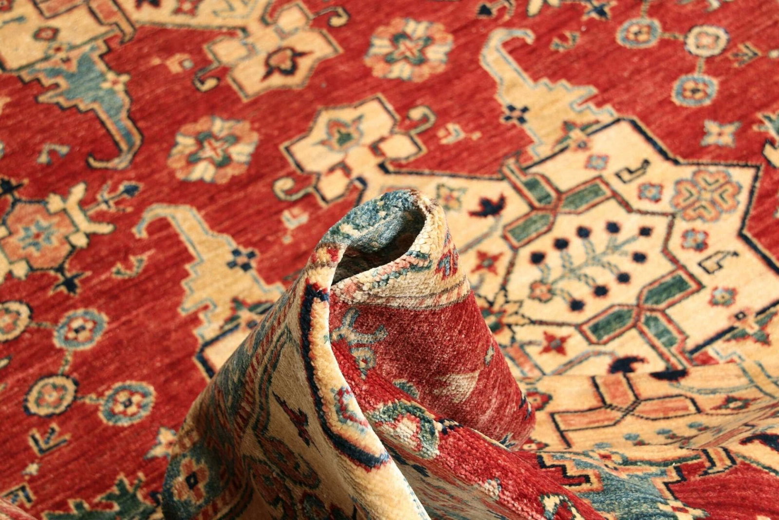 Der Kazak Teppich ist aus hochwertigen, natürlichen Materialien gefertigt, die für ihre Strapazierfähigkeit und Langlebigkeit bekannt sind. Die verwendeten Wollen erlauben eine angenehme Textur und machen den Teppich nicht nur zu einem optischen Highlight, sondern auch zu einem funktionalen Begleiter in Ihrem Wohnraum. Die handgeknüpfte Technik, durch die jeder einzelne Knoten in präziser Handarbeit gesetzt wird, sorgt für eine hohe Knotendichte, die dem Teppich Widerstandsfähigkeit verleiht und ihn gleichzeitig weich und bequem macht.