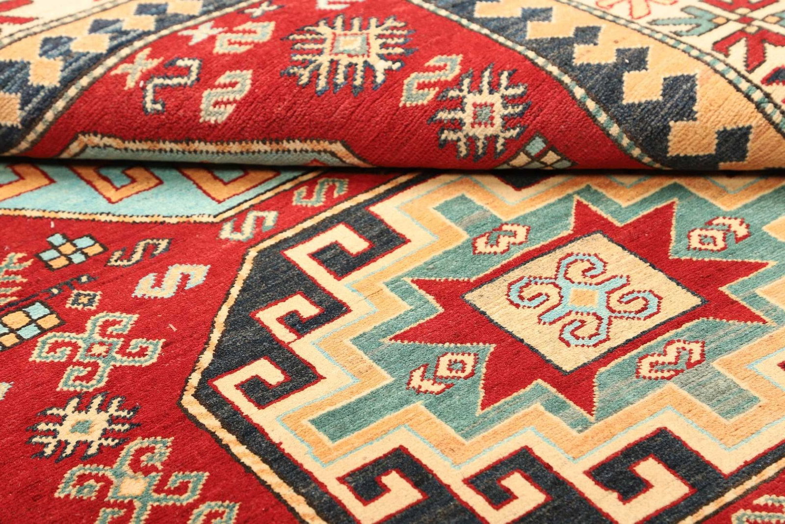 Der Kazak Teppich besteht aus hochwertigen Materialien, die für ihre Langlebigkeit und Robustheit bekannt sind. Die Verwendung von reiner Wolle sorgt für eine sanfte Haptik und eine warme Ausstrahlung, während die dicht und sorgfältig geknüpften Fasern für eine hohe Strapazierfähigkeit sorgen. Jedes Stück wird mit Liebe zum Detail und unter Verwendung traditioneller Techniken gefertigt. Die Knotendichte ist ein wichtiges Qualitätsmerkmal, das den Teppich nicht nur strapazierfähig, sondern auch äußerst dekorativ macht. Handgeknüpfte Teppiche sind bekannt für ihre langen Lebensdauer und die Fähigkeit, mit der Zeit eine besondere Patina zu entwickeln.