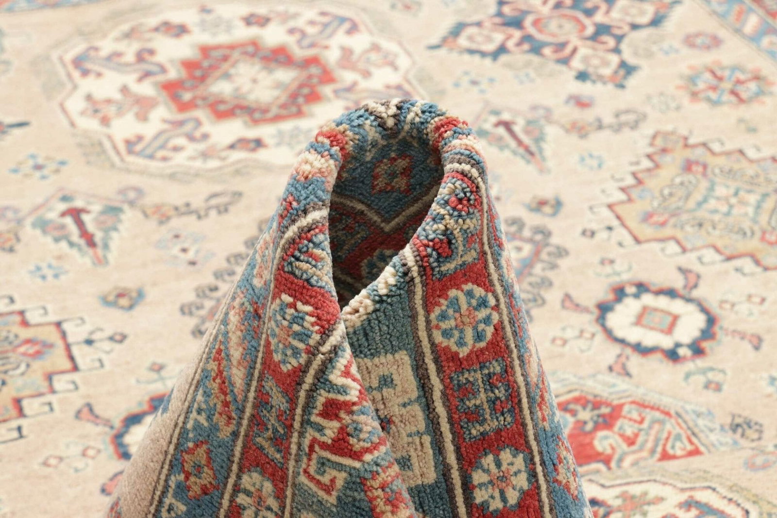 Der Kazak Teppich wird aus hochwertigen Materialien gefertigt, die sowohl für ihre Robustheit als auch für ihren hohen Komfort bekannt sind. Die weichen, aber strapazierfähigen Fasern sorgen dafür, dass der Teppich nicht nur optisch ansprechend, sondern auch praktisch im Alltag ist. Das handgeknüpfte Design garantiert eine hohe Knotendichte, die nicht nur die Haltbarkeit erhöht, sondern auch die Detailgenauigkeit der geometrischen Muster zur Geltung bringt.