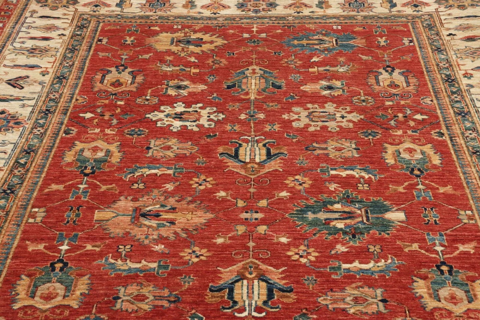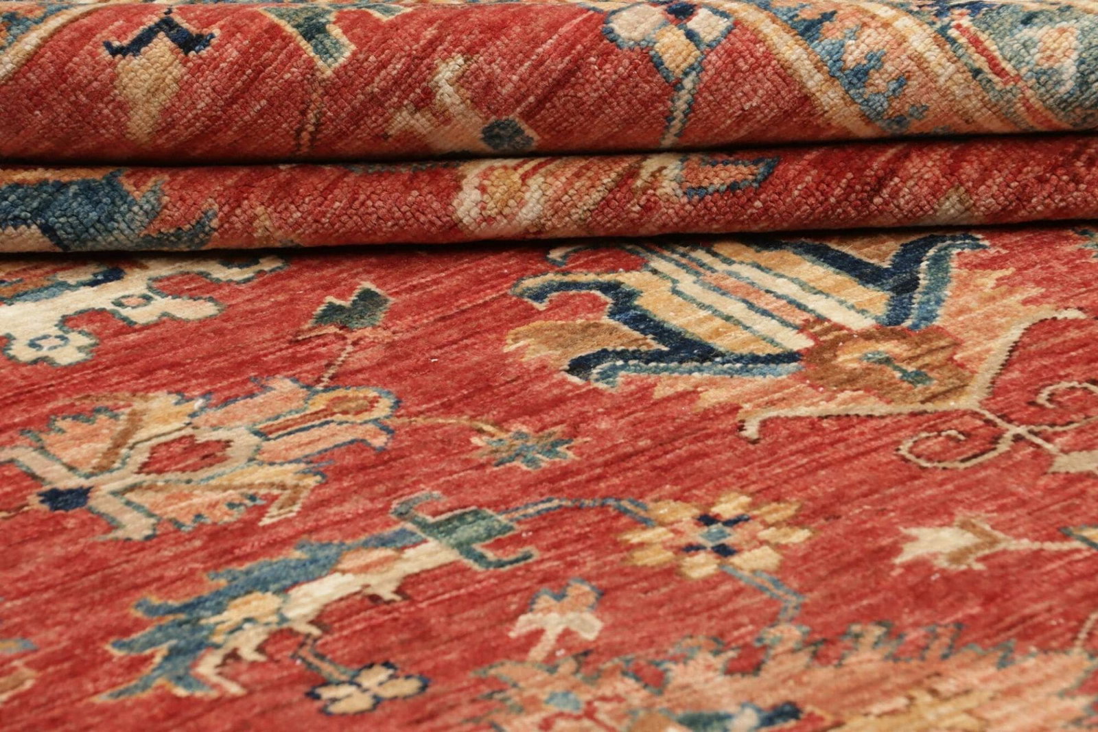 Unser Kazak Teppich besteht aus feinstem Schurwolle, die für ihre Langlebigkeit und Widerstandsfähigkeit bekannt ist. Die Wollfasern sind weich und bieten gleichzeitig eine robuste Struktur, die dem Teppich seine Form und Ausstrahlung verleiht. Die handgeknüpfte Technik garantiert eine überdurchschnittliche Knotendichte, die die Lebensdauer des Teppichs erheblich verlängert. Bei handgeknüpften Teppichen wird jeder Knoten einzeln gefertigt, was die Qualität und die Detailtreue des Musters unterstreicht und zu einer wirklich einzigartigen Erscheinung führt.