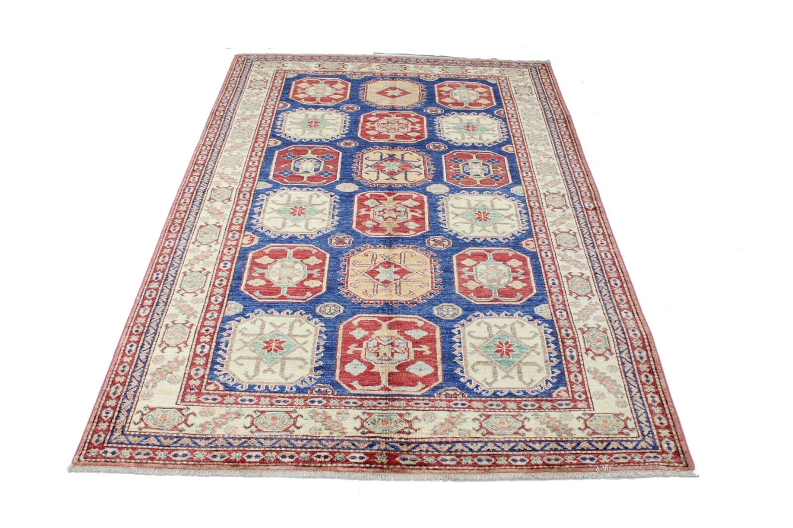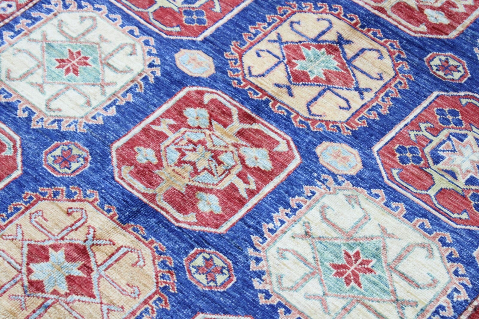 Original Handgeknüpfter Kazak Teppich | Größe: 215 x 146 cm | Dicke: ca. 7 mm | Knotendichte: ca. 160.000 – 200.000 Knoten/m² | Material: 100% Hochlandwolle, Kette: 100% Baumwolle | Zustand: Perfekt, neu mit Etikett | Ursprung: Afghanistan | Stil: Art déco, geometrisches Muster | Pflegeleicht und haustierfreundlich | Für Fußbodenheizung geeignet | Unikat – Nur 1 auf Lager