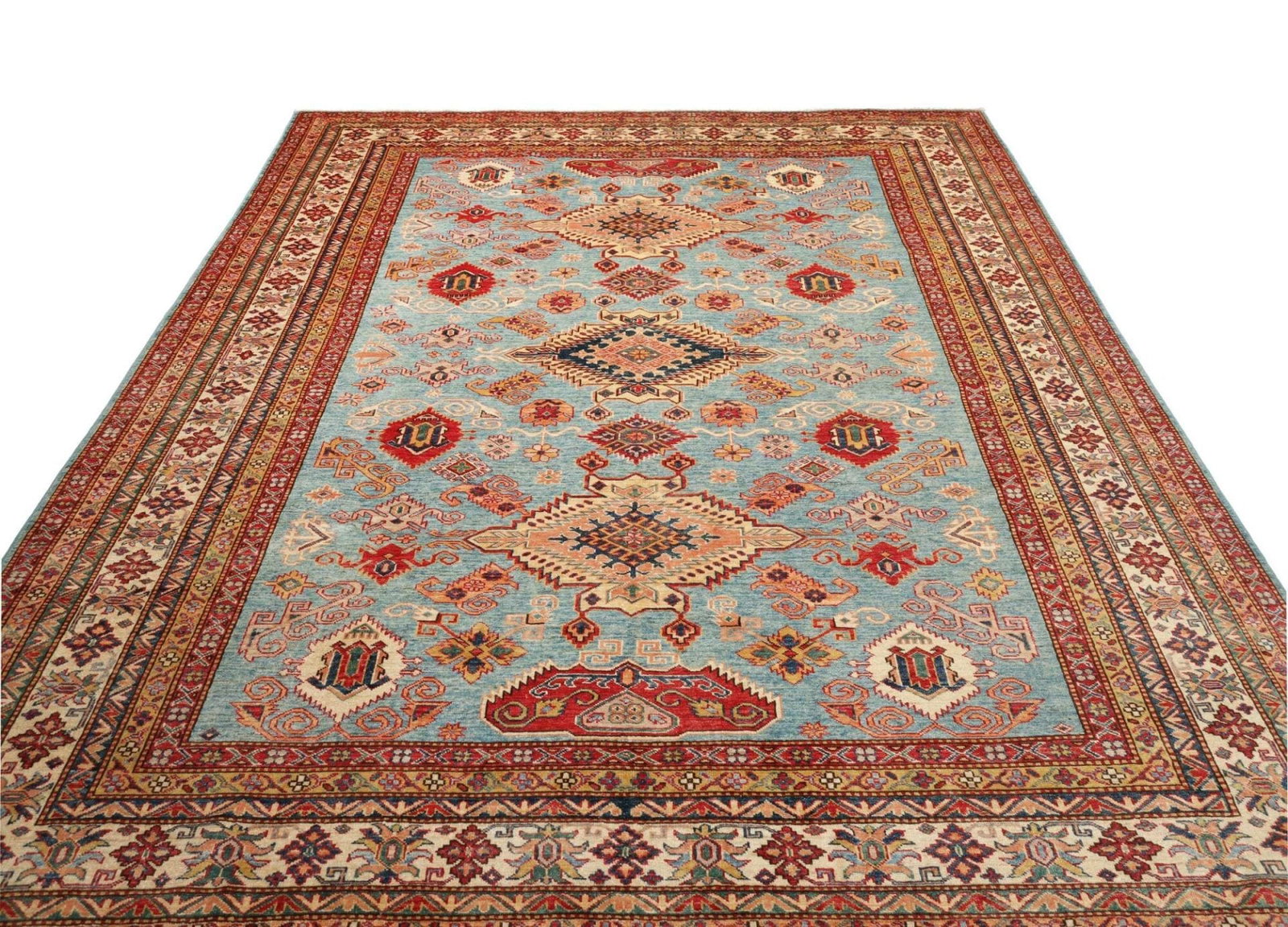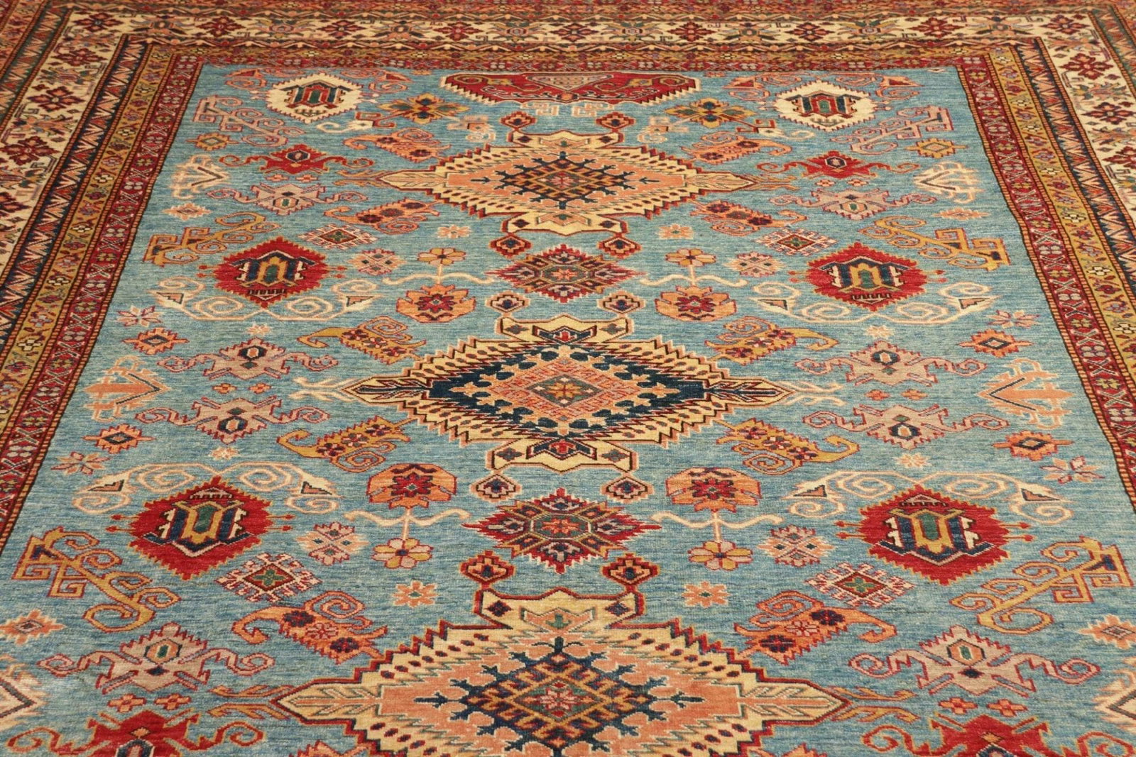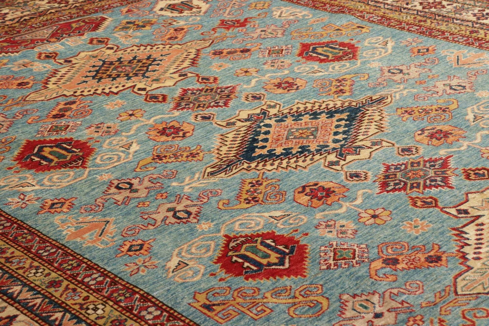 Jeder Kazak Teppich erzählt eine Geschichte und bringt kulturelle Erbes in Ihr Zuhause. Die kombinierten Farben und Formen schaffen ein harmonisches Gesamtbild, das in unterschiedlichsten Wohnstilen wirkt – von traditionell bis modern.