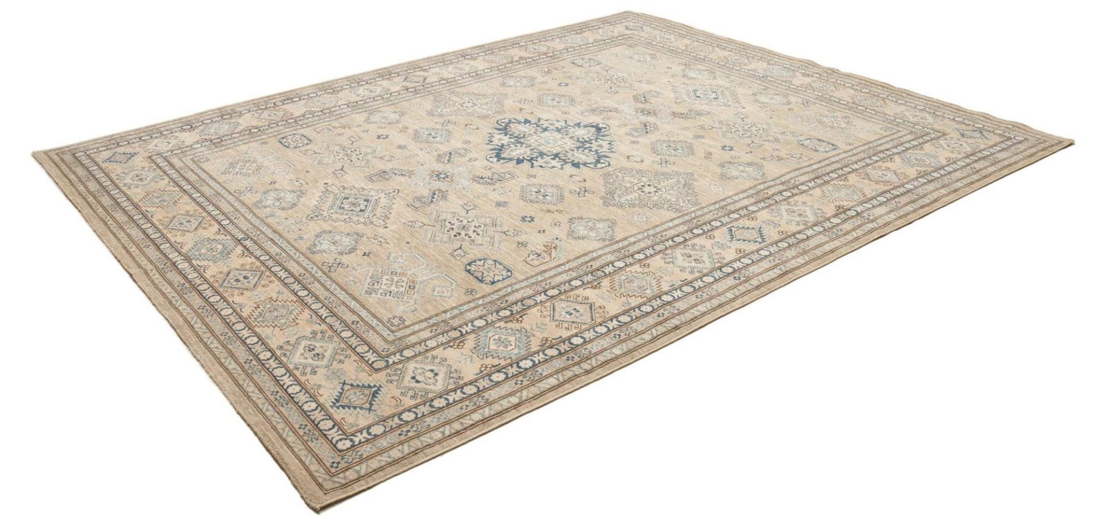 Der Kazak Teppich zeichnet sich durch die Verwendung hochwertiger Materialien aus, die nicht nur für eine ansprechende Optik, sondern auch für einen langen Erhalt der Teppichqualität sorgen. Der Teppich ist aus 100% Schurwolle gefertigt, bekannt für ihre Strapazierfähigkeit und Weichheit. Diese natürliche Faser hat die Fähigkeit, Feuchtigkeit zu regulieren und sorgt dafür, dass der Teppich sowohl in kalten als auch in warmen Umgebungen angenehm bleibt.