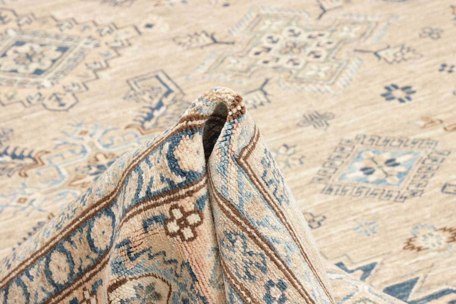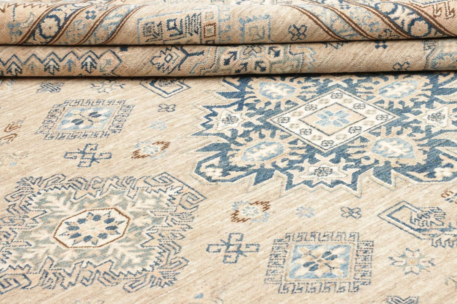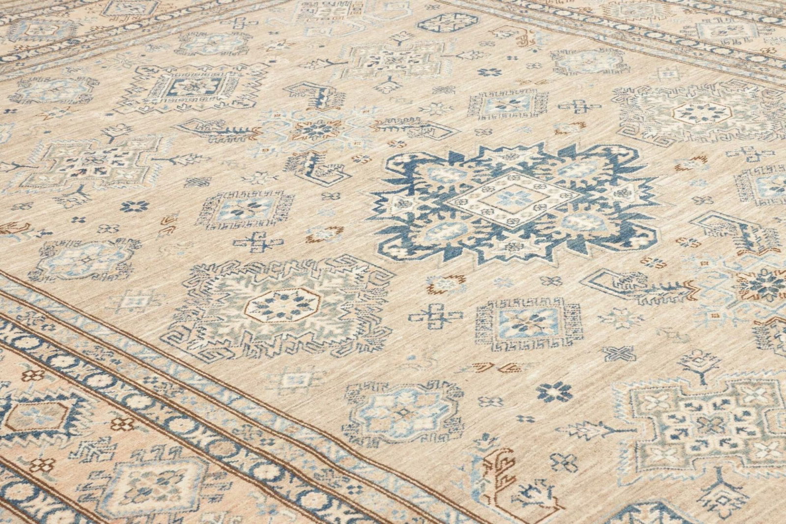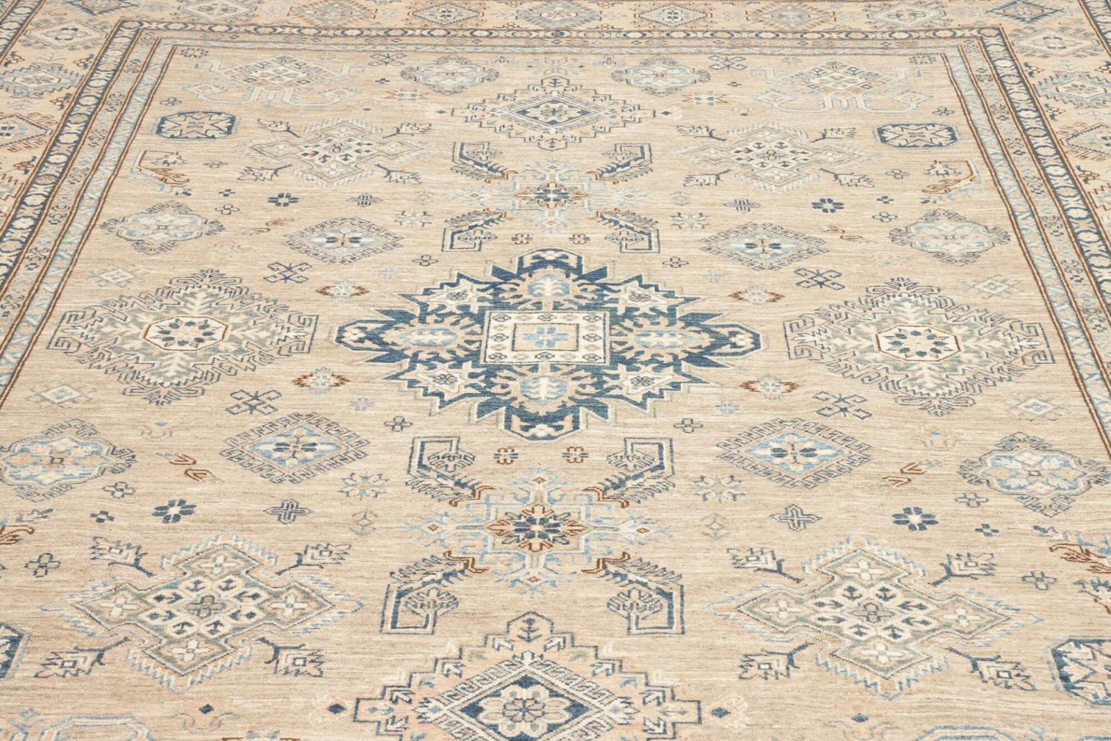 Die Knotendichte ist ein wesentliches Merkmal eines jeden handgeknüpften Teppichs. Ein höherer Knotendichte gewährleistet nicht nur die Langlebigkeit des Produkts, sondern auch eine detailreiche Darstellung des Musters. Bei diesem Kazak Teppich wurden Tausende von Knoten pro Quadratmeter verwendet, was zu einem eindrucksvollen und robusten Resultat führt.