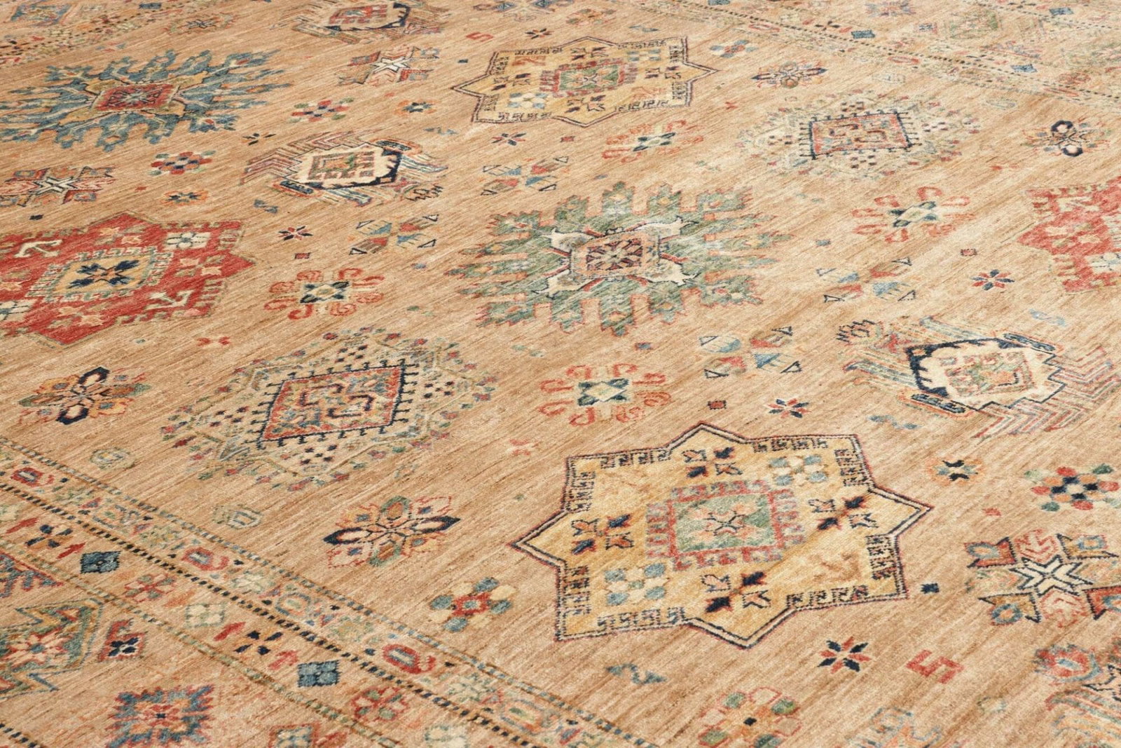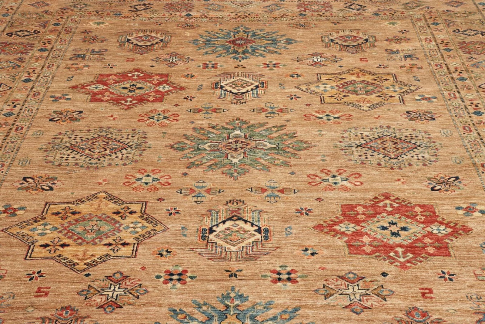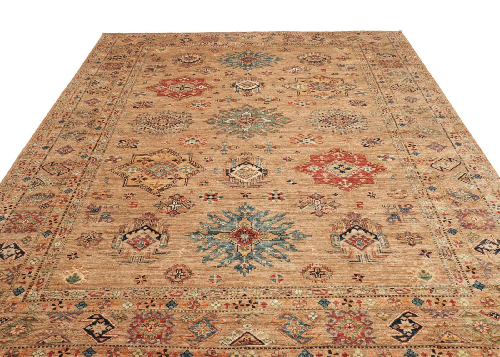 Kazak Teppich | Knotendichte: ca. 200.000 Knoten/m² | Muster: Geometrische Figuren | Größe: 252 x 315 cm | Material: 100% Schurwolle im Flor, 100% Baumwolle in der Kette | Zustand: Handgeknüpfte Qualität | Ursprung: Pakistan