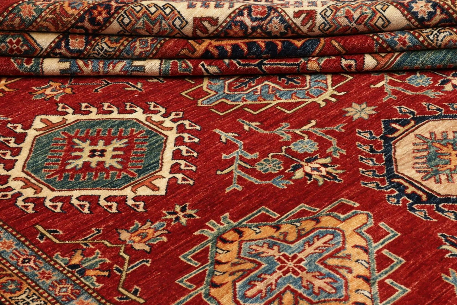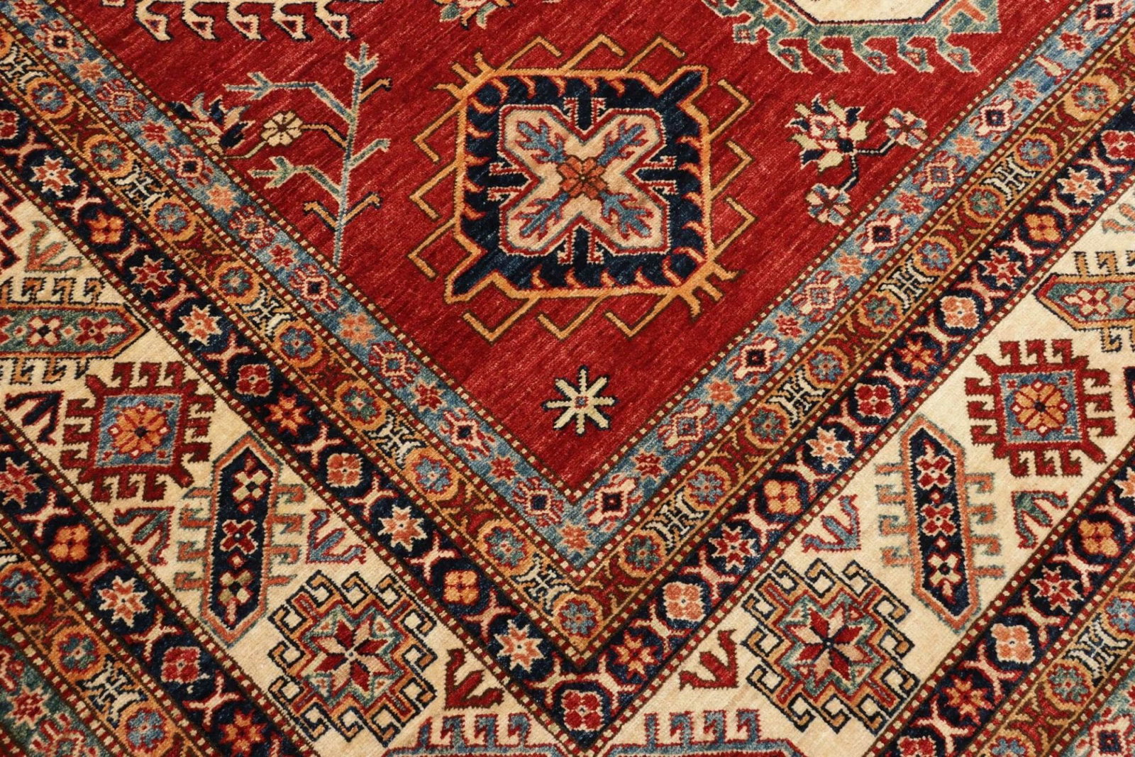 Ein handgeknüpfter Kazak Teppich ist nicht nur ein Blickfang, sondern bringt auch zahlreiche Vorteile mit sich. Durch seine dichte Knüpfung ist er besonders robust, was ihn ideal für stark frequentierte Räume macht. Zudem sorgt die Verwendung von Wolle für eine natürliche Wärmeisolierung und Schallschutz, was diesen Teppich zu einer eleganten und gleichzeitig praktischen Wahl für Ihr Zuhause macht. Ein solcher Teppich ist nicht einfach nur ein Wohnaccessoire, sondern ein Stück Geschichte und Tradition, das in Ihren Raum eine ganz besondere Atmosphäre bringt.
