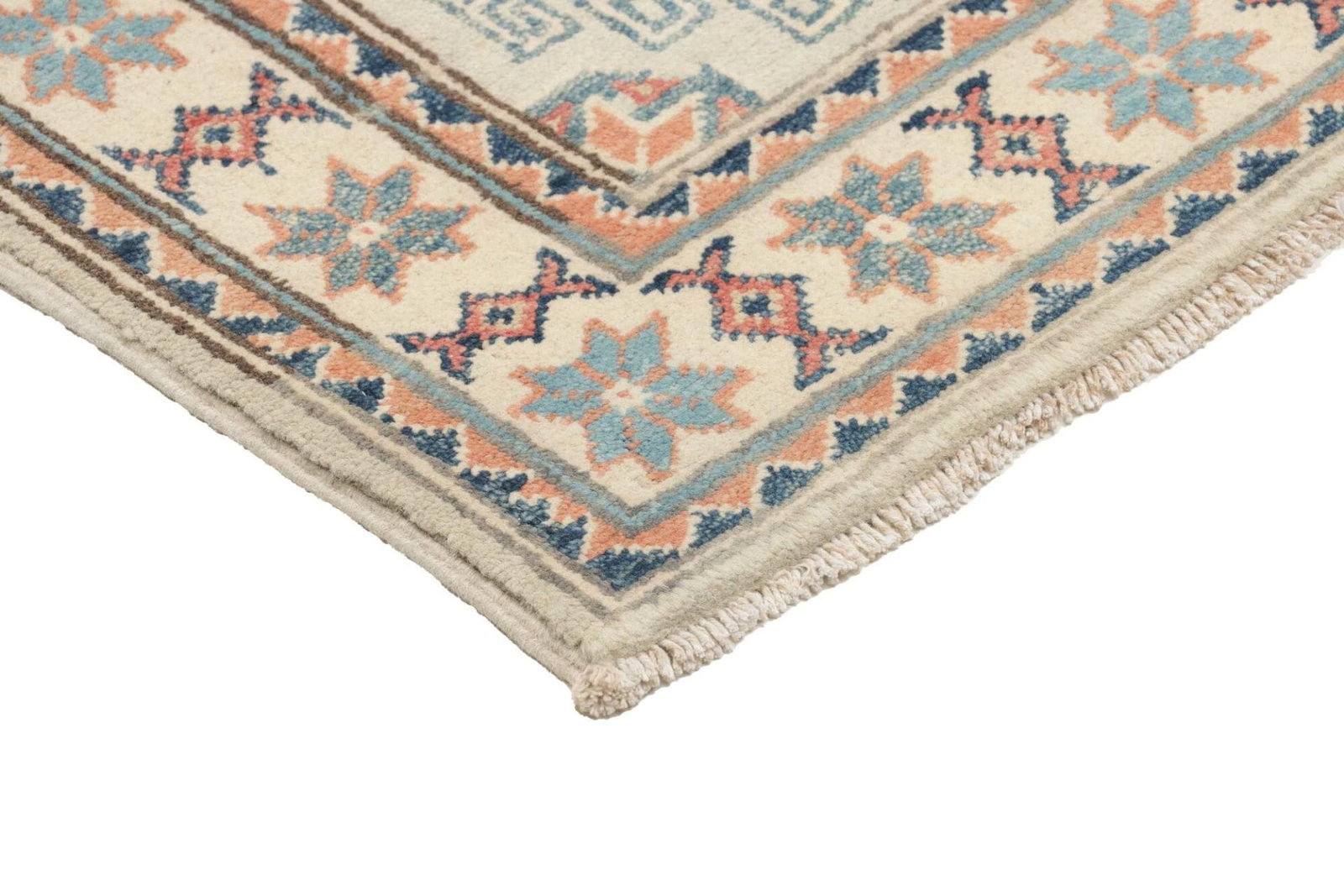 Der Kazak Teppich wird aus feiner Wolle gefertigt, die nicht nur als Grundlage für die ansprechenden Farben und Muster dient, sondern auch eine angenehme Oberflächenstruktur bietet. Die handgeknüpfte Technik garantiert eine hohe Knotendichte, die für die Robustheit und den Widerstand gegen Abnutzung sorgt. Dies macht den Teppich ideal für stark frequentierte Bereiche, während er gleichzeitig eine gemütliche Atmosphäre schafft.
