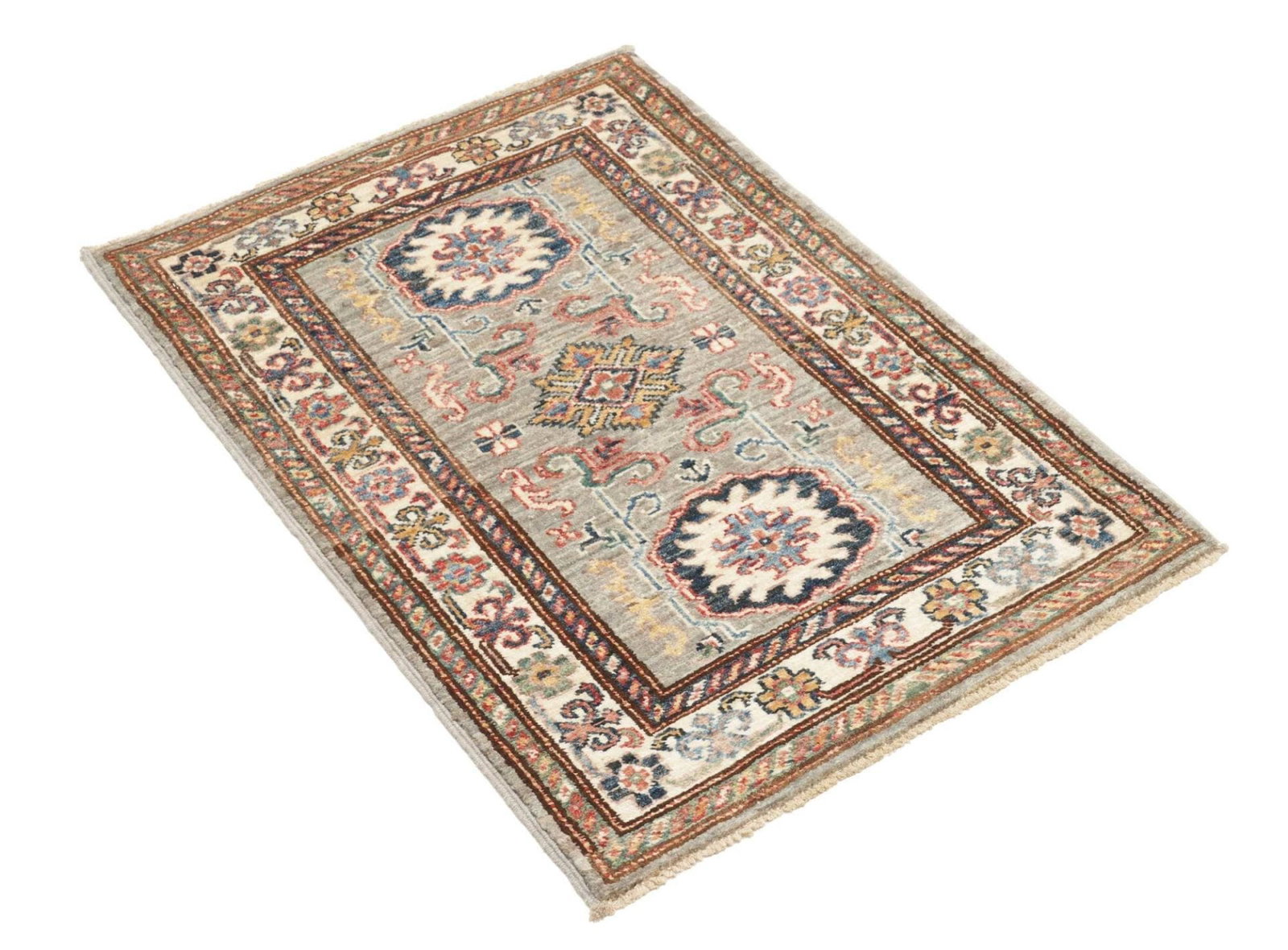 Kazak Teppich | Knotendichte: ca. 200.000 Knoten/m² | Material: 100% Schurwolle und 100% Baumwolle | Größe: 64 x 88 cm | Herkunft: Pakistan | Zustand: Handgeknüpft und von hoher Qualität | Muster: Geometrische Motive mit flacher Knüpfung
