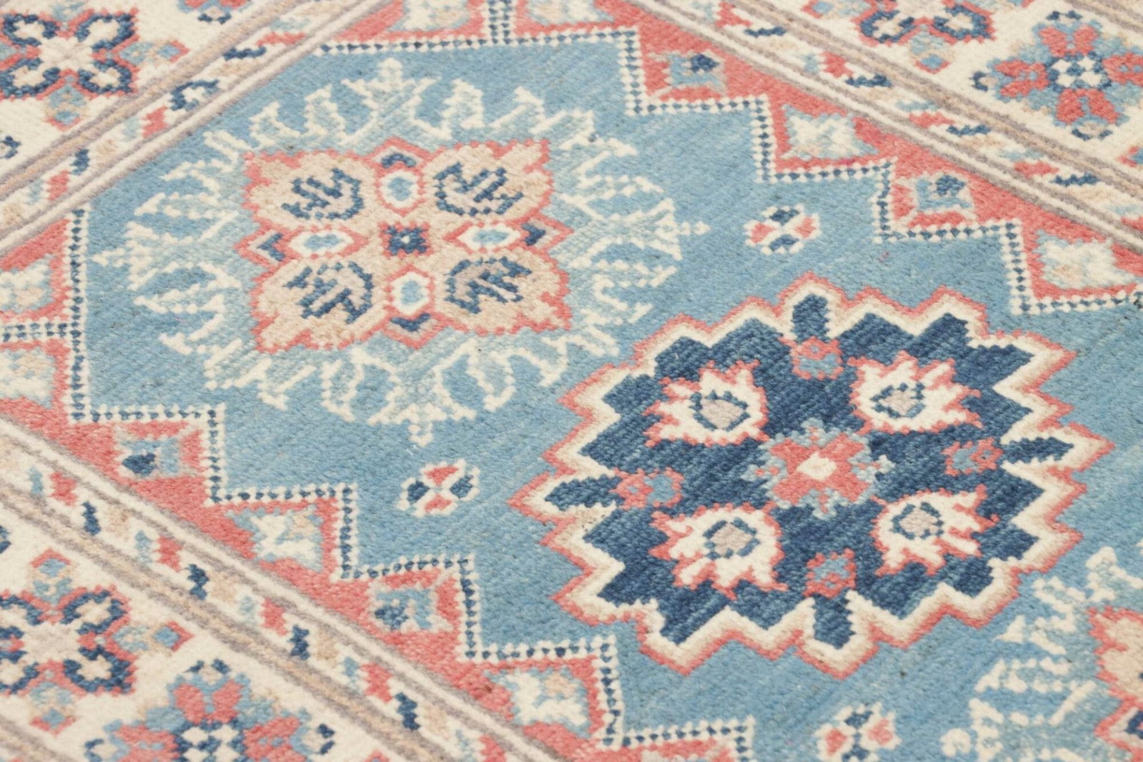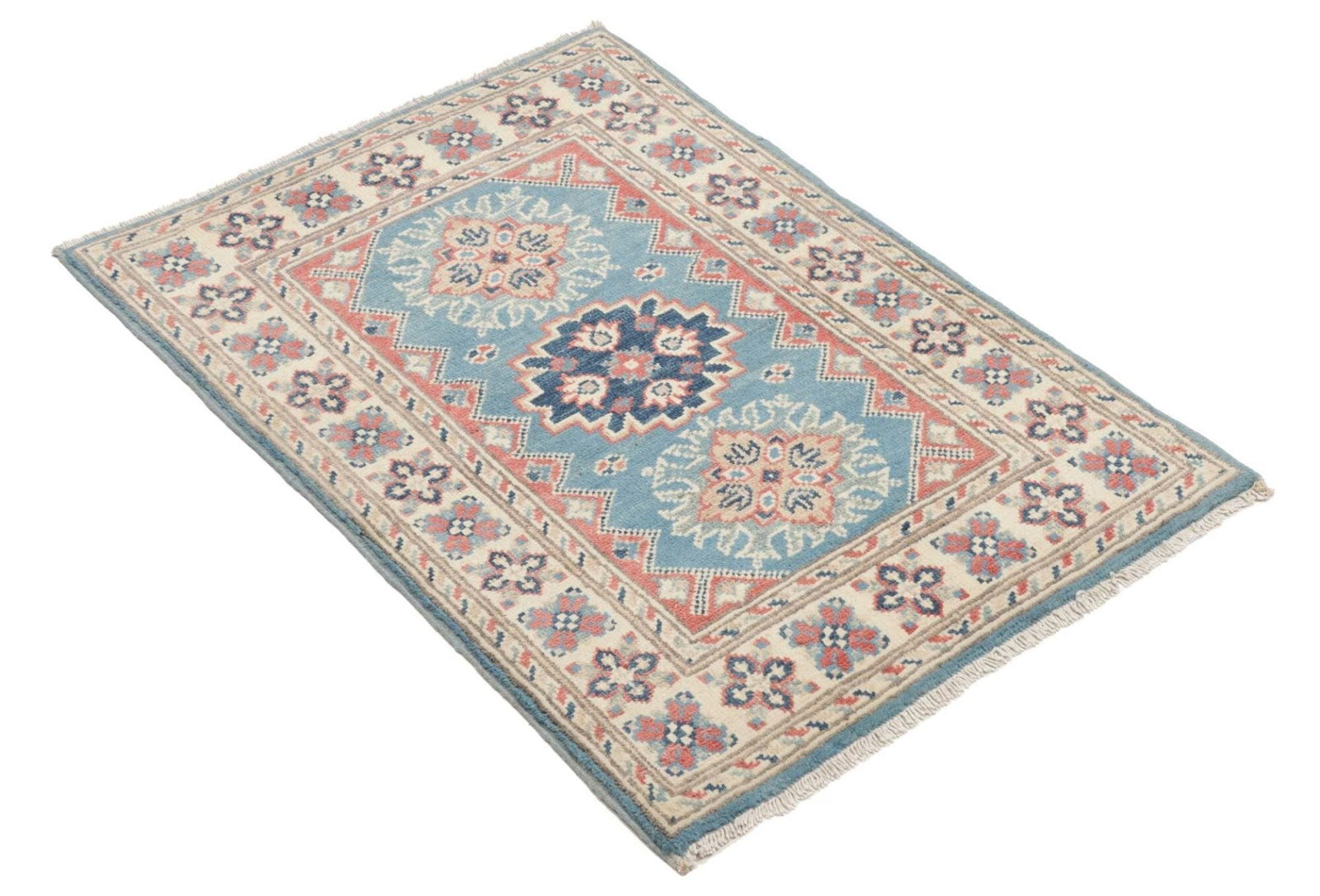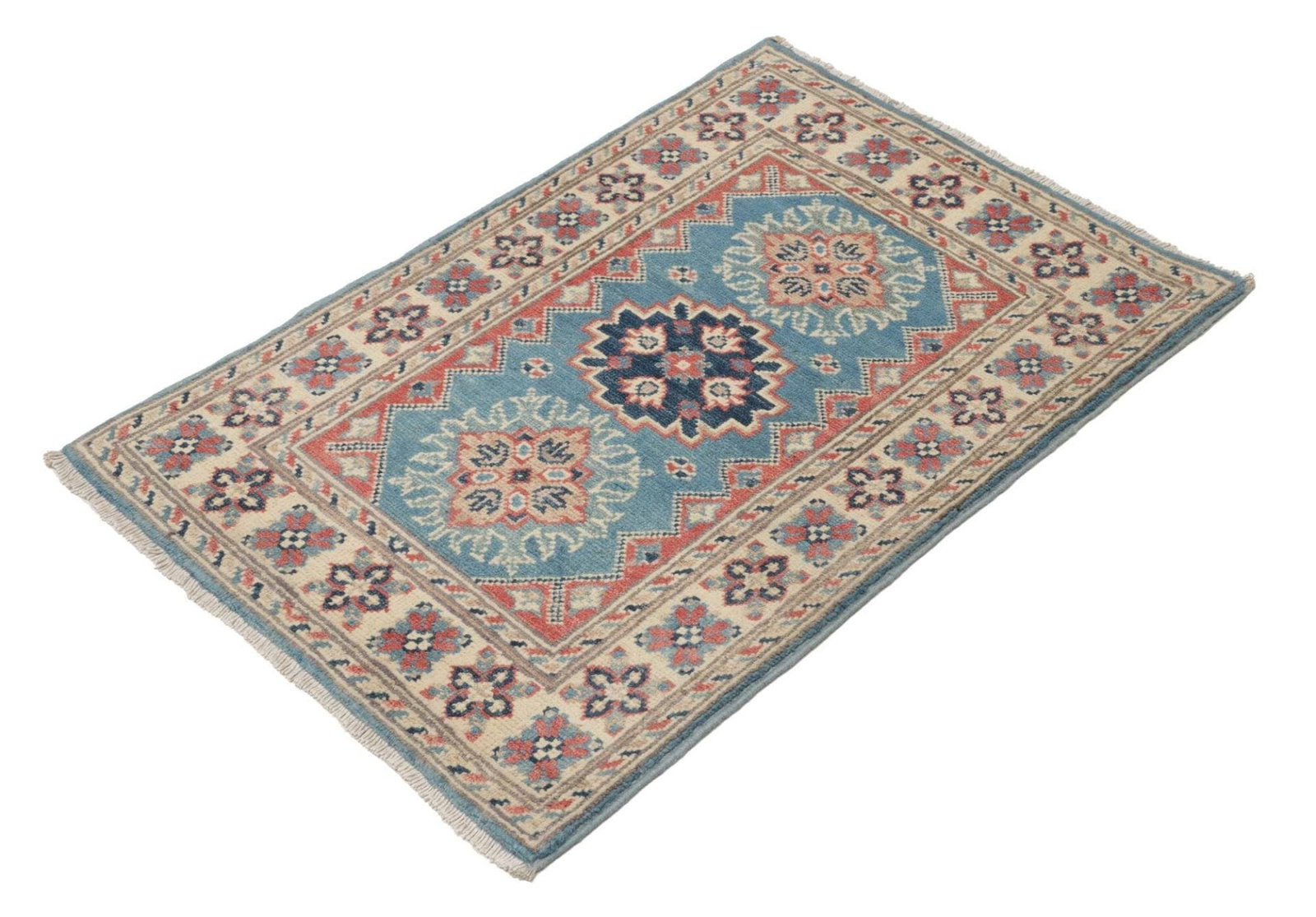 Kazak Teppich | Knotendichte: ca. 100.000 Knoten/m² | Flor: 100% Schurwolle | Kette: 100% Baumwolle | Größe: 65×90 cm | Herkunft: Pakistan | Zustand: Handgeknüpft, sehr gut erhalten