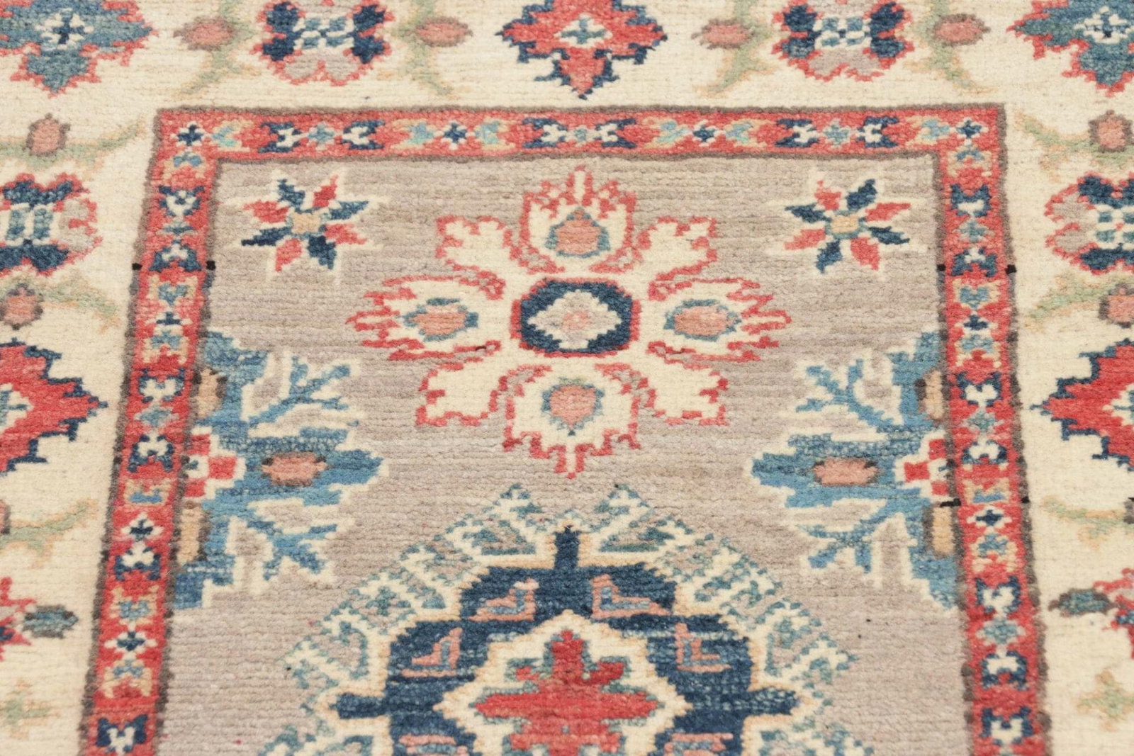 Kazak Teppich | Knotendichte: ca. 100.000 Knoten/m² | Material: 100% Schurwolle | Größe: 65 x 90 cm | Herkunft: Pakistan | Zustand: Handgeknüpft und hochwertig | Geometrische Muster für ein wohnliches Gefühl