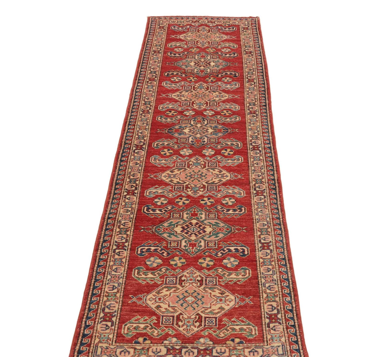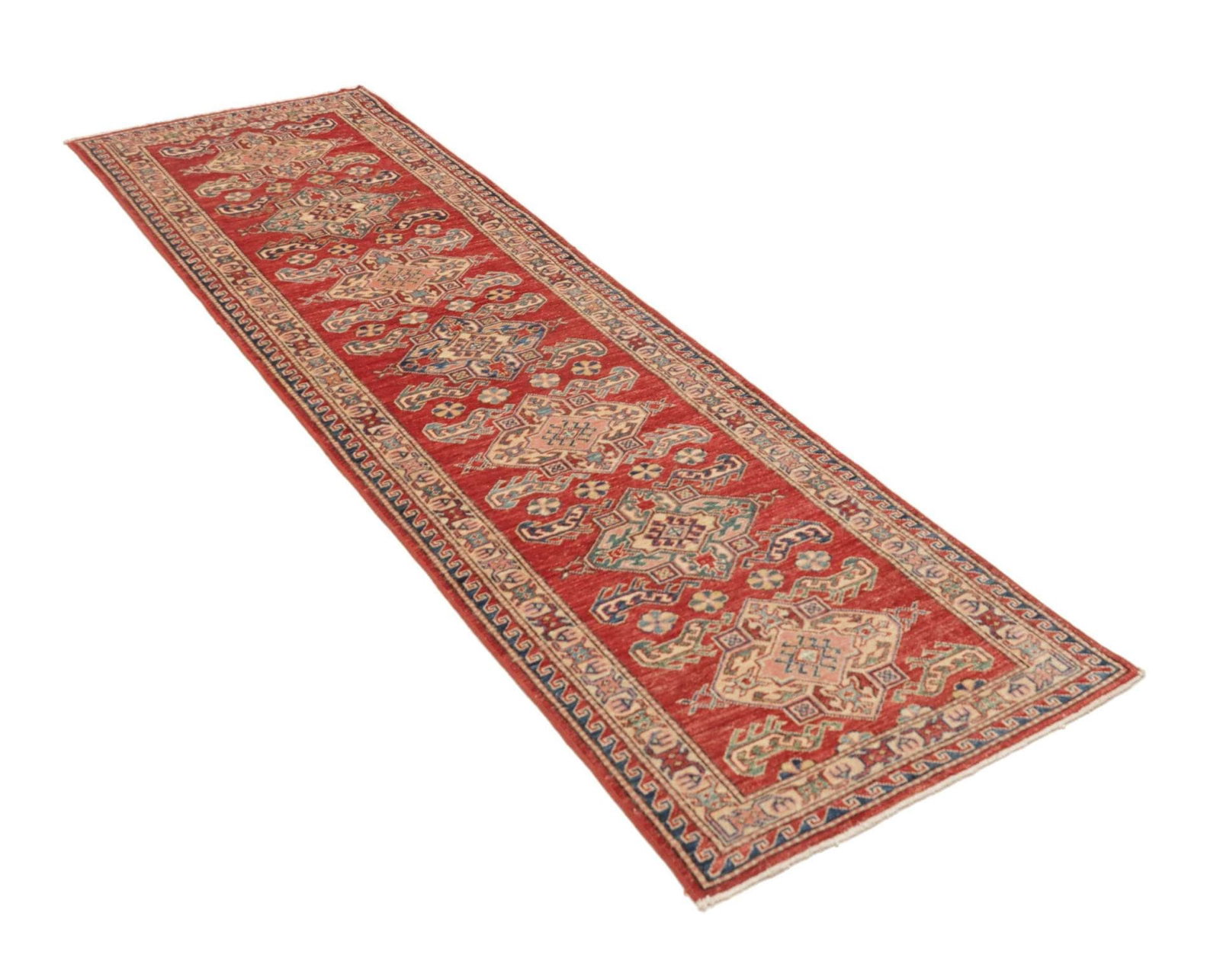 1072$Ursprünglicher Preis war: 1072$946$Aktueller Preis ist: 946$Kazak Teppich | Größe: 74 x 248 cm | Knotendichte: ca. 200.000 Knoten/m² | Flor: 100% Schurwolle | Kette: 100% Baumwolle | Herkunft: Pakistan | Zustand: Handgeknüpft, hohe Qualität | Geometrische Muster und Figuren