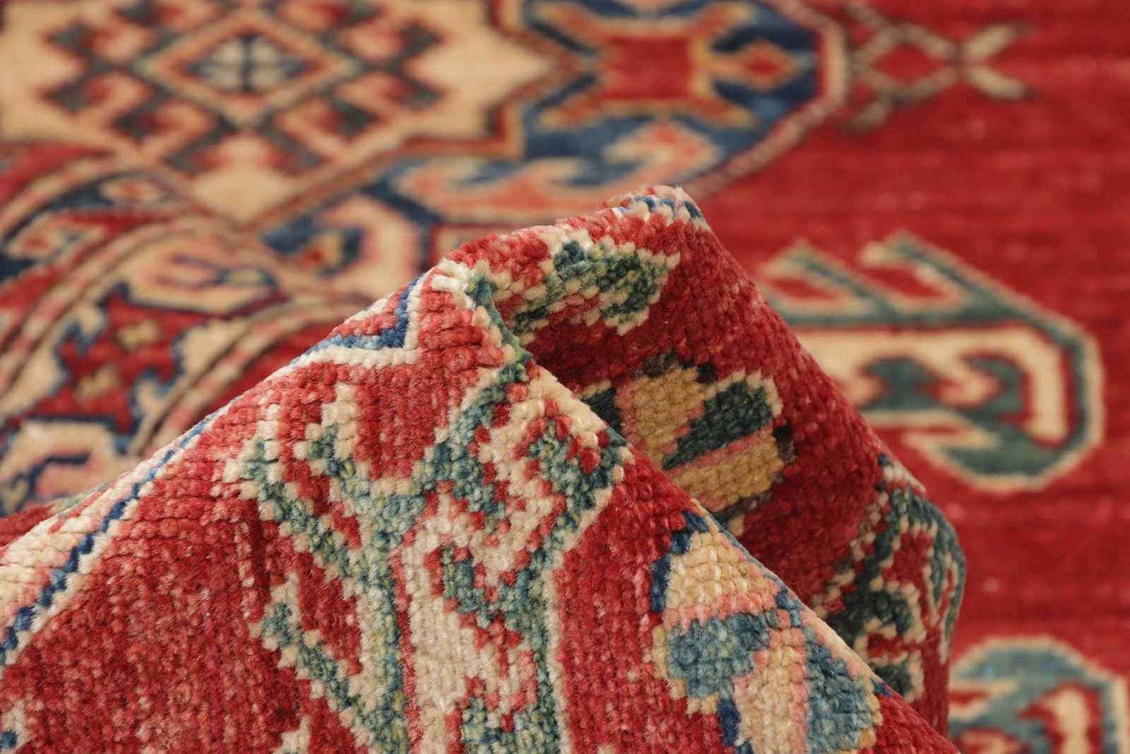 Dieser Kazak Teppich besteht aus feinster Wolle, die nicht nur für eine angenehme Haptik sorgt, sondern auch temperaturregulierende Eigenschaften aufweist. Die Knotendichte ist ein weiteres Merkmal, das die Qualität dieses Teppichs auszeichnet. Eine hohe Knotendichte gewährleistet eine detailreiche Darstellung der geometischen Muster und sorgt gleichzeitig dafür, dass der Teppich eine robuste Oberfläche besitzt, die den täglichen Anforderungen gerecht wird. Jedes Stück wird von erfahrenen Kunsthandwerkern in traditioneller Technik handgeknüpft, was ihm nicht nur eine individuelle Note verleiht, sondern auch die Authentizität und die Tradition des Kunsthandwerks bewahrt.