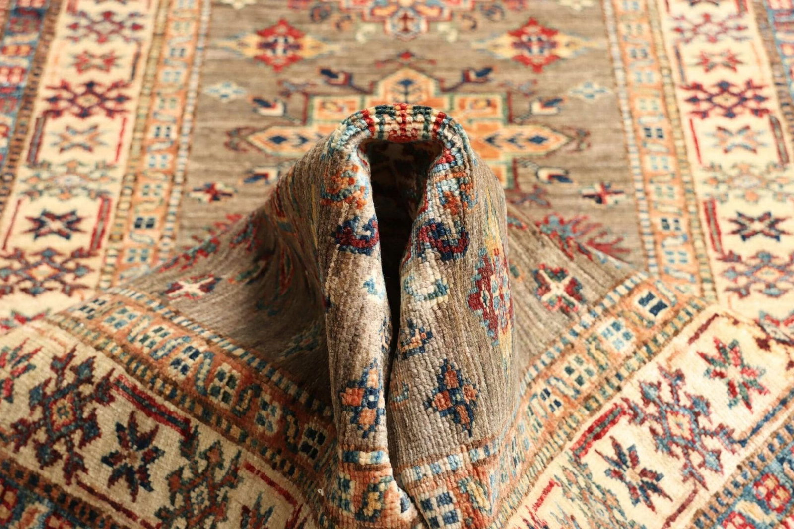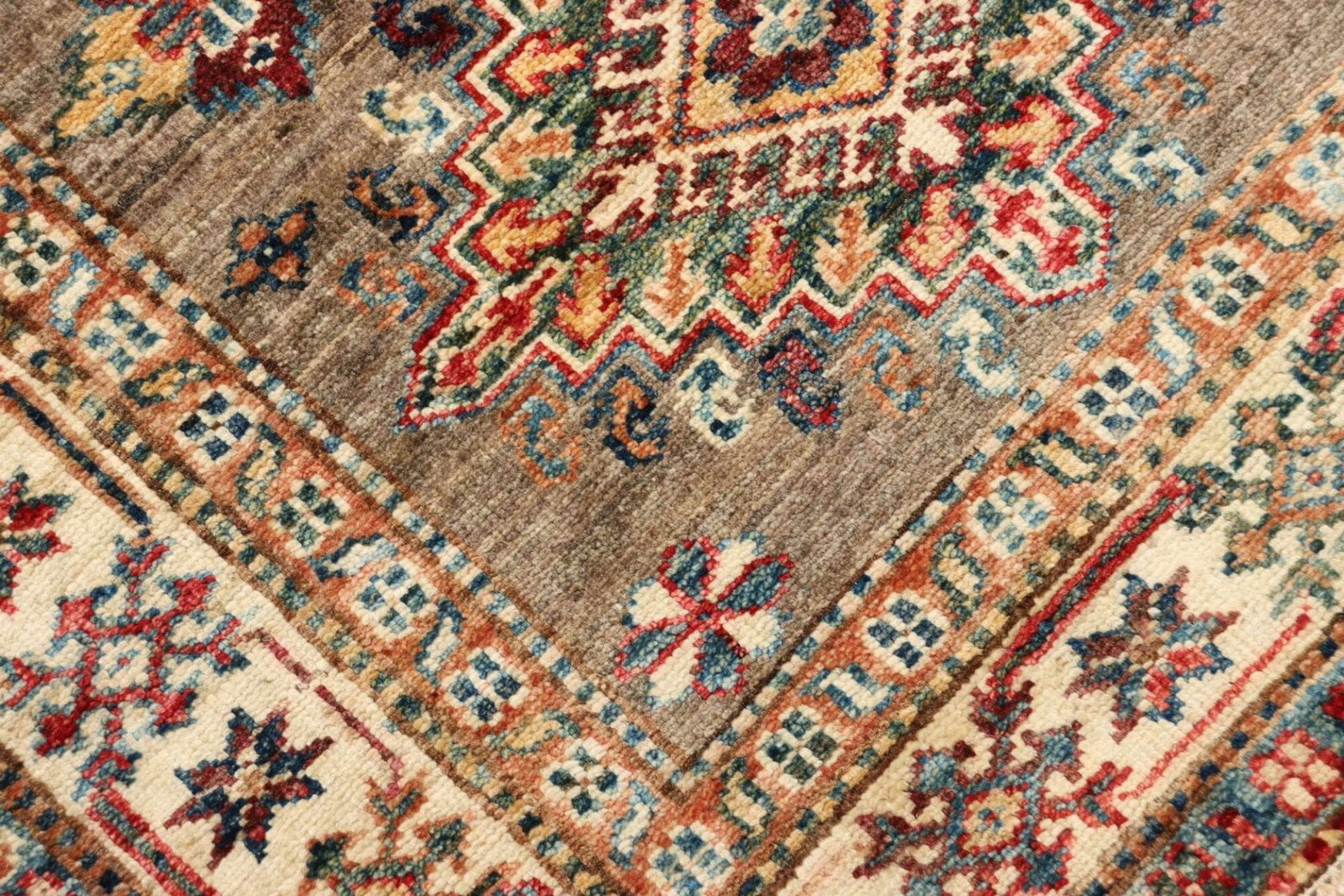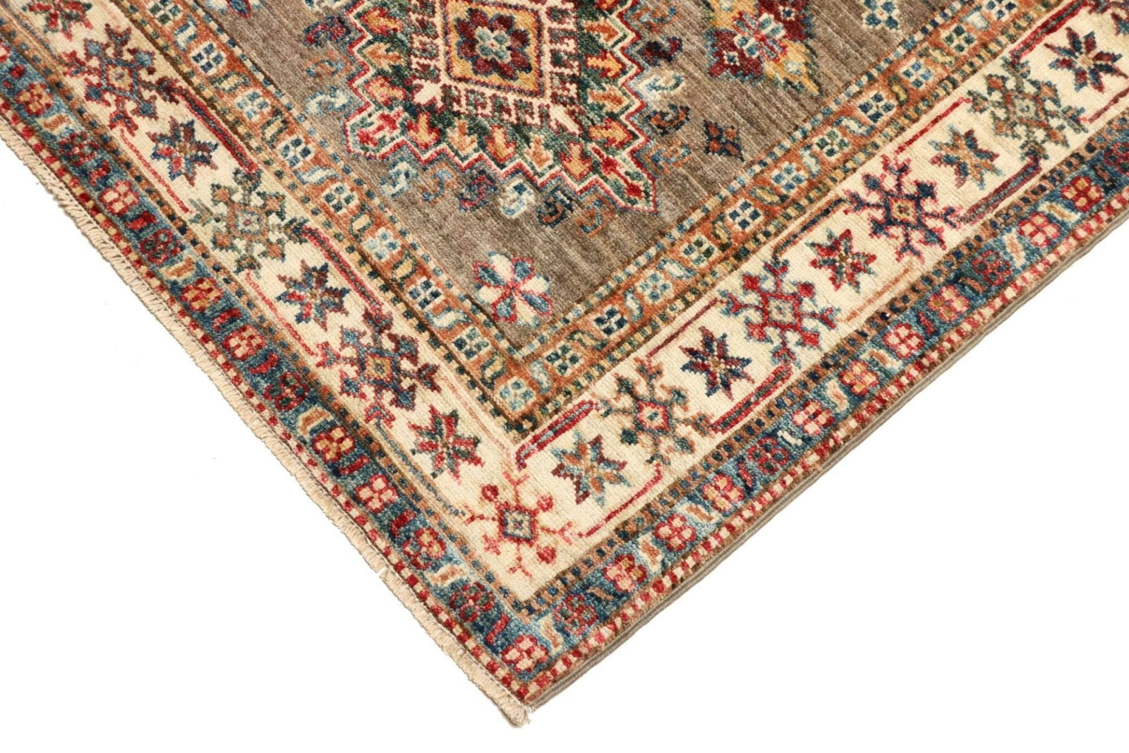 Der Kazak Teppich wird ausschließlich aus erstklassigen Materialien gefertigt, die eine besondere Weichheit und Robustheit garantieren. Für die Herstellung werden natürliche Wollen eingesetzt, die nicht nur eine bemerkenswerte Langlebigkeit aufweisen, sondern auch eine angenehme Haptik bieten. Die handgeknüpfte Technik ermöglicht dabei eine hohe Knotendichte, was nicht nur die Strapazierfähigkeit des Teppichs erhöht, sondern auch seine einzigartigen Designs in herausragender Qualität hervorhebt.